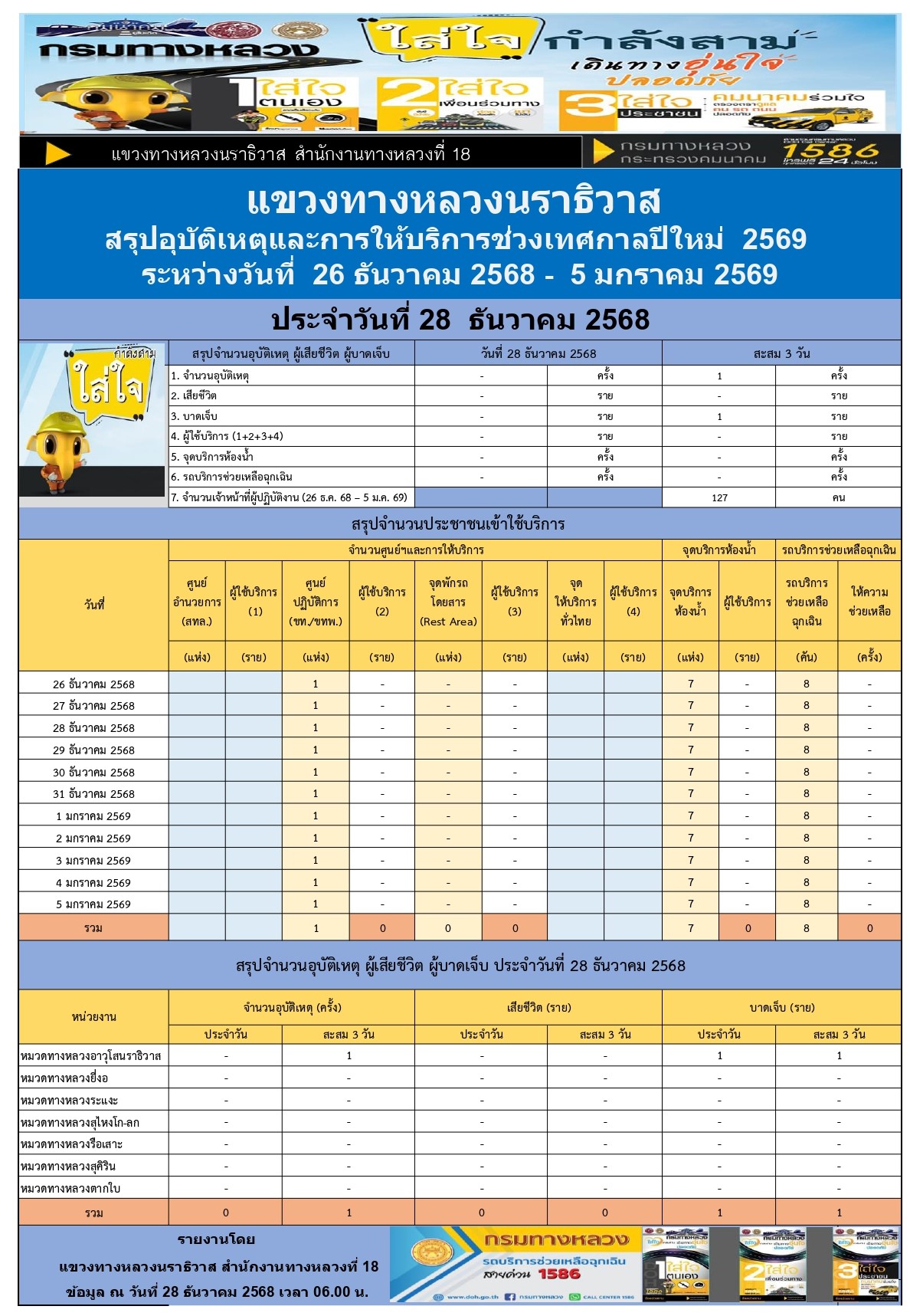 สรุปรายงานอุบัติเหตุและการให้บริการช่วงเทศกาลปีใหม่ 2569 ประจำวันที่ 28 ธันวาคม 2568