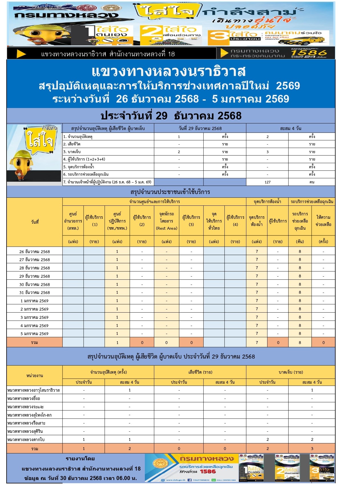 สรุปรายงานอุบัติเหตุและการให้บริการช่วงเทศกาลปีใหม่ 2569 ประจำวันที่ 30 ธันวาคม 2568