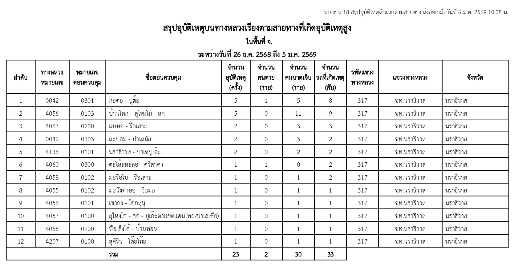 สรุปรายงานอุบัติเหตุและการให้บริการช่วงเทศกาลปีใหม่ 2569 ประจำวันที่ 5 มกราคม 2569