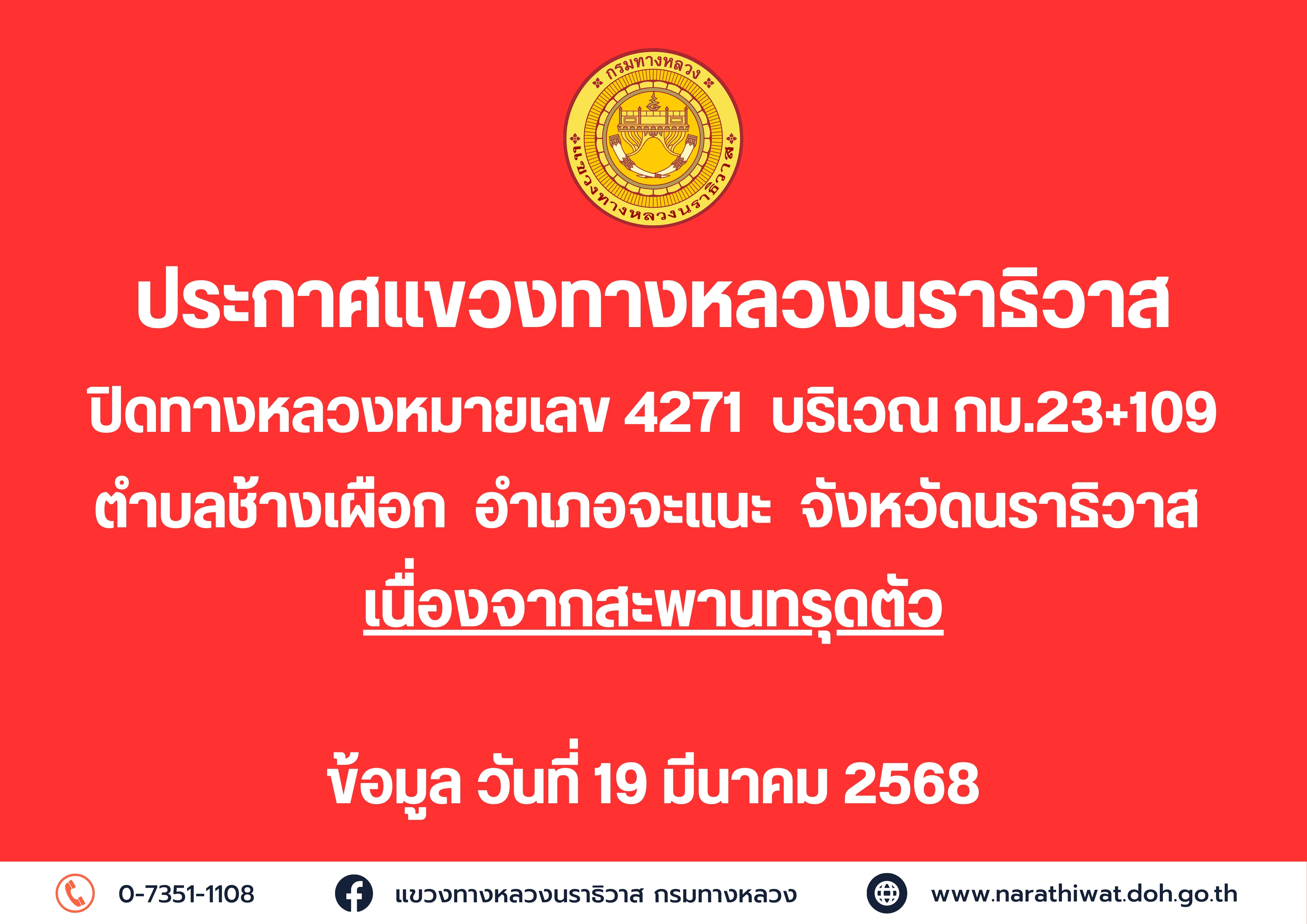 ประกาศแขวงทางหลวงนราธิวาส ปิดทางหลวงหมายเลข 4271 เนื่องจากสะพานทรุดตัว