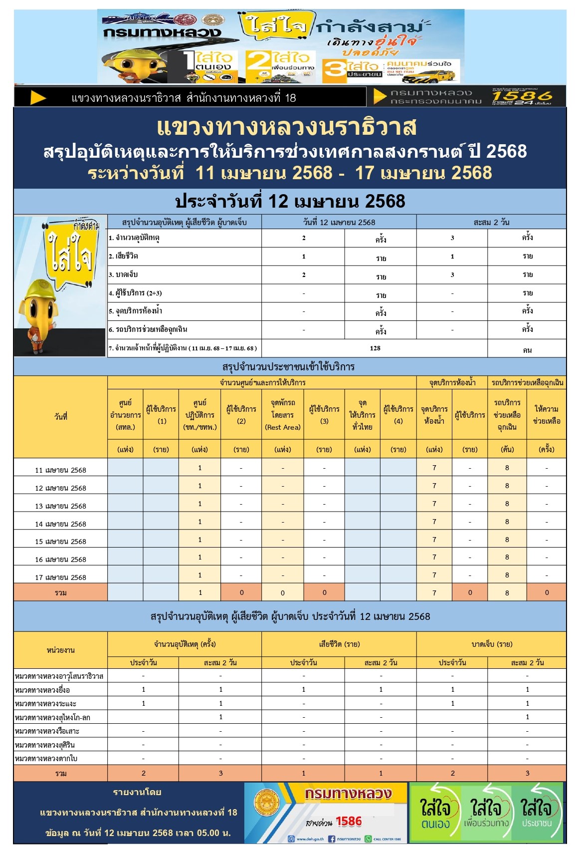 สรุปรายงานอุบัติเหตุและการให้บริการช่วงเทศกาลสงกรานต์ ปี 2568 ประจำวันที่ 12 เมษายน 2568