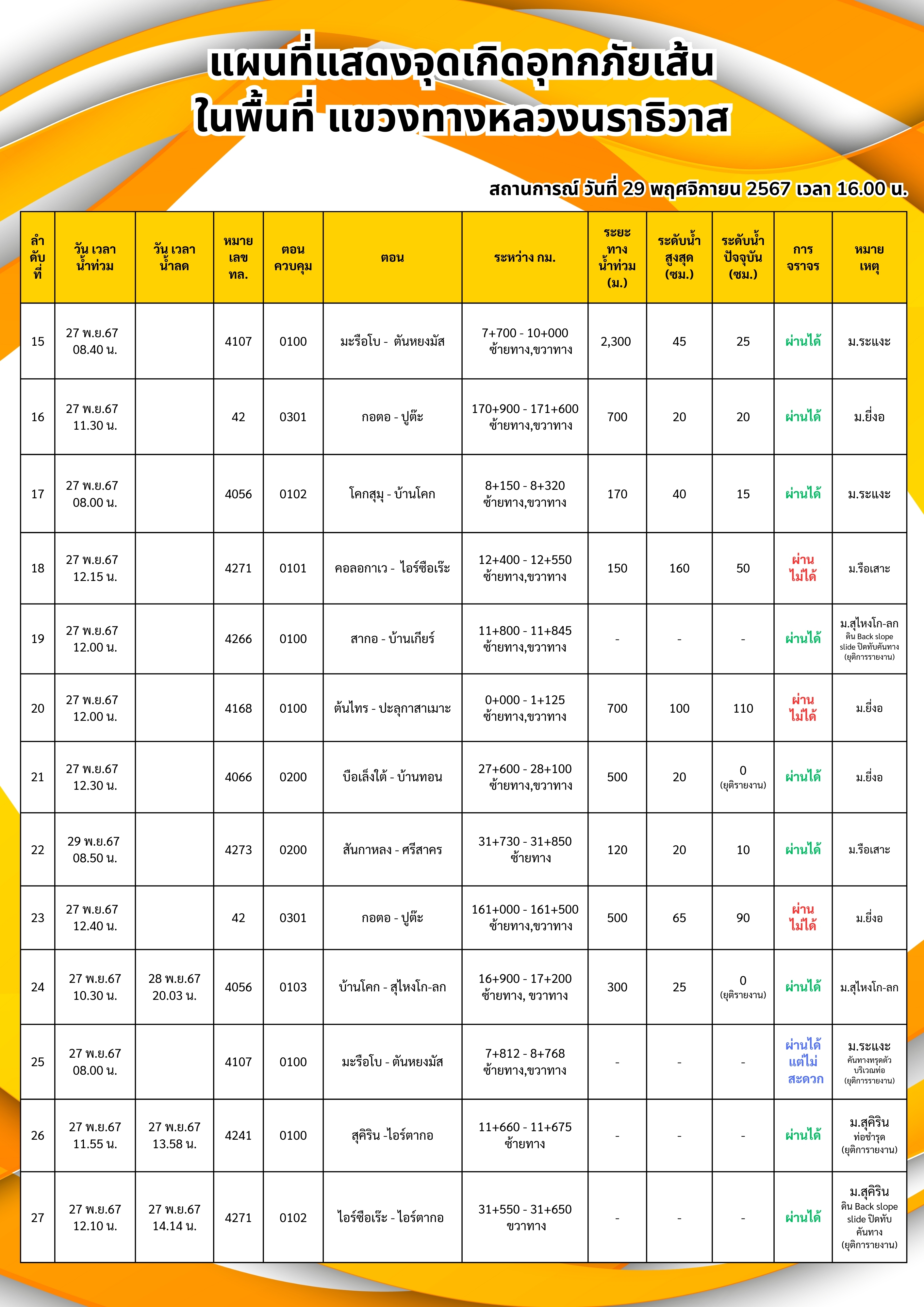 รายงานสถานการณ์อุทกภัยในพื้นที่จังหวัดนราธิวาส วันเวลาที่ update วันที่ 29 พ.ย. 67 เวลา 16.00 น.