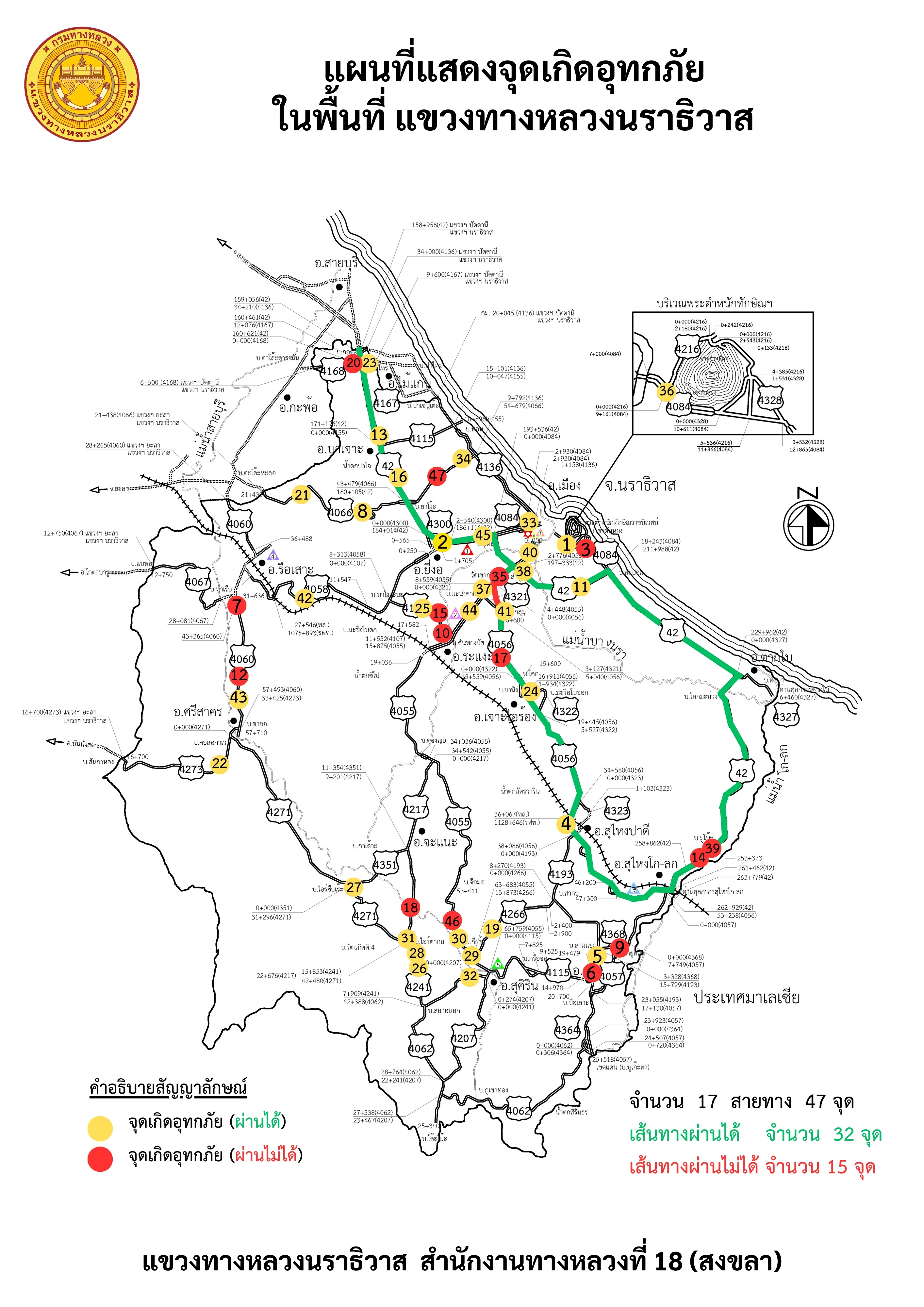 รายงานสถานการณ์อุทกภัยเส้นทางหลัก ได้แก่ ทล.42 และ ทล.4056 ในพื้นที่จังหวัดนราธิวาส วันเวลาที่ update วันที่ 27 พ.ย. 67 เวลา 20.30 น.