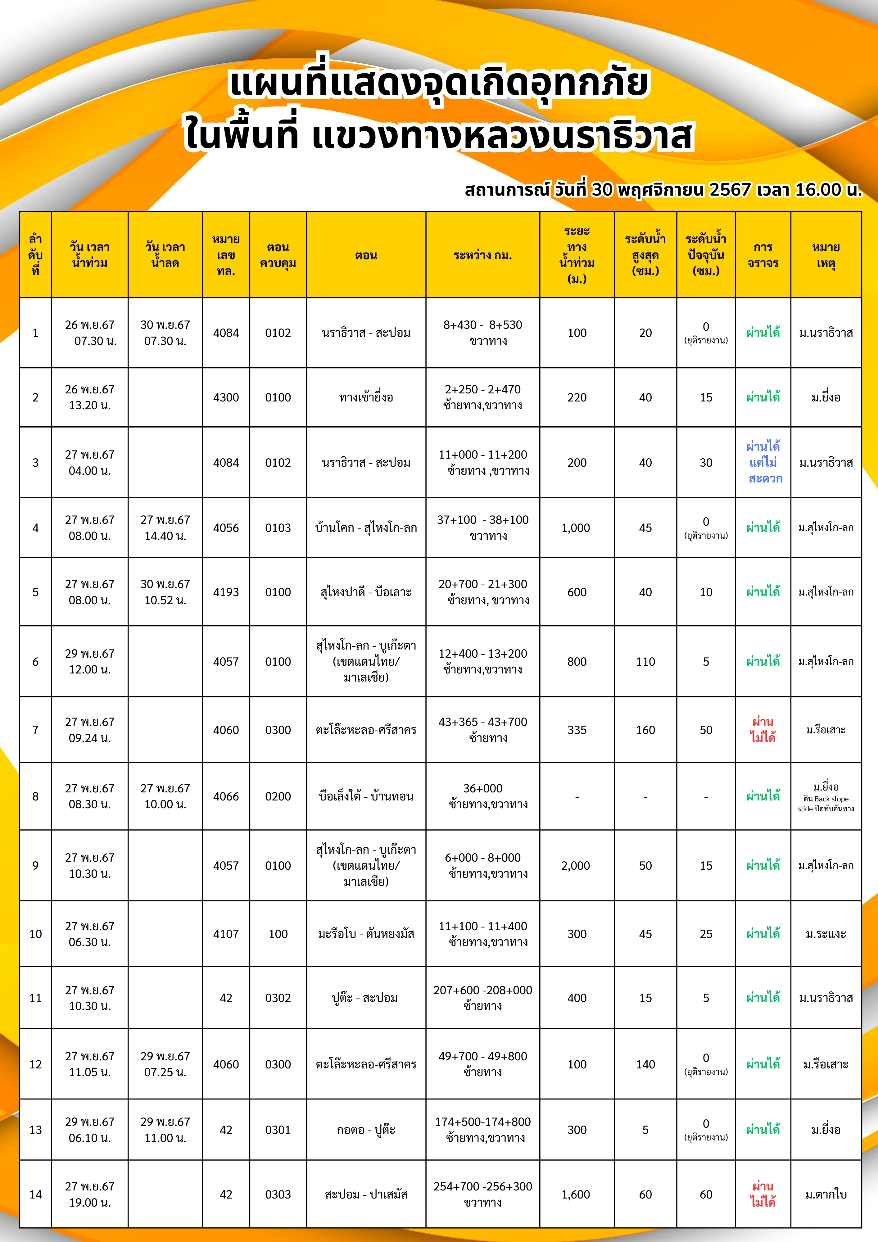 รายงานสถานการณ์อุทกภัยในพื้นที่จังหวัดนราธิวาส วันเวลาที่ update วันที่ 30 พ.ย. 67 เวลา 16.00 น.