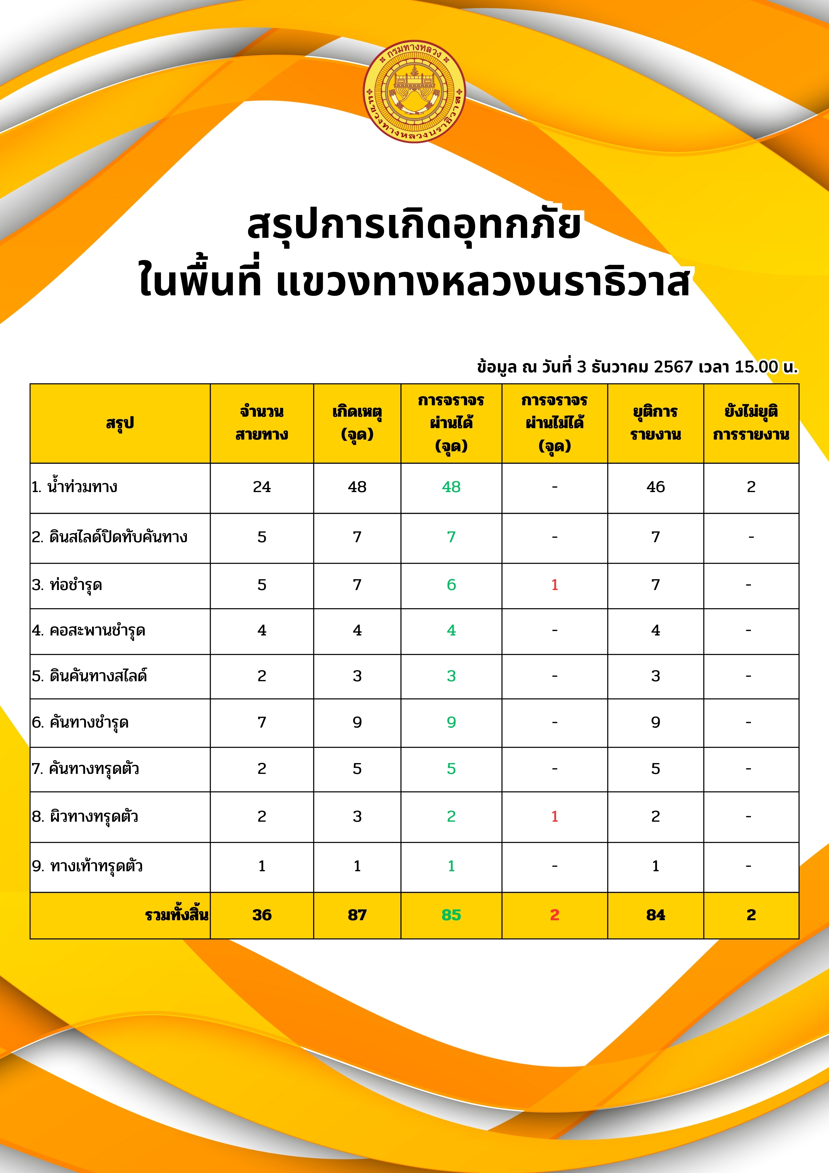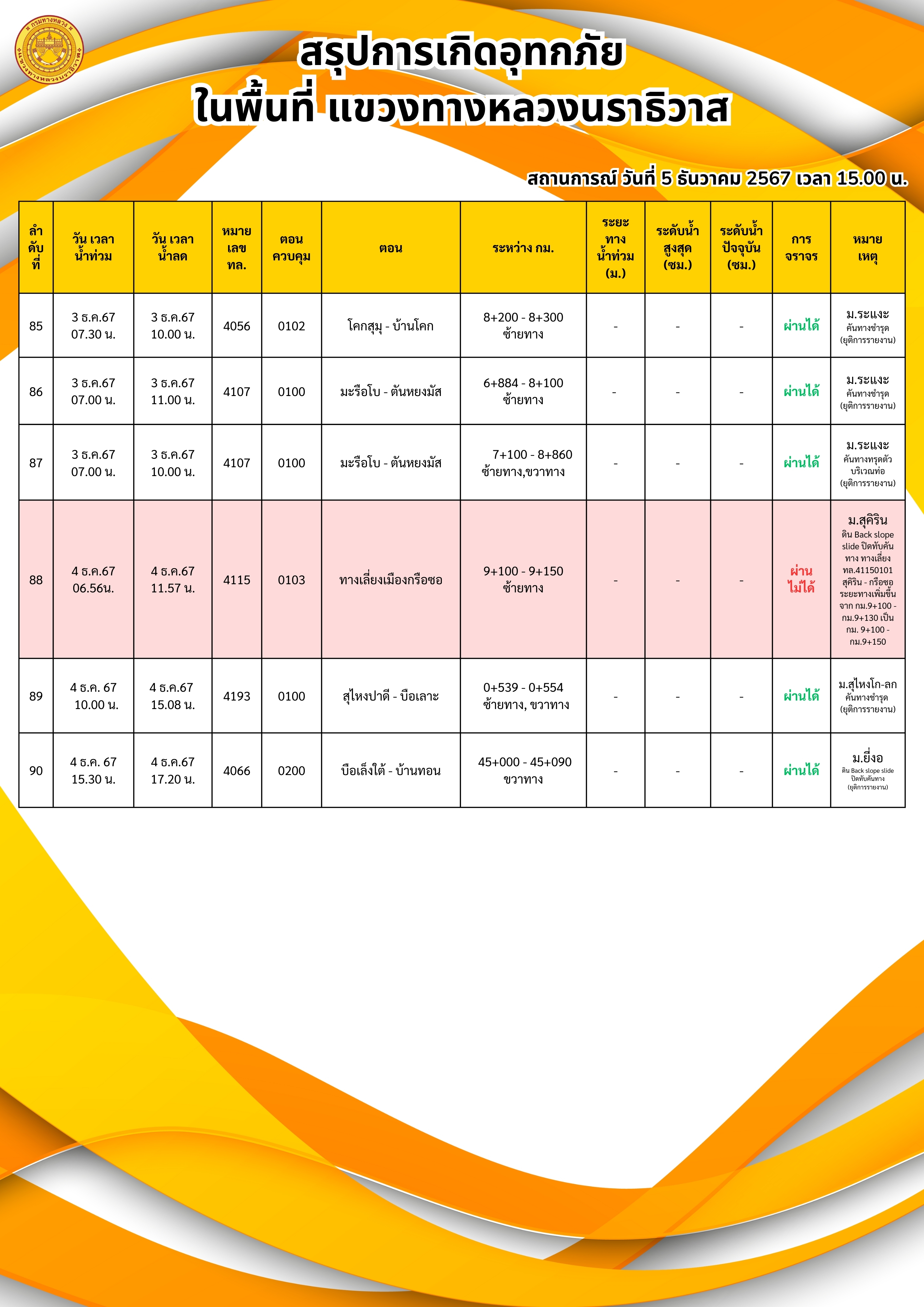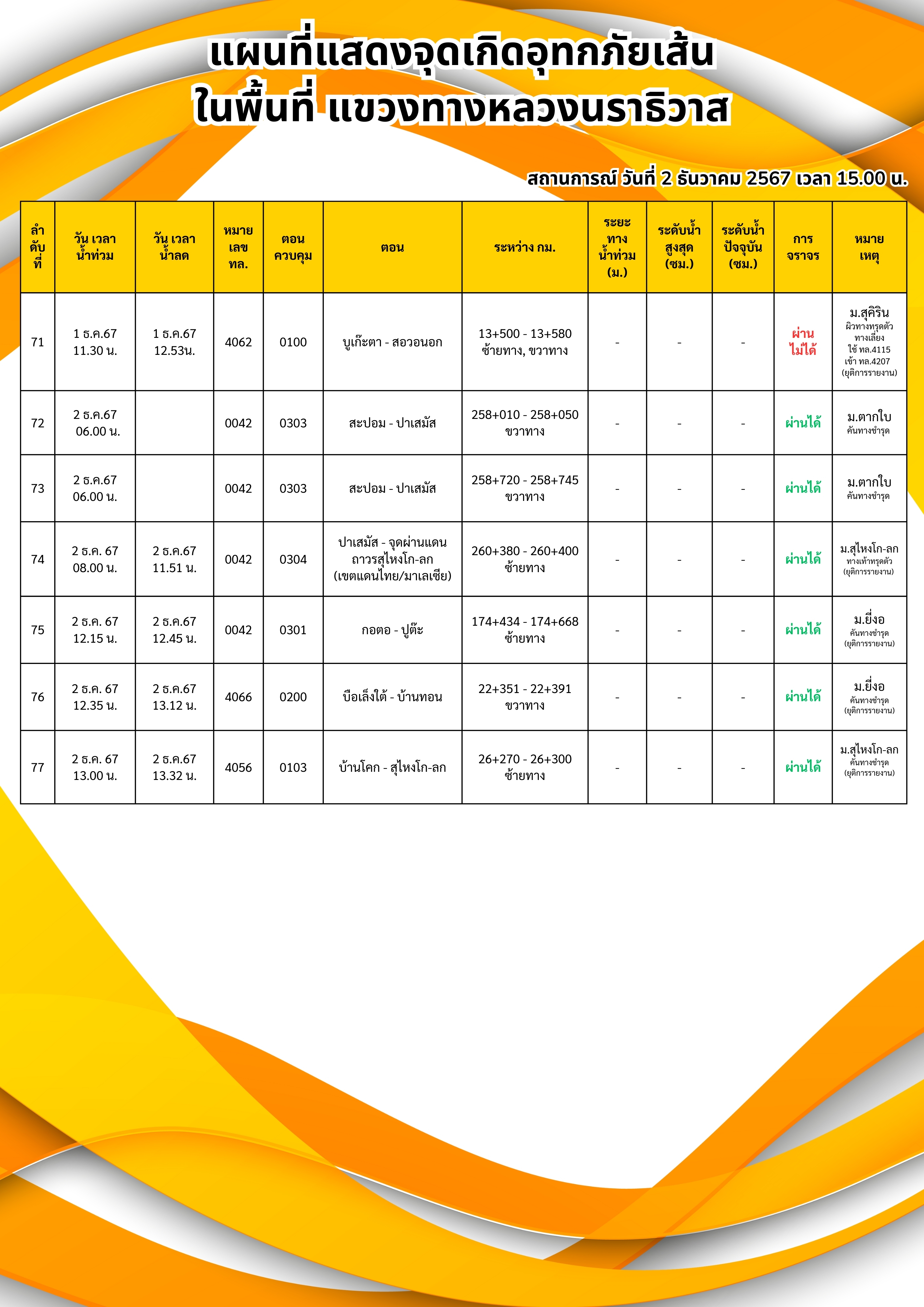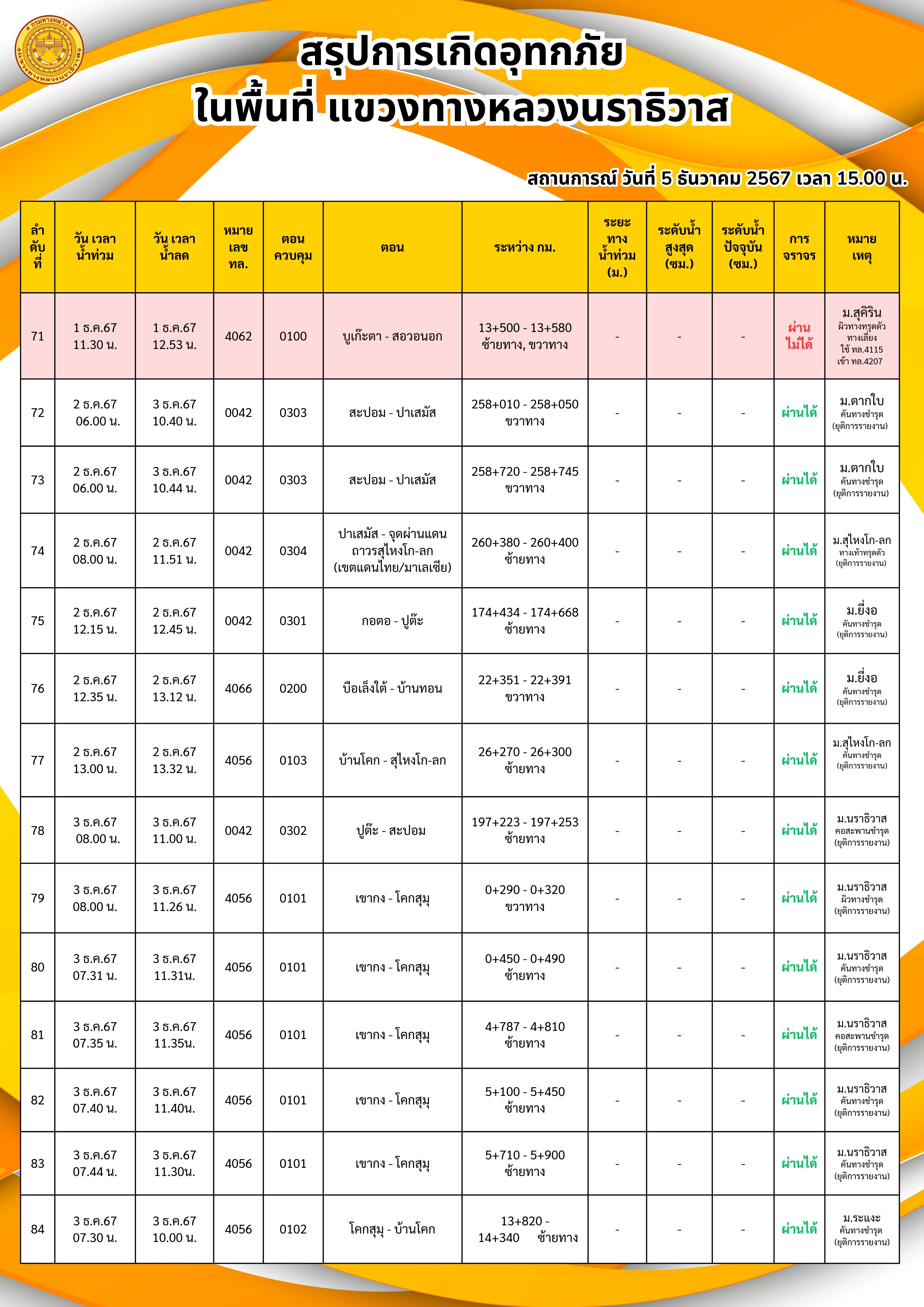 แขวงทางหลวงนราธิวาส ขอรายงานสถานการณ์อุทกภัยในพื้นที่จังหวัดนราธิวาส วันเวลาที่ update วันที่ 5 ธ.ค. 67 เวลา 20.00 น.