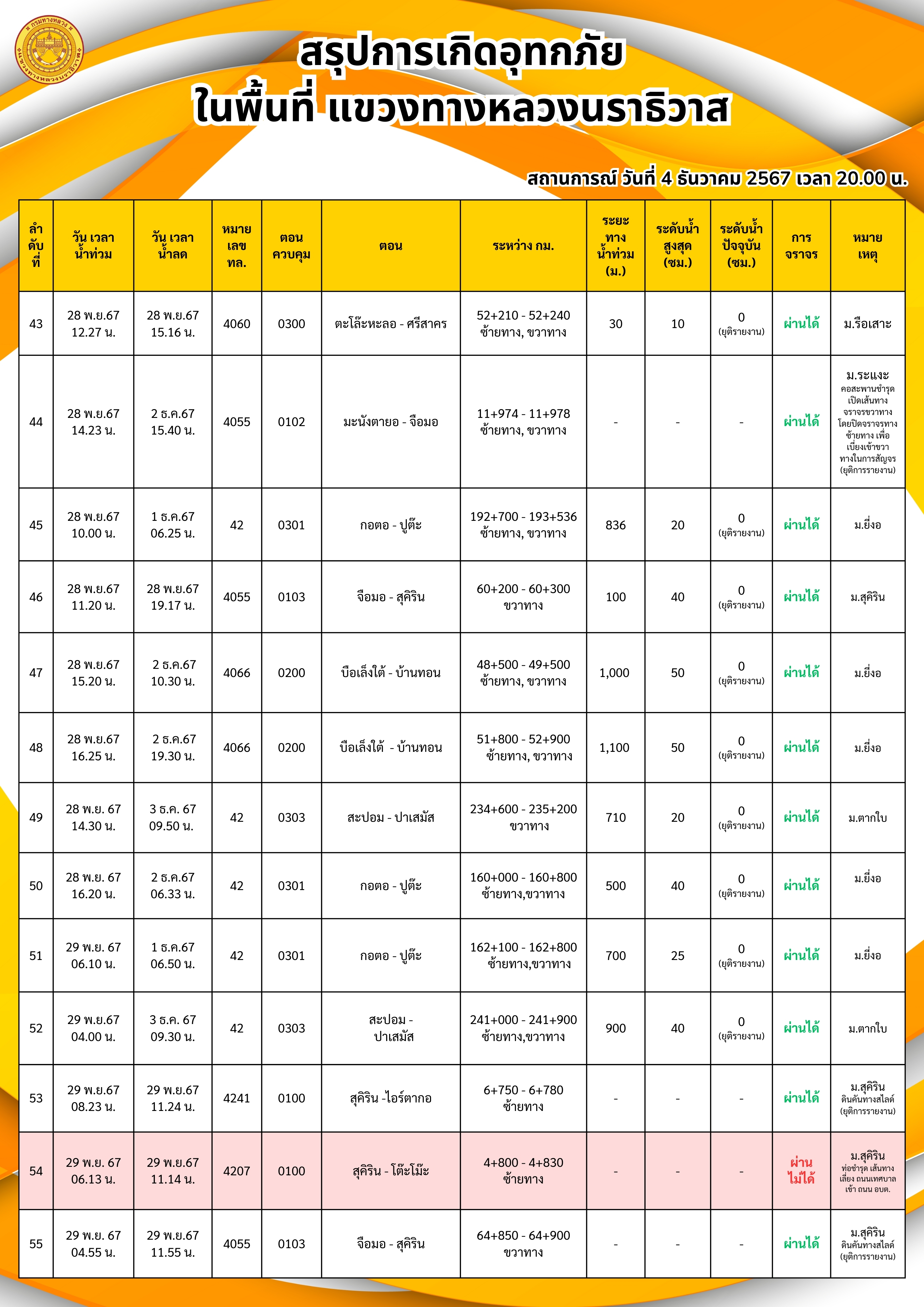 แขวงทางหลวงนราธิวาส ขอรายงานสถานการณ์อุทกภัยในพื้นที่จังหวัดนราธิวาส วันเวลาที่ update วันที่ 4 ธ.ค. 67 เวลา 20.00 น.