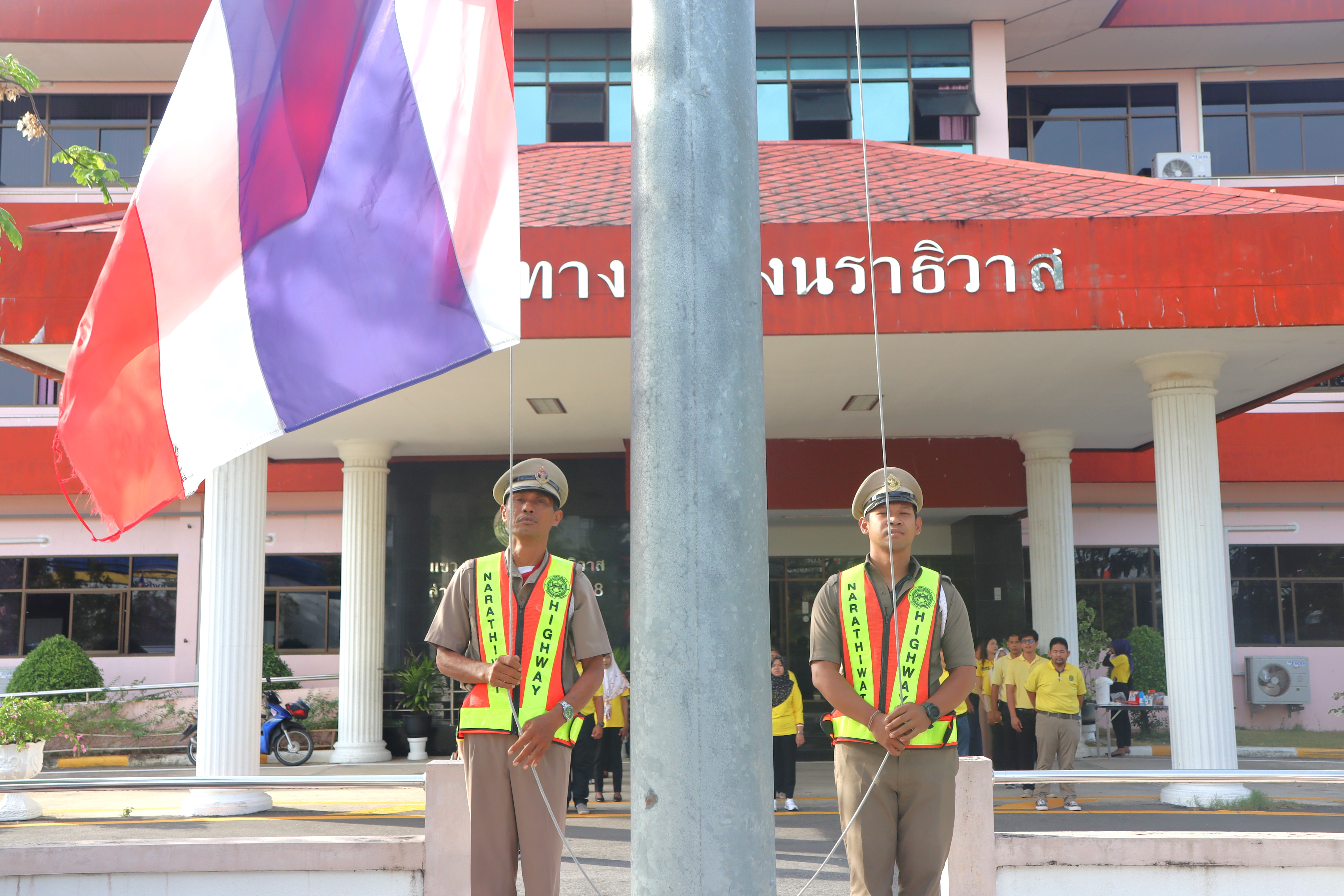 นายปฏิเวชวุฒิศักย์ สุขขี ผู้อำนวยการแขวงทางหลวงนราธิวาส มอบหมายให้รองผู้อำนวยการแขวงทางหลวงนราธิวาส ฝ่ายปฏิบัติการ ฝ่ายวิศวกรรม ผู้อำนวยการหมวดทางหลวงอาวุโสนราธิวาส นำข้าราชการ และเจ้าหน้าที่แขวงทางหลวงนราธิวาส ร่วมกิจกรรมเข้าแถวเคารพธงชาติ โดยร่วมแต่งกายด้วยเสื้อสีเหลืองเพื่อเฉลิมพระเกียรติพระบาทสมเด็จพระเจ้าอยู่หัว เนื่องในโอกาสมหามงคลเฉลิมพระชนมพรรษา 6 รอบ 28 กรกฏาคม 2567 และเพื่อเสริมสร้างจิตสำนึกต่อสถาบันชาติ ศาสนา พระมหากษัตริย์ และการเป็นข้าราชการที่ดี เพื่อแสดงออกถึงความจงรักภักดีต่อชาติ ศาสนา พระมหากษัตริย์ และเป็นการเตรียมความพร้อมในการปฏิบัติราชการอีกทั้งยังเป็นการเพิ่มประสิทธิภาพในการทำงานเสริมสร้างความรัก ความสามัคคีในองค์กร