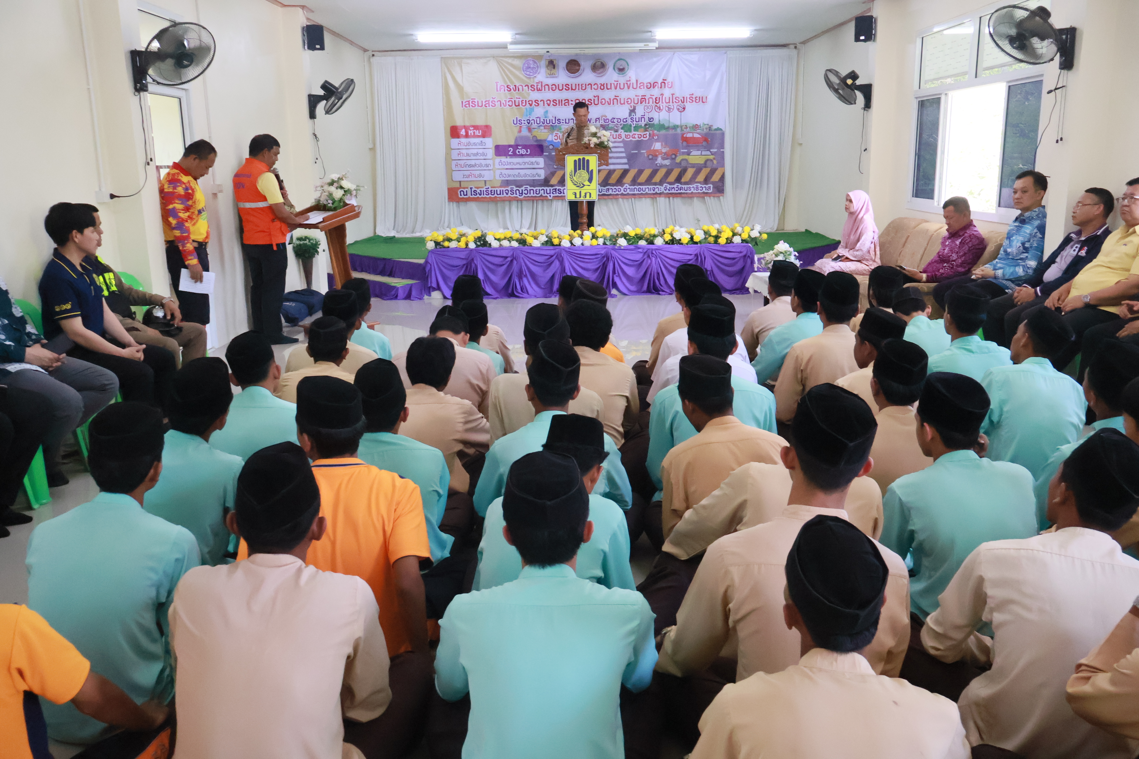 นายปฏิเวชวุฒิศักย์ สุขขี ผู้อำนวยการแขวงทางหลวงนราธิวาส มอบหมายให้นายนิอารีฟีน นิมุ นายช่างโยธาปฏิบัติงาน พร้อมด้วยเจ้าหน้าที่หมวดทางหลวงยี่งอ ร่วมโครงการฝึกอบรมเยาวชนขับขี่ปลอดภัยเสริมสร้างวินัยจราจรและการป้องกันอุบัติภัยในโรงเรียน ประจำปีงบประมาณ พ.ศ. 2568 รุ่นที่ 2 เพื่อเรียนรู้เรื่องกฎหมายจราจรที่สำคัญ เสริมสร้างจิตสำนึกด้านความปลอดภัยทางถนนและวินัยจราจร รวมถึงการป้องกันอุบัติภัยในโรงเรียน โดยมีว่าที่ร้อยตรี ตระกูล โทธรรม ผู้ว่าราชการจังหวัดนราธิวาส เป็นประธานเปิดงาน พร้อมด้วยหน่วยงานที่เกี่ยวข้อง และภาคีเครือข่าย เข้าร่วมโครงการดังกล่าว ณ โรงเรียนเจริญวิทยานุสรณ์ อำเภอบาเจาะ จังหวัดนราธิวาส โดยมีการให้ความรู้เรื่องกฏหมายจราจรทางบก สัญญาณมือ ป้าย และเครื่องหมายจราจรที่สำคัญ ความรู้ด้านการขับขี่รถจักรยานยนต์ที่ถูกต้อง การฝึกทักษะการขับขี่รถจักรยานยนต์ เพื่อให้ผู้เข้ารับการฝึกอบรมได้รับความรู้และทักษะเกี่ยวกับการขับขี่รถจักรยานยนต์อย่างถูกต้องตามหลักจราจร และมีความรู้ในการป้องกันอุบัติภัยในโรงเรียน สามารถปฏิบัติตนอย่างถูกต้องเมื่อเกิดอุบัติภัย