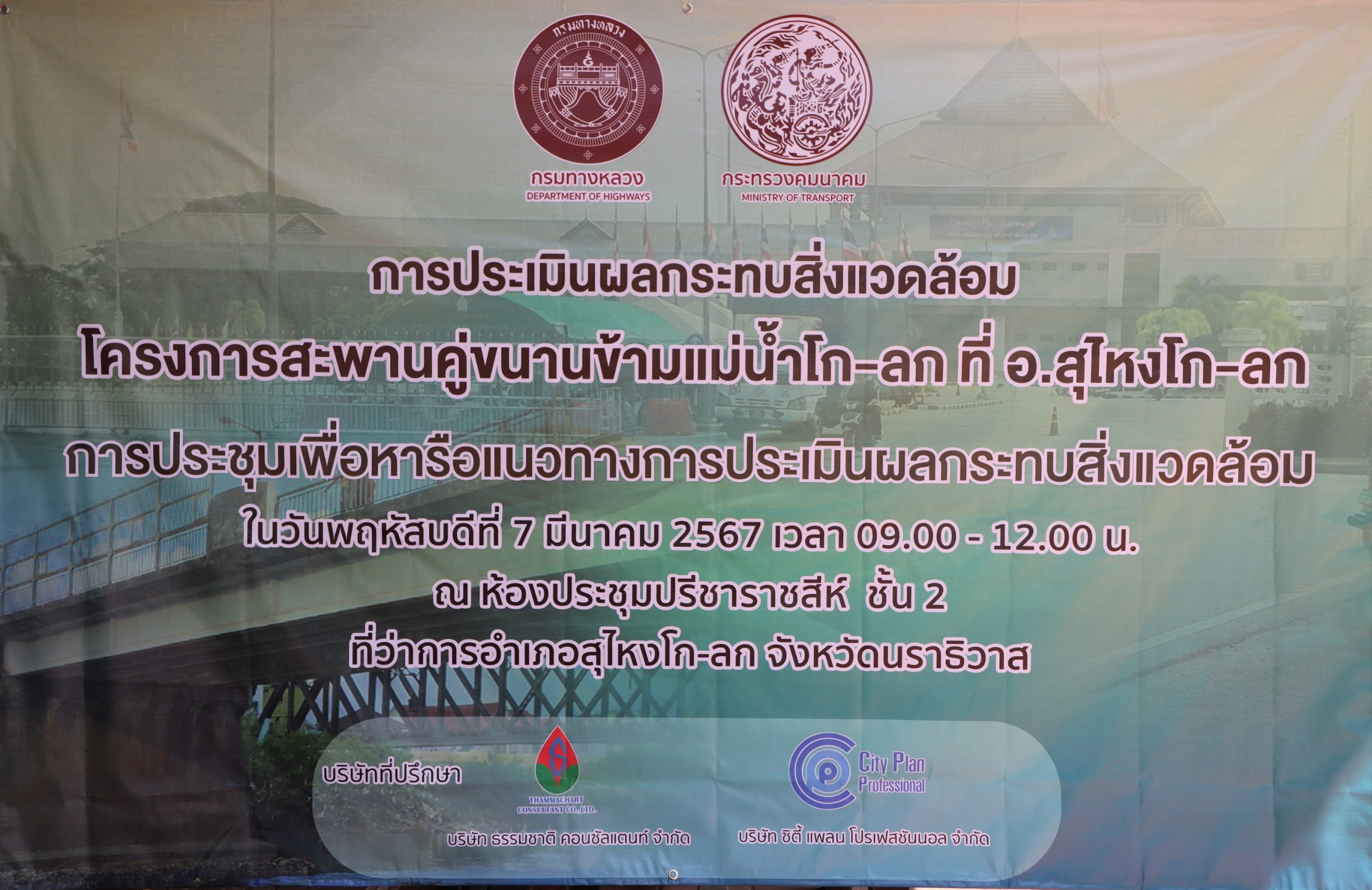 นายจอมปวีร์ จันทร์หิรัญ ผู้อำนวยการสำนักงานทางหลวงที่ 18 รักษาราชการแทน ผู้อำนวยการแขวงทางหลวงนราธิวาส มอบหมายให้นายธวัชชัย เผนานนท์ รองผู้อำนวยการแขวงทางหลวงนราธิวาส ฝ่ายวิศวกรรม นายศุภชาติ คงประเสริฐ หัวหน้าหมวดทางหลวงสุไหงโก-ลก และเจ้าหน้าที่ในสังกัด พร้อมด้วยนายสุธี มณีอ่อน ผู้อำนวยการส่วนควบคุมงานก่อสร้าง สำนักงานทางหลวงที่ 18 ร่วมกับเจ้าหน้าที่สำนักแผนงาน กลุ่มงานสิ่งแวดล้อม กรมทางหลวง เข้าร่วมประชุมเพื่อหารือแนวทางการประเมินผลกระทบสิ่งแวดล้อมให้กลุ่มเป้าหมายที่เกี่ยวข้องได้รับทราบและรับฟังความคิดเห็น ข้อเสนอแนะ และความต้องการของกลุ่มเป้าหมายที่เกี่ยวข้อง เพื่อนำไปพิจารณาประกอบการศึกษา โครงการสะพานคู่ขนานข้ามแม่น้ำโก-ลก ณ ห้องประชุมปรีชาราชสีห์ ชั้น 2 ที่ว่าการอำเภอสุไหงโก-ลก อ.สุไหงโก-ลก จ.นราธิวาส โดยมีนายวีรพัฒน์ บุณฑริก รองผู้ว่าราชการจังหวัดนราธิวาส เป็นประธานการประชุม