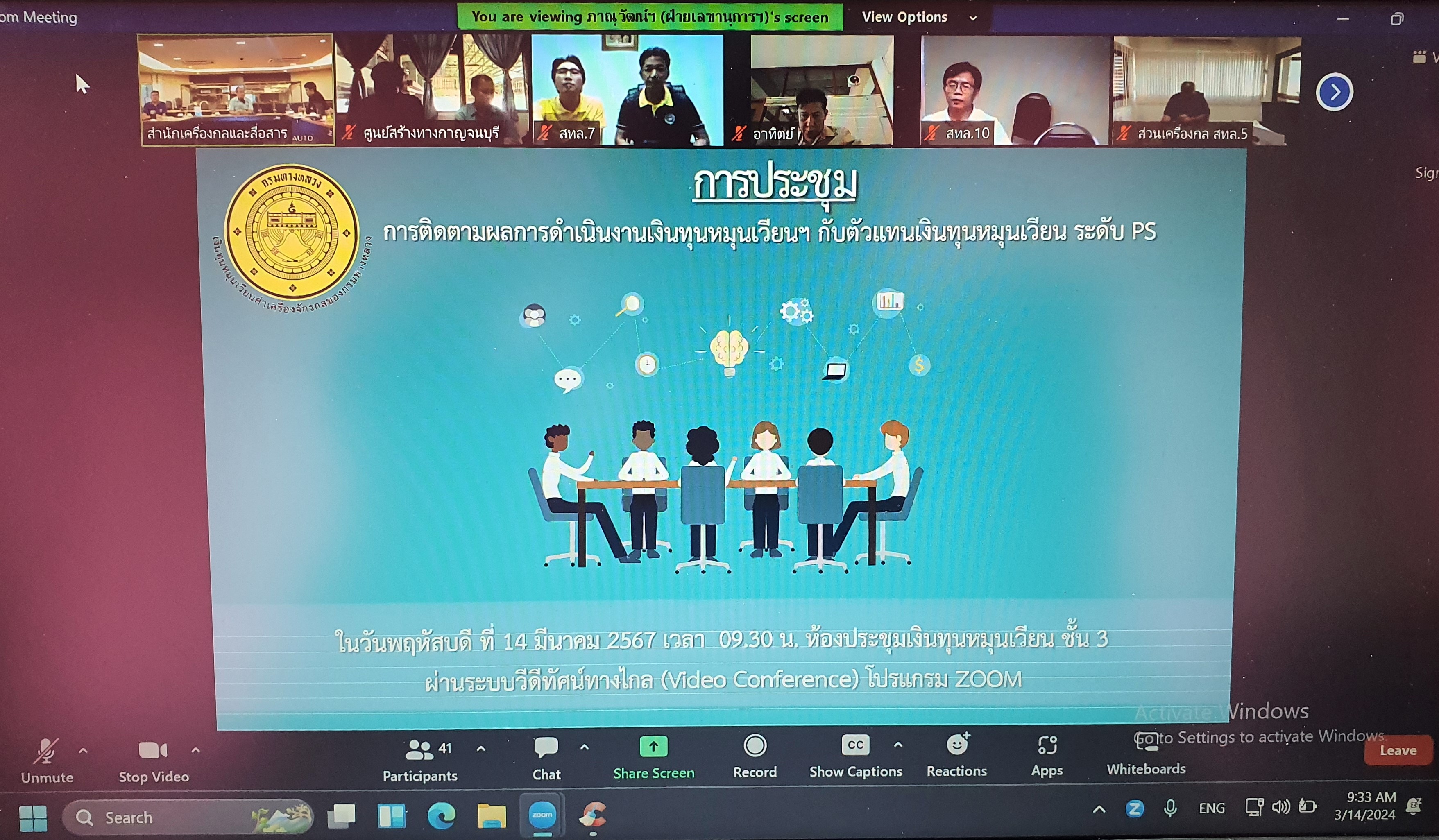 นายจอมปวีร์ จันทร์หิรัญ ผู้อำนวยการสำนักงานทางหลวงที่ 18 รักษาราชการแทน ผู้อำนวยการแขวงทางหลวงนราธิวาส มอบหมายให้นายชัยยุทธ บรรดาศักดิ์ นายช่างเครื่องกลปฏิบัติงาน และเจ้าหน้าที่เงินทุนหมุนเวียนฯ พร้อมด้วยนายสาโรจน์ ขุนจันทร์ ผู้อำนวยการส่วนเครื่องกล สำนักงานทางหลวงที่ 18 ร่วมประชุมตัวแทนเงินทุนหมุนเวียน ระดับ PS และวิศวกรแผนงาน (เครื่องกล) เพื่อติดตามผลการดำเนินงานเงินทุนหมุนเวียน แผน-ผลรายได้ค่าเช่า แผน-ผล การขายทอดตลาด และเรื่องอื่นๆ ที่เกี่ยวข้อง ผ่านระบบ Zoom Meeting ณ ห้องประชุม ชั้น 3 แขวงทางหลวงนราธิวาส โดยมีนายนพคุณ สว่างไสว ผู้อำนวยการสำนักเครื่องกลและสื่อสาร กรมทางหลวงเป็นประธานในการประชุม