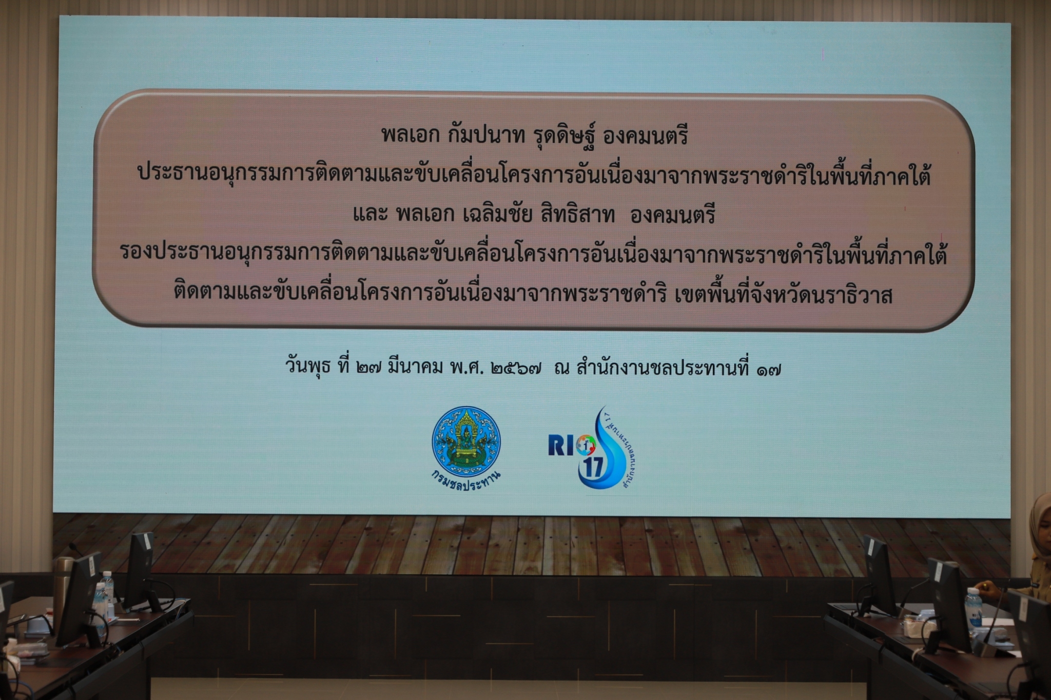 นายจอมปวีร์ จันทร์หิรัญ ผู้อำนวยการสำนักงานทางหลวงที่ 18 รักษาราชการแทน ผู้อำนวยการแขวงทางหลวงนราธิวาส มอบหมายให้นายธวัชชัย เผนานนท์ รองผู้อำนวยการแขวงทางหลวงนราธิวาส (ฝ่ายวิศวกรรม) พร้อมด้วยนายณพงศธร อิสสราวงศ์ หัวหน้างานวางแผน ร่วมต้อนรับพลเอก กัมปนาถ รุดดิษฐ์ องคมนตรี ประธานอนุกรรมการติดตามและขับเคลื่อนโครงการอันเนื่องมาจากพระราชดำริ ในพื้นที่ภาคใต้ พร้อมด้วยพลเอก เฉลิมชัย สิทธิสาท องคมนตรี รองประธานฯ และคณะอนุกรรมการฯ เดินทางมาติดตาม และขับเคลื่อนโครงการอันเนื่องมาจากพระราชดำริในพื้นที่จังหวัดนราธิวาส และประชุมติดตามการดำเนินงานโครงการอันเนื่องมาจากพระราชดำริ พร้อมรับฟังรายงานสถานการณ์อุทกภัยและแนวทางการให้ความช่วยเหลือประชาชนในพื้นที่จังหวัดนราธิวาส ณ ห้องประชุม SWOC 1-2 อาคารศูนย์ปฏิบัติการน้ำอัจฉริยะ สำนักงานชลประทานที่ 17 ต.กะลุวอเหนือ อ.เมืองนราธิวาส โดยมี ว่าที่ร้อยตรี ตระกูล โทธรรม ผู้ว่าราชการจังหวัดนราธิวาส และหัวหน้าส่วนราชการที่เกี่ยวข้อง ร่วมต้อนรับฯ