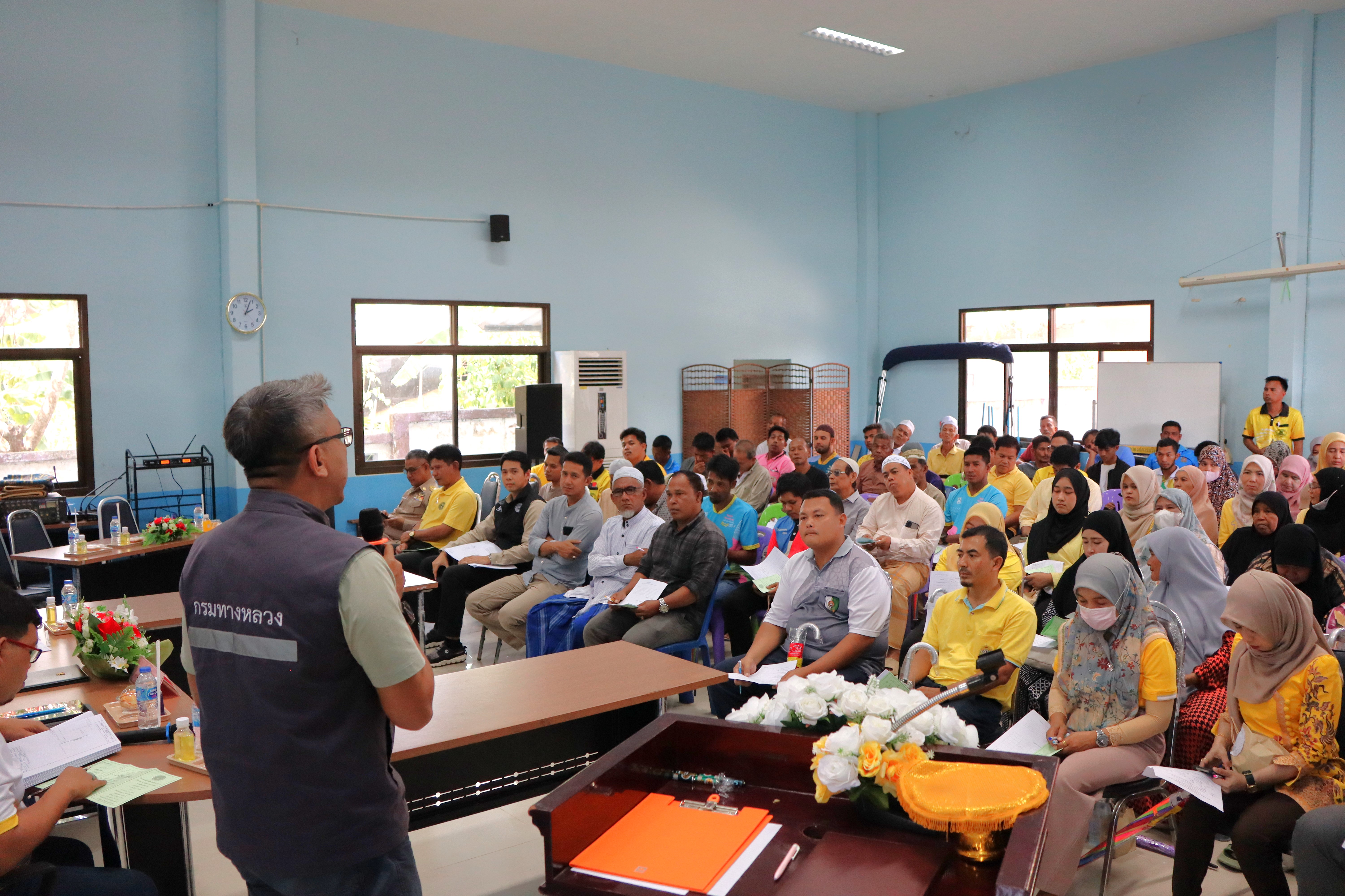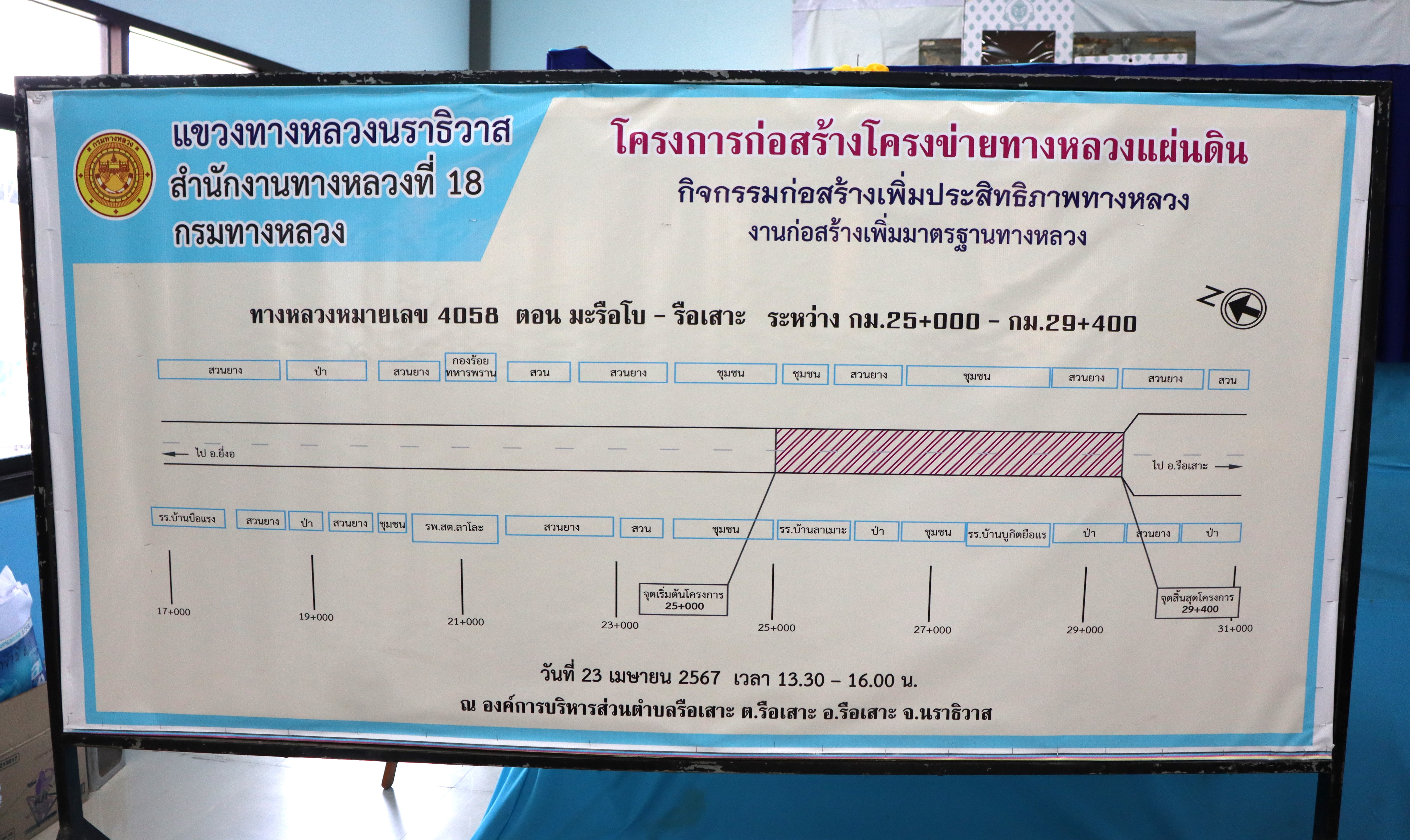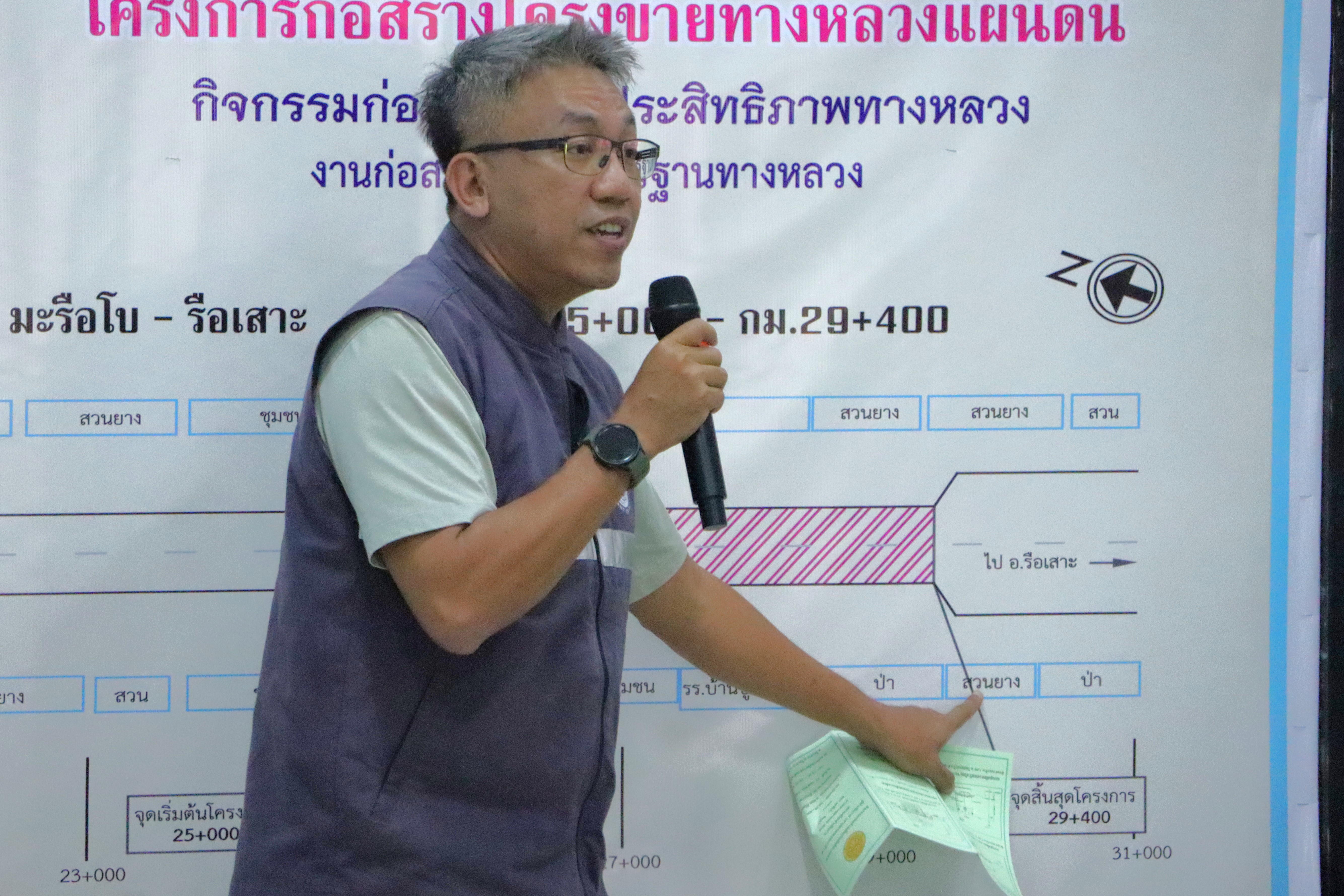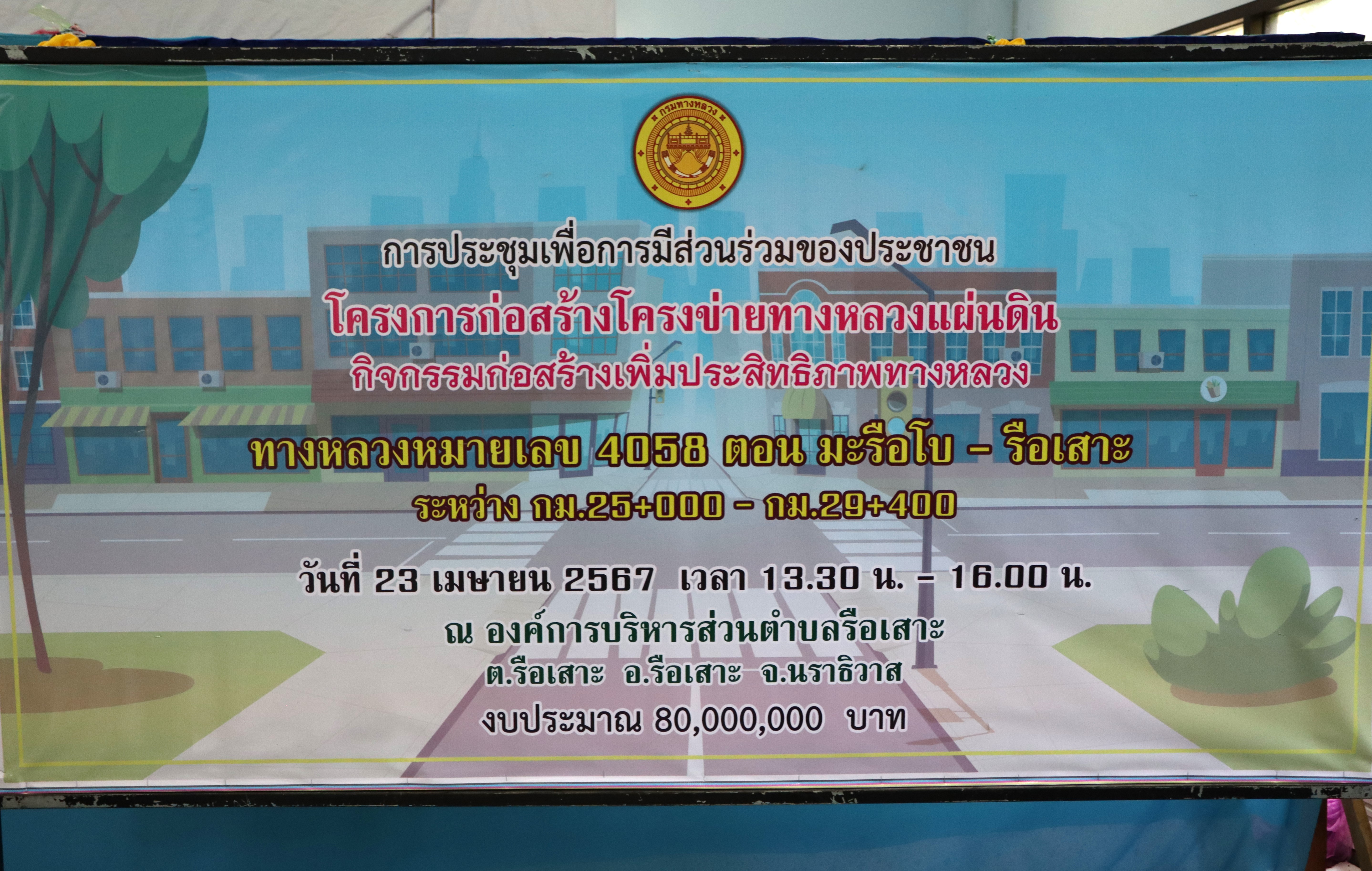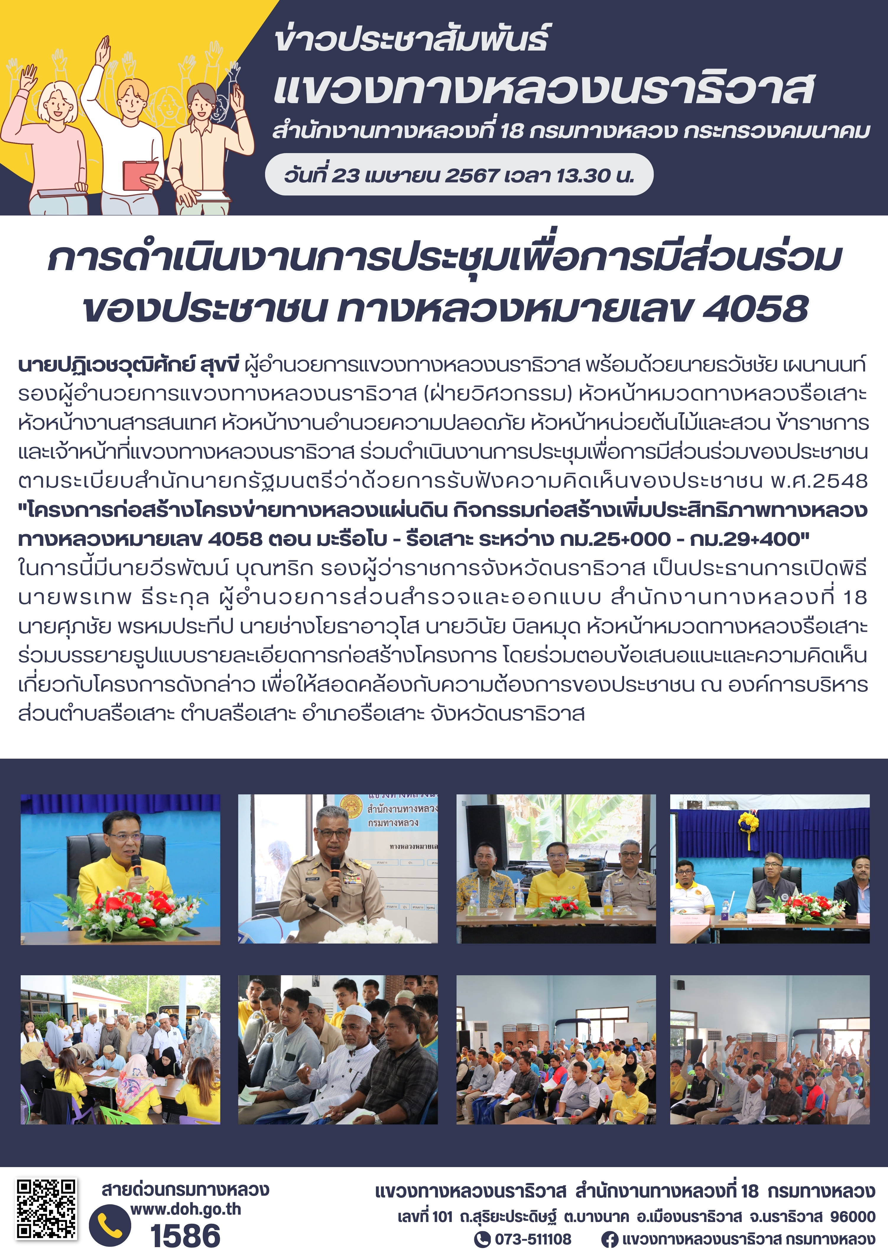 นายปฏิเวชวุฒิศักย์ สุขขี ผู้อำนวยการแขวงทางหลวงนราธิวาส พร้อมด้วยนายธวัชชัย เผนานนท์ รองผู้อำนวยการแขวงทางหลวงนราธิวาส (ฝ่ายวิศวกรรม) หัวหน้าหมวดทางหลวงรือเสาะ หัวหน้างานสารสนเทศ หัวหน้างานอำนวยความปลอดภัย หัวหน้าหน่วยต้นไม้และสวน ข้าราชการ และเจ้าหน้าที่แขวงทางหลวงนราธิวาส ร่วมดำเนินงานการประชุมเพื่อการมีส่วนร่วมของประชาชน ตามระเบียบสำนักนายกรัฐมนตรีว่าด้วยการรับฟังความคิดเห็นของประชาชน พ.ศ.2548 "โครงการก่อสร้างโครงข่ายทางหลวงแผ่นดิน กิจกรรมก่อสร้างเพิ่มประสิทธิภาพทางหลวง ทางหลวงหมายเลข 4058 ตอน มะรือโบ - รือเสาะ ระหว่าง กม.25+000 - กม.29+400"