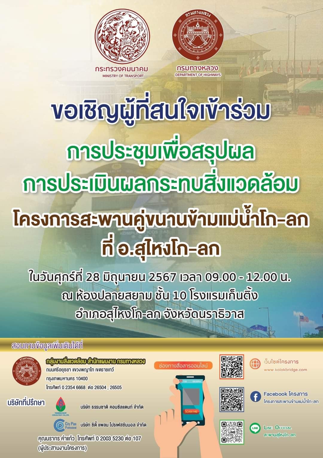 ตามที่กรมทางหลวง ได้ดำเนินงานศึกษาการประเมินผลกระทบสิ่งแวดล้อม โครงการสะพานคู่ขนานข้ามแม่น้ำโก-ลก ที่ อ.สุไหงโก-ลก เพื่อนำเสนอข้อมูลสรุปผลของการศึกษาด้านต่าง ๆ และสรุปผลการประเมินผลกระทบสิ่งแวดล้อมของโครงการ ตลอดจนผลการดำเนินงานด้านการมีส่วนร่วมของประชาชน ให้กลุ่มเป้าหมายที่เกี่ยวข้องได้รับทราบและรับฟังความคิดเห็น ข้อเสนอแนะ และความต้องการของกลุ่มเป้าหมายที่เกี่ยวข้อง เพื่อนำไปพิจารณาประกอบการศึกษา