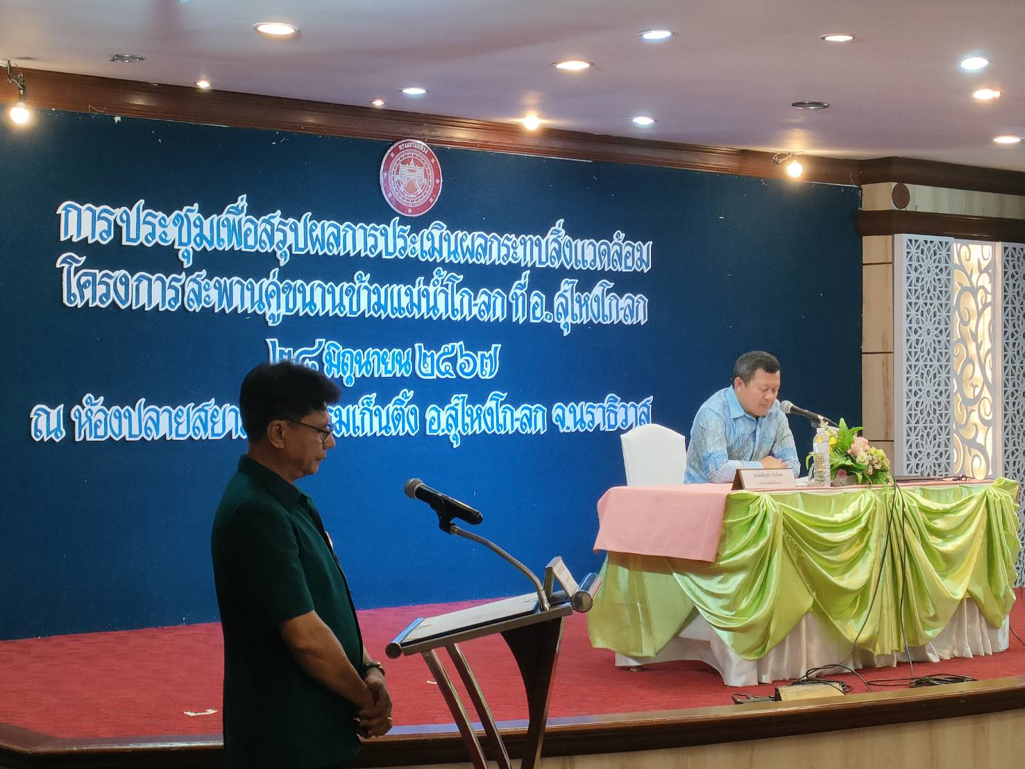 นายปฏิเวชวุฒิศักย์ สุขขี ผู้อำนวยการแขวงทางหลวงนราธิวาส มอบหมายให้นายธวัชชัย เผนานนท์ รองผู้อำนวยการแขวงทางหลวงนราธิวาส (ฝ่ายวิศวกรรม) ร่วมประชุมเพื่อสรุปผลการประเมินผลกระทบสิ่งแวดล้อม เพื่อนำเสนอข้อมูลสรุปผลของการศึกษาด้านต่าง ๆ และสรุปผลกระทบสิ่งแวดล้อมของโครงการ ตลอดจนผลการดำเนินงานด้านการมีส่วนร่วมของประชาชน โครงการสะพานคู่ขนานข้ามแม่น้ำโก-ลก ที่ อ.สุไหงโก-ลก ณ ห้องปลายสยาม ชั้น 10 โรงแรมเก็นติ้ง อ.สุไหงโก-ลก จ.นราธิวาส โดยมีนายอนิรุทร บัวอ่อน นายอำเภอสุไหงโก-ลก เป็นประธานในการประชุม