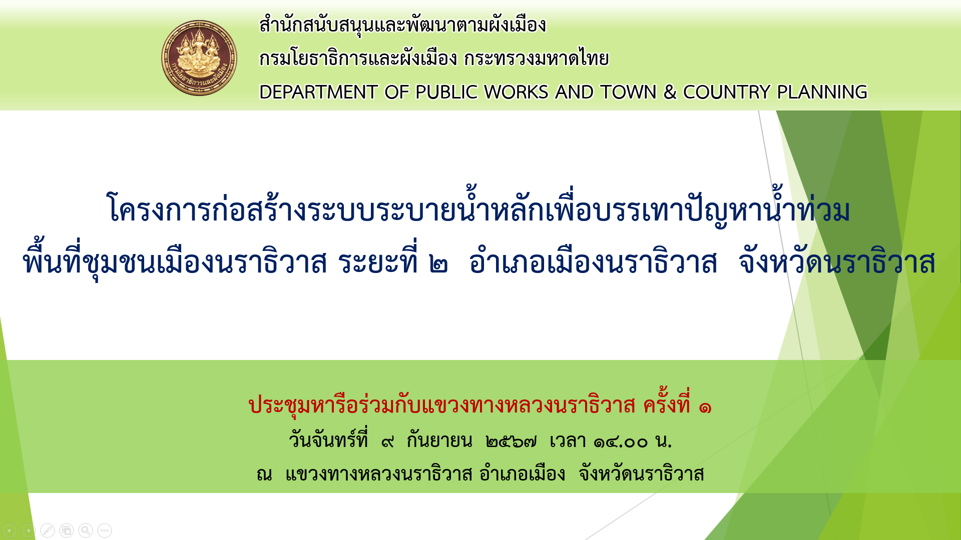 นายปฏิเวชวุฒิศักย์ สุขขี ผู้อำนวยการแขวงทางหลวงนราธิวาส พร้อมด้วยนายธวัชชัย เผนานนท์ รองผู้อำนวยการแขวงทางหลวงนราธิวาส (ฝ่ายวิศวกรรม)นายวีระชัย ปัญญาเถิง ผู้อำนวยการหมวดทางหลวงอาวุโสนราธิวาส และนางสาวอัธธิดา ติ้งหวัง หัวหน้างานสารสนเทศ ร่วมประชุมหารือครั้งที่ 1 โครงการก่อสร้างระบบระบายน้ำหลักเพื่อบรรเทาปัญหาน้ำท่วม พื้นที่ชุมชนเมืองนราธิวาส ระยะที่ 2 อำเภอเมืองนราธิวาส จังหวัดนราธิวาส โดยมีนางสาวสุภัทรา ชัยเทวารัณย์ ผู้ตรวจราชการกรมโยธาธิการและผังเมือง เขตตรวจราชการที่ 7 กลุ่มจังหวัดภาคใต้ชายแดน พร้อมด้วยนายว่าศักดิ์ เจิมจิระ โยธาธิการและผังเมืองจังหวัดนราธิวาส และเจ้าหน้าที่บริษัท เมกก้าเทค คอนซัลแตนท์ จำกัด บริษัทที่ปรึกษา ร่วมประชุมและหารือถึงองค์ประกอบ และรายละเอียดของโครงการดังกล่าว ณ ห้องประชุมชั้น 3 แขวงทางหลวงนราธิวาส