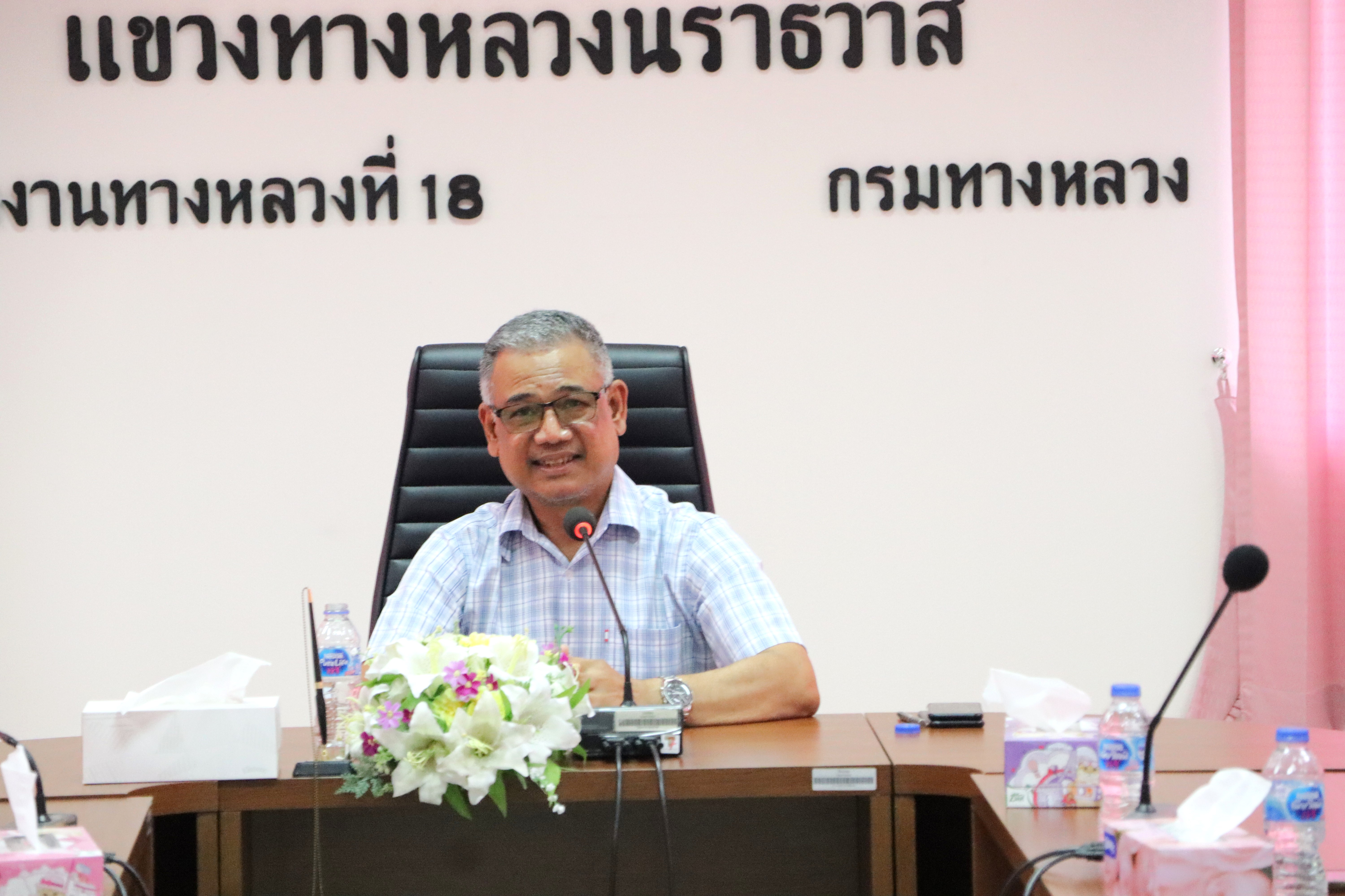 นายปฏิเวชวุฒิศักย์ สุขขี ผู้อำนวยการแขวงทางหลวงนราธิวาส พร้อมด้วยรองผู้อำนวยการแขวงทางหลวงนราธิวาส ฝ่ายบริหาร หัวหน้างาน หัวหน้าหมวดทางหลวง ข้าราชการ และเจ้าหน้าที่ ร่วมประชุมพิจารณาการดำเนินงานเพื่อแต่งตั้งคณะทำงานตรวจสอบและติดตามผลการดำเนินงานซ่อมแซมทรัพย์สินในเขตพื้นที่แขวงทางหลวงนราธิวาส และติดตามการปฏิบัติงานการรายงานอุบัติเหตุ ณ ห้องประชุม ชั้น 3 แขวงทางหลวงนราธิวาส
