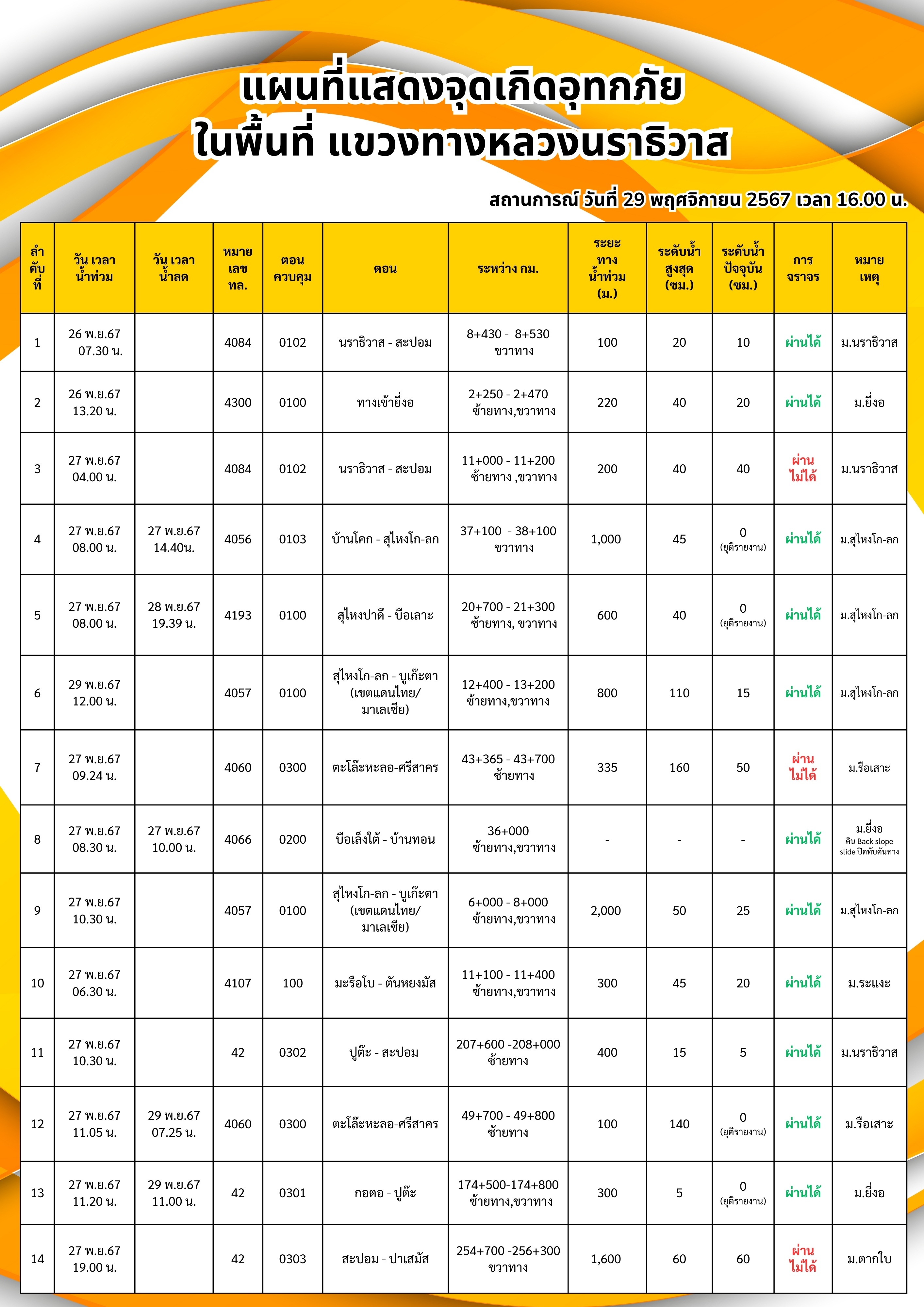 รายงานสถานการณ์อุทกภัยในพื้นที่จังหวัดนราธิวาส วันเวลาที่ update วันที่ 29 พ.ย. 67 เวลา 16.00 น.