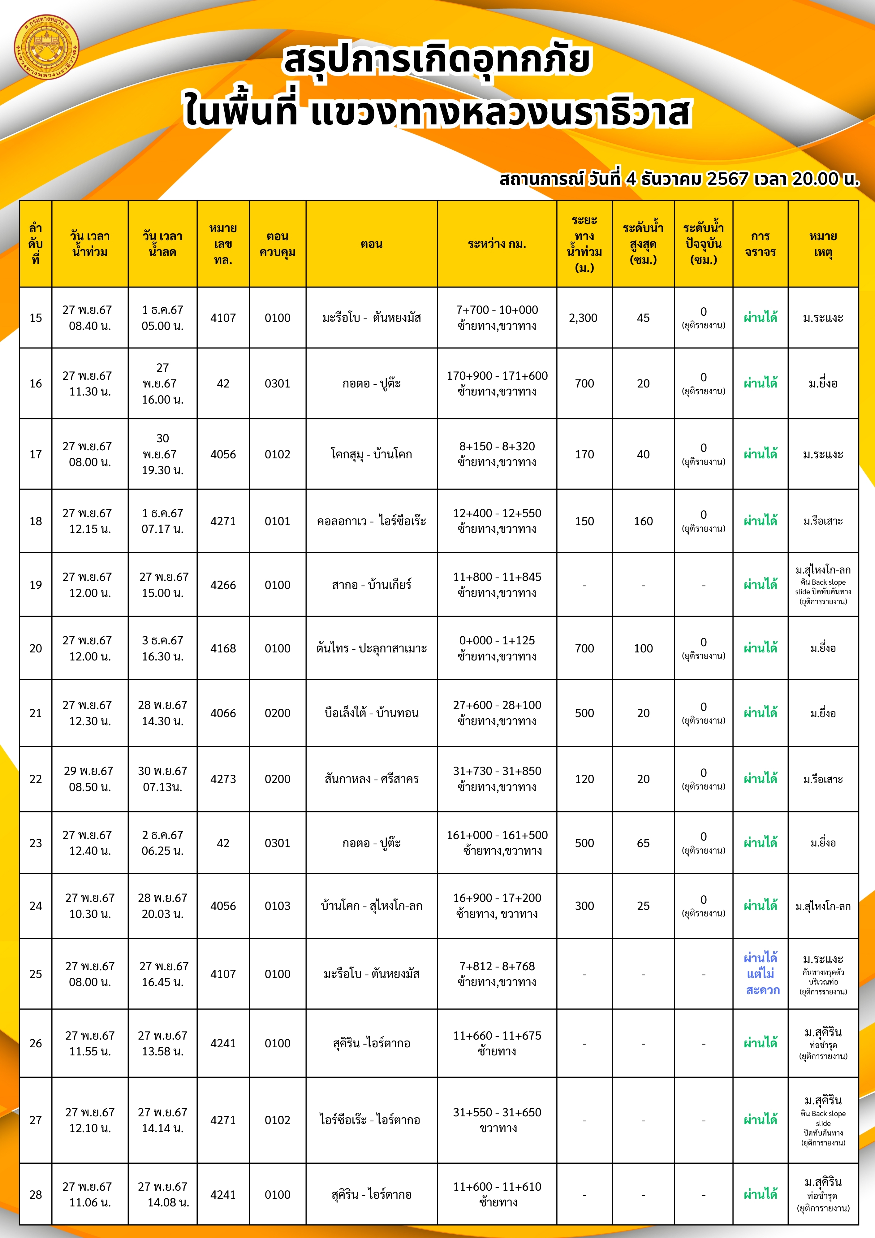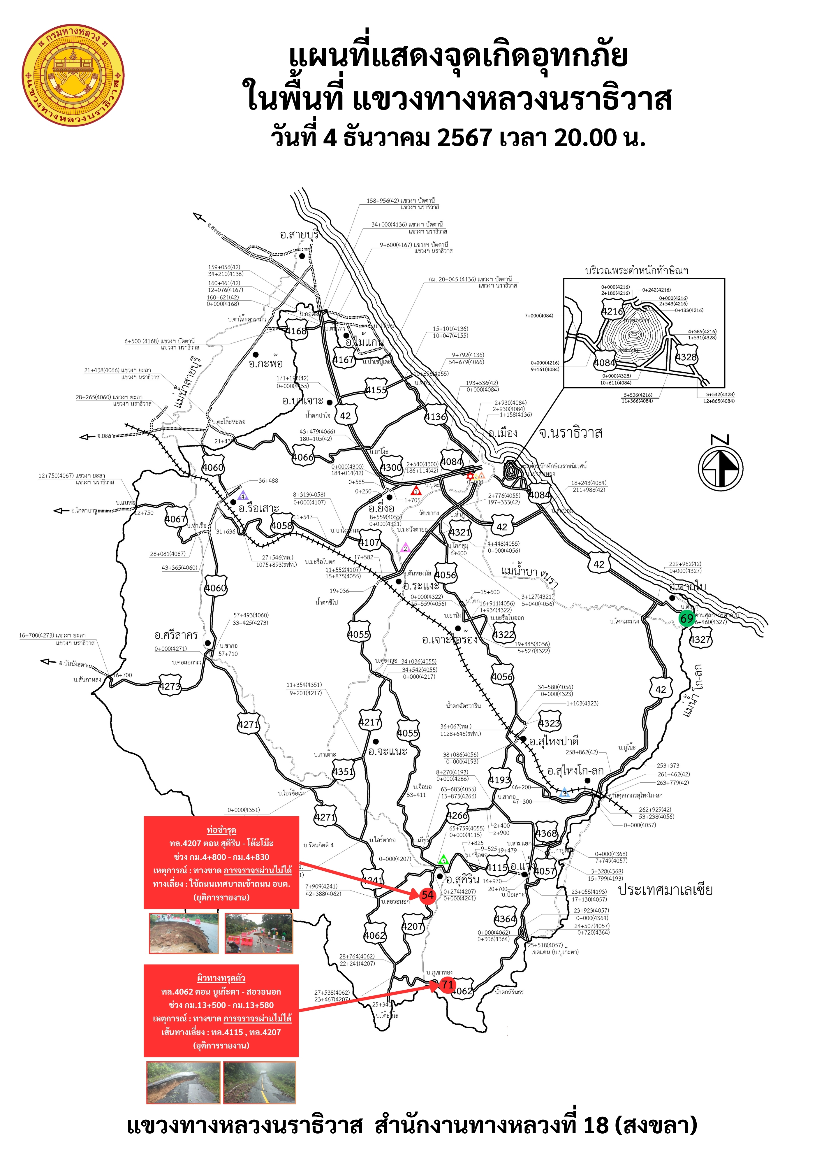 แขวงทางหลวงนราธิวาส ขอรายงานสถานการณ์อุทกภัยในพื้นที่จังหวัดนราธิวาส วันเวลาที่ update วันที่ 4 ธ.ค. 67 เวลา 20.00 น.