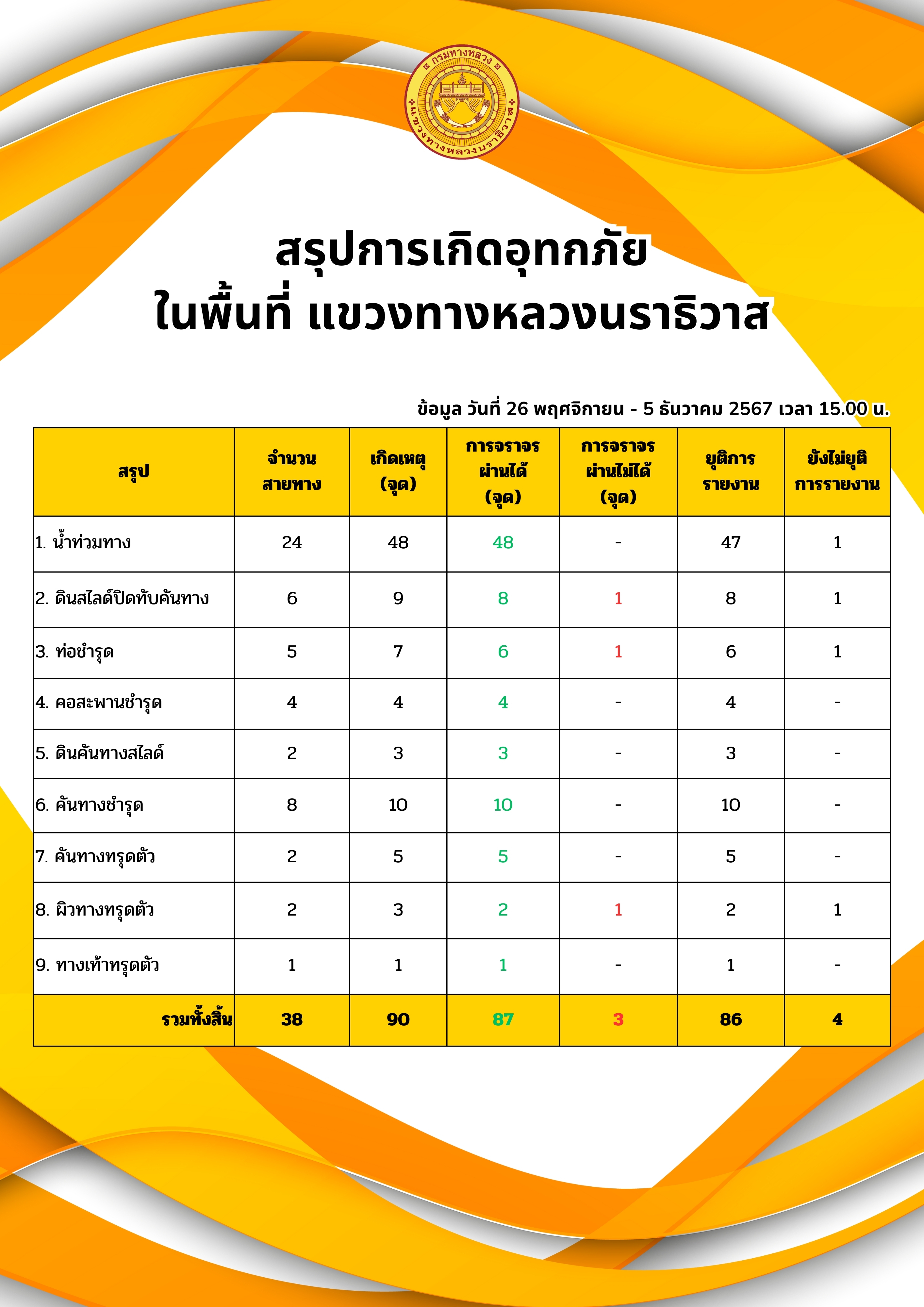 แขวงทางหลวงนราธิวาส ขอรายงานสถานการณ์อุทกภัยในพื้นที่จังหวัดนราธิวาส