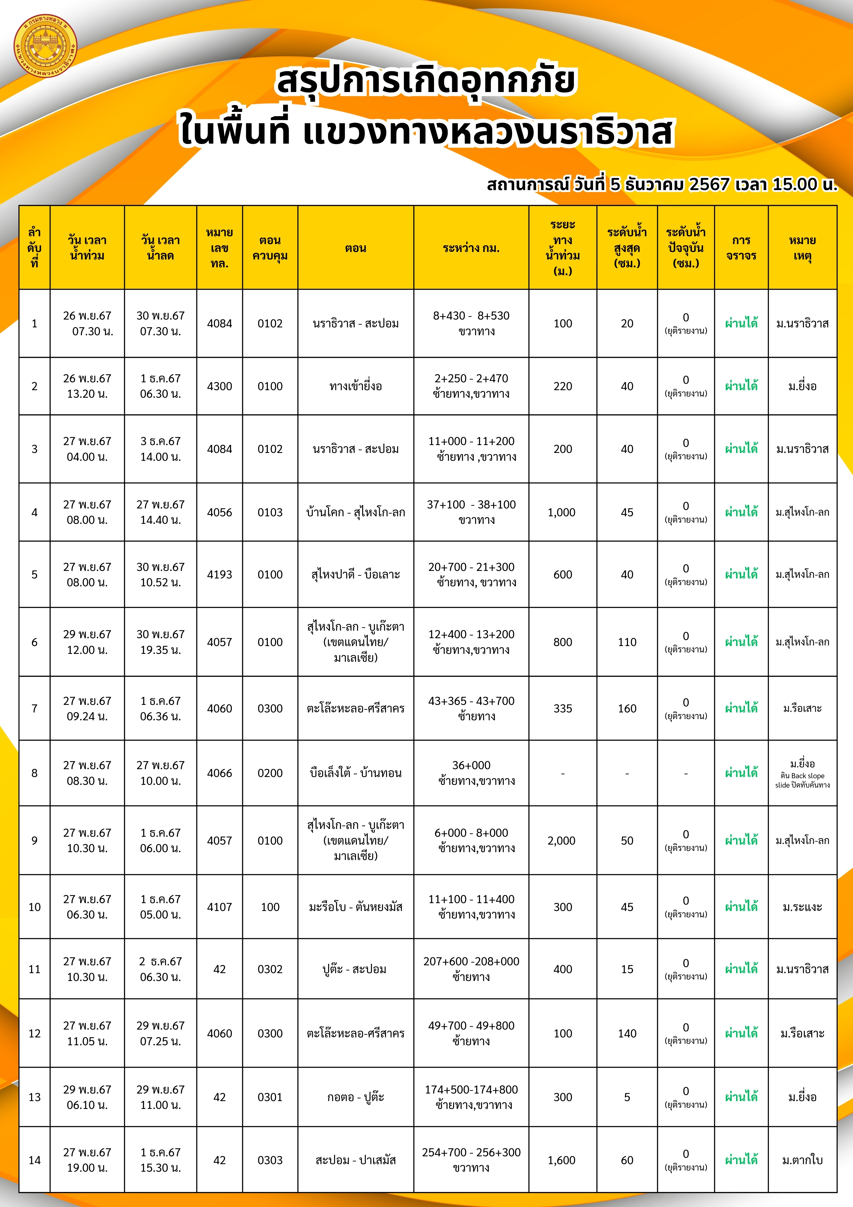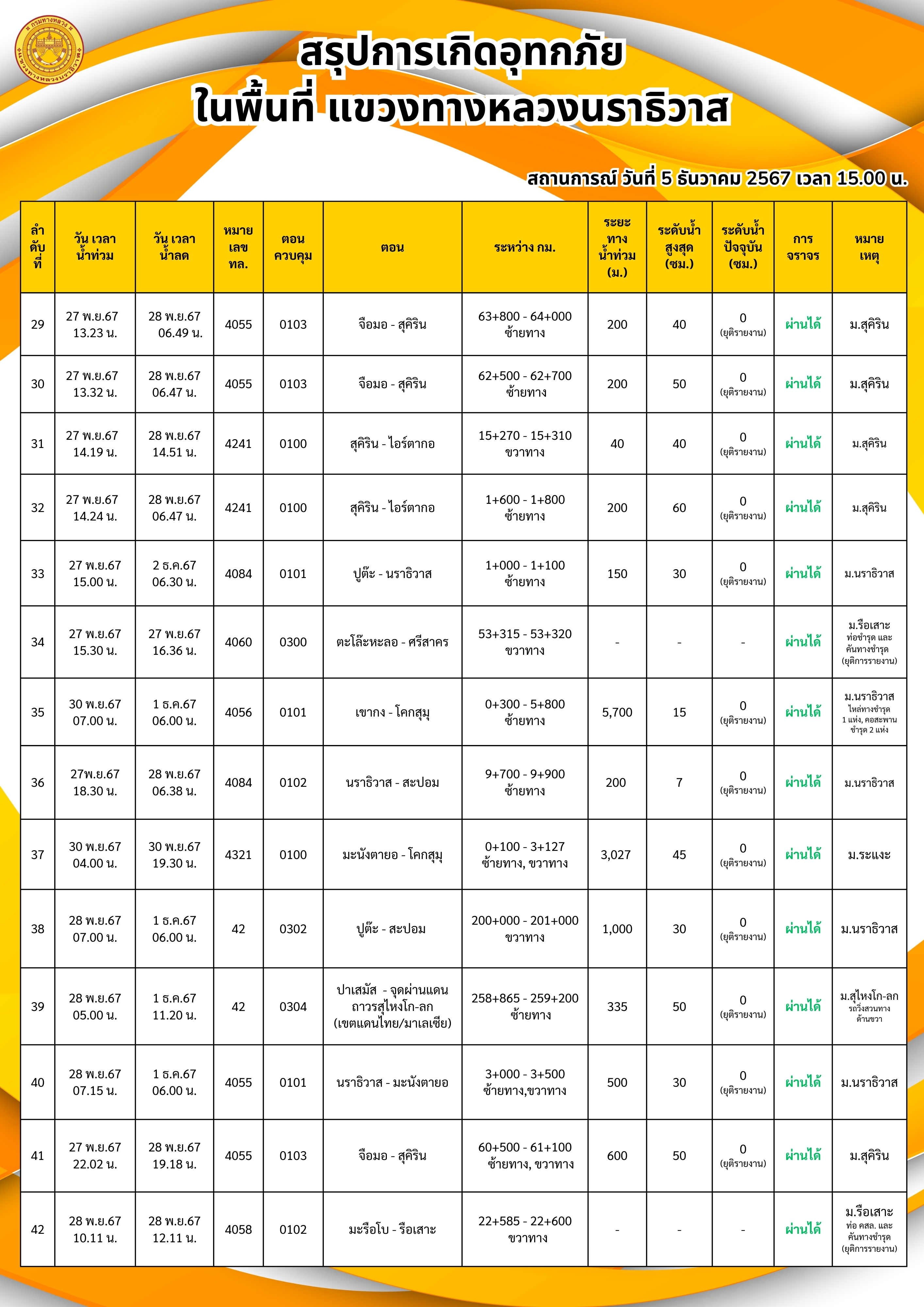 แขวงทางหลวงนราธิวาส ขอรายงานสถานการณ์อุทกภัยในพื้นที่จังหวัดนราธิวาส วันเวลาที่ update วันที่ 5 ธ.ค. 67 เวลา 20.00 น.