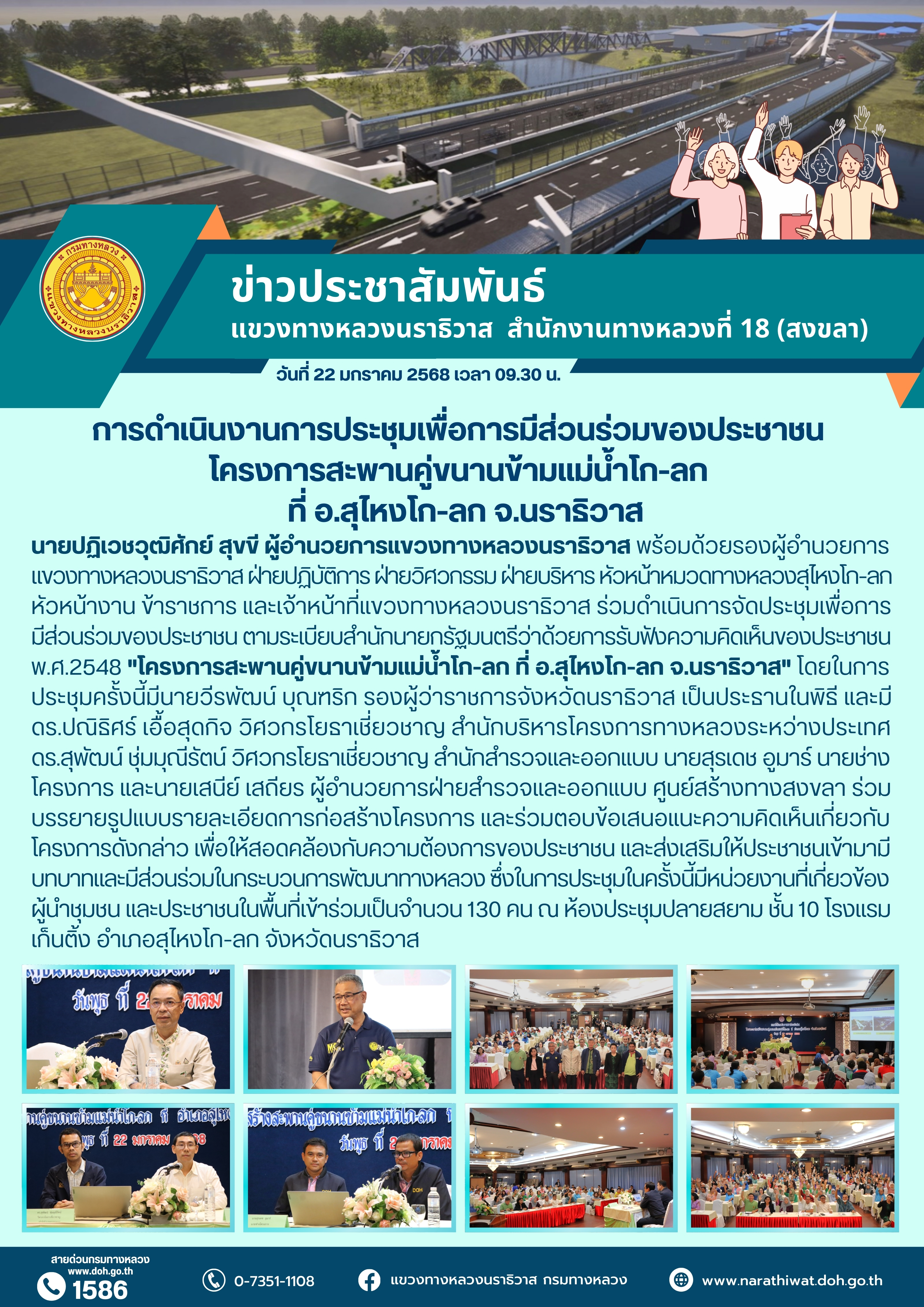 นายปฏิเวชวุฒิศักย์ สุขขี ผู้อำนวยการแขวงทางหลวงนราธิวาส พร้อมด้วยรองผู้อำนวยการแขวงทางหลวงนราธิวาส ฝ่ายปฏิบัติการ ฝ่ายวิศวกรรม ฝ่ายบริหาร หัวหน้าหมวดทางหลวงสุไหงโก-ลก หัวหน้างาน ข้าราชการ และเจ้าหน้าที่แขวงทางหลวงนราธิวาส ร่วมดำเนินการจัดประชุมเพื่อการมีส่วนร่วมของประชาชน ตามระเบียบสำนักนายกรัฐมนตรีว่าด้วยการรับฟังความคิดเห็นของประชาชน พ.ศ.2548 "โครงการสะพานคู่ขนานข้ามแม่น้ำโก-ลก ที่ อ.สุไหงโก-ลก จ.นราธิวาส" โดยในการประชุมครั้งนี้มีนายวีรพัฒน์ บุณฑริก รองผู้ว่าราชการจังหวัดนราธิวาส เป็นประธานในพิธี และมี ดร.ปณิธิศร์ เอื้อสุดกิจ วิศวกรโยธาเชี่ยวชาญ สำนักบริหารโครงการทางหลวงระหว่างประเทศ ดร.สุพัฒน์ ชุ่มมุณีรัตน์ วิศวกรโยธาเชี่ยวชาญ สำนักสำรวจและออกแบบ นายสุรเดช อูมาร์ นายช่างโครงการ และนายเสนีย์ เสถียร ผู้อำนวยการฝ่ายสำรวจและออกแบบ ศูนย์สร้างทางสงขลา ร่วมบรรยายรูปแบบรายละเอียดการก่อสร้างโครงการ และร่วมตอบข้อเสนอแนะความคิดเห็นเกี่ยวกับโครงการดังกล่าว เพื่อให้สอดคล้องกับความต้องการของประชาชน และส่งเสริมให้ประชาชนเข้ามามีบทบาทและมีส่วนร่วมในกระบวนการพัฒนาทางหลวง ซึ่งในการประชุมในครั้งนี้มีหน่วยงานที่เกี่ยวข้อง ผู้นำชุมชน และประชาชนในพื้นที่เข้าร่วมเป็นจำนวน 130 คน ณ ห้องประชุมปลายสยาม ชั้น 10 โรงแรมเก็นติ้ง อำเภอสุไหงโก-ลก จังหวัดนราธิวาส