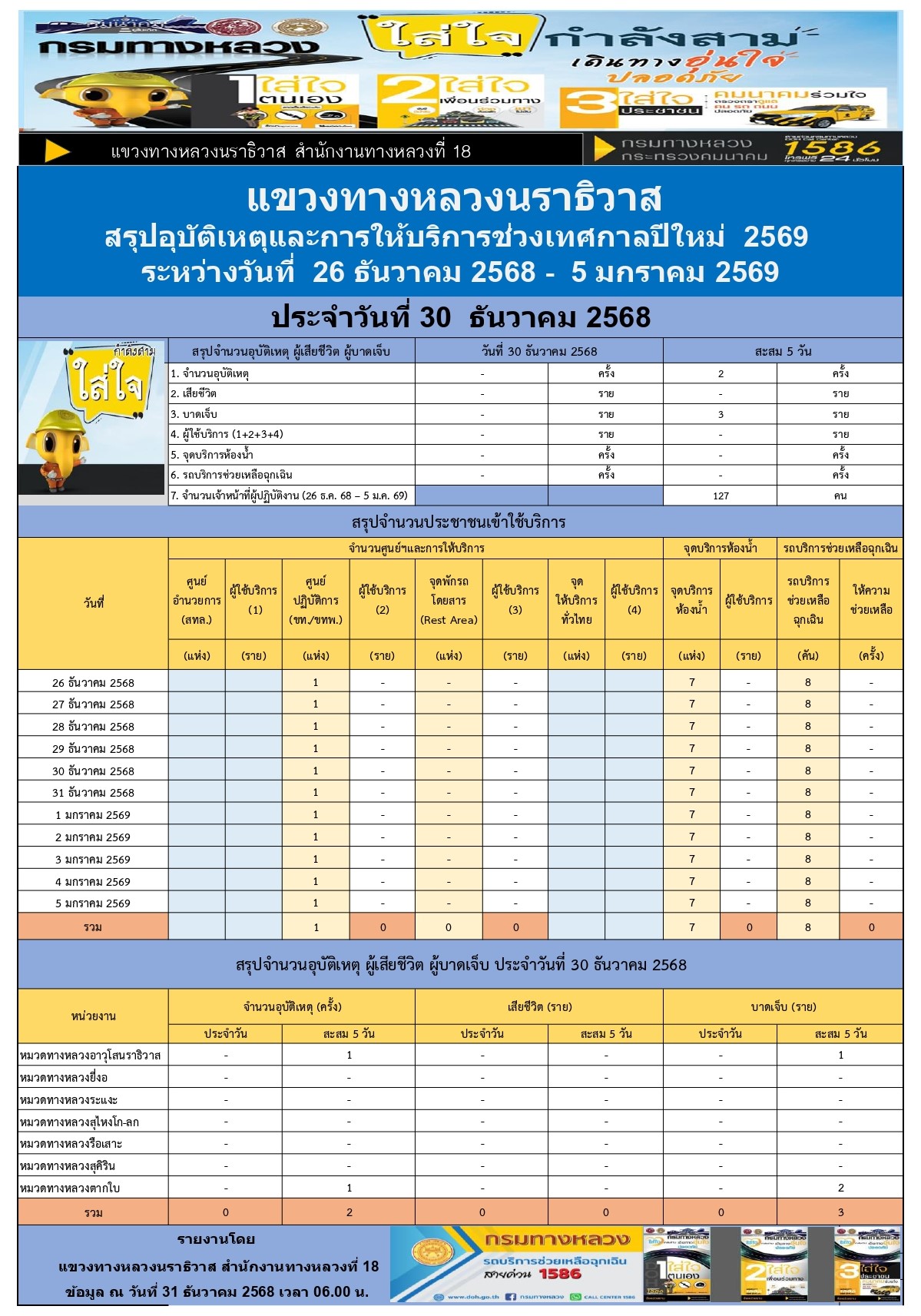 สรุปรายงานอุบัติเหตุและการให้บริการช่วงเทศกาลปีใหม่ 2569 ประจำวันที่ 30 ธันวาคม 2568