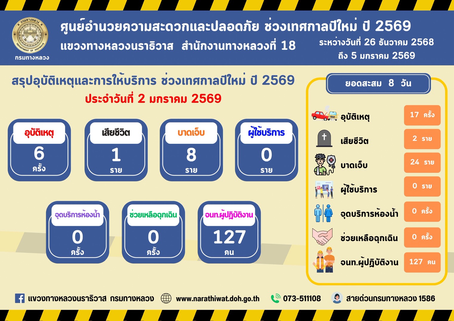 สรุปรายงานอุบัติเหตุและการให้บริการช่วงเทศกาลปีใหม่ 2569 ประจำวันที่ 2 มกราคม 2569