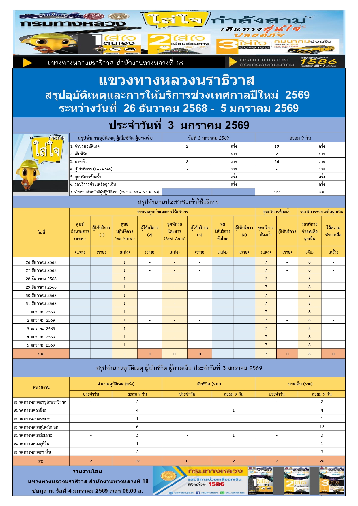 สรุปรายงานอุบัติเหตุและการให้บริการช่วงเทศกาลปีใหม่ 2569 ประจำวันที่ 3 มกราคม 2569