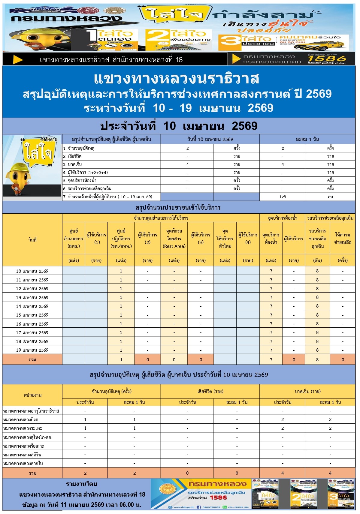 | สรุปรายงานอุบัติเหตุและการให้บริการช่วงสงกรานต์ ปี 2569 ประจำวันที่ 10 เมษายน 2569 | 0 | ดาวน์โหลด |