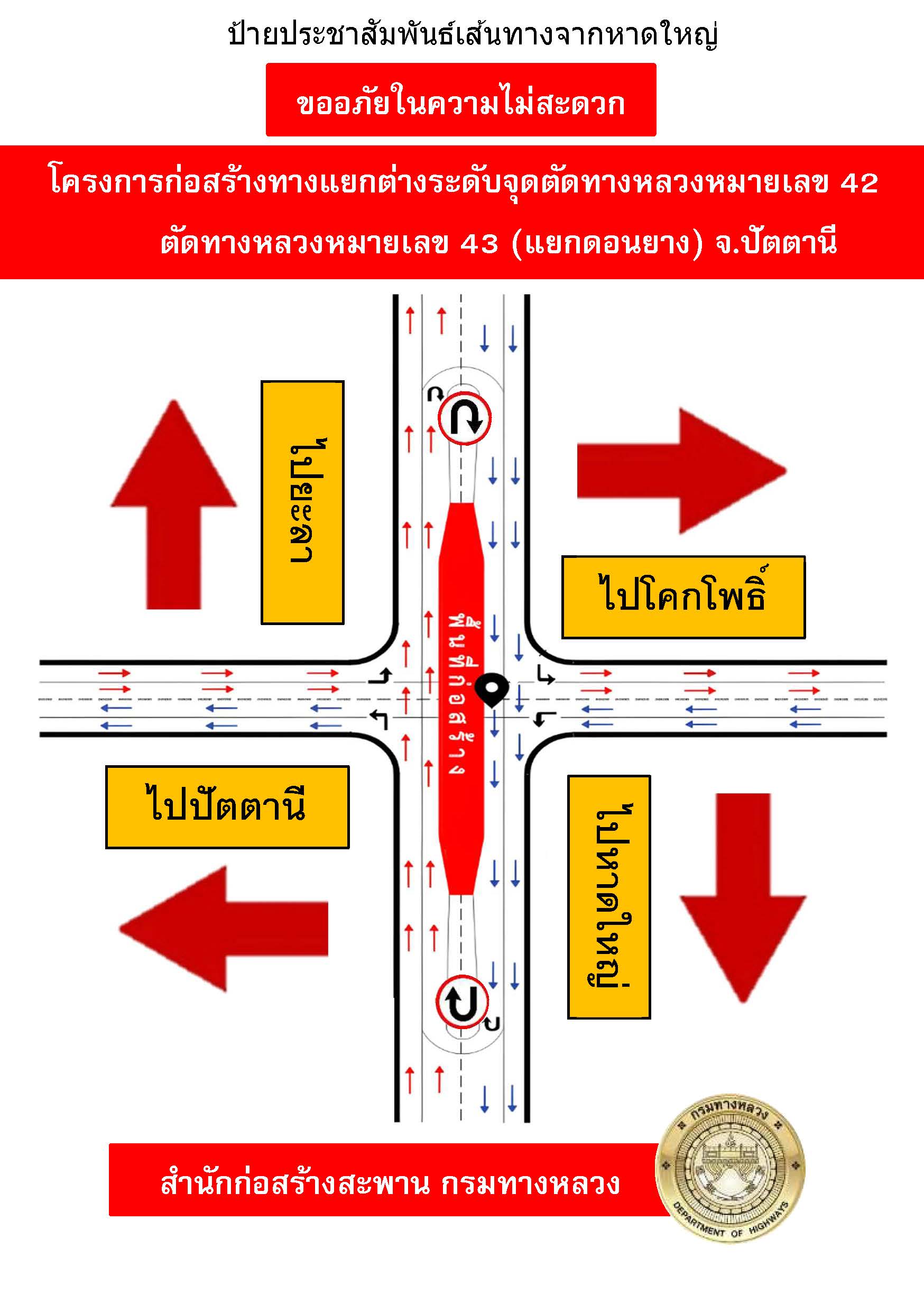 การดำเนินงาน การมีส่วนร่วมของประชาชน ประชาสัมพันธ์โครงการ และรับฟังความคิดเห็นของประชาชน จุดตัด ทล.42 กับทางหลวงหมายเลข 43 (แยกดอนยาง)