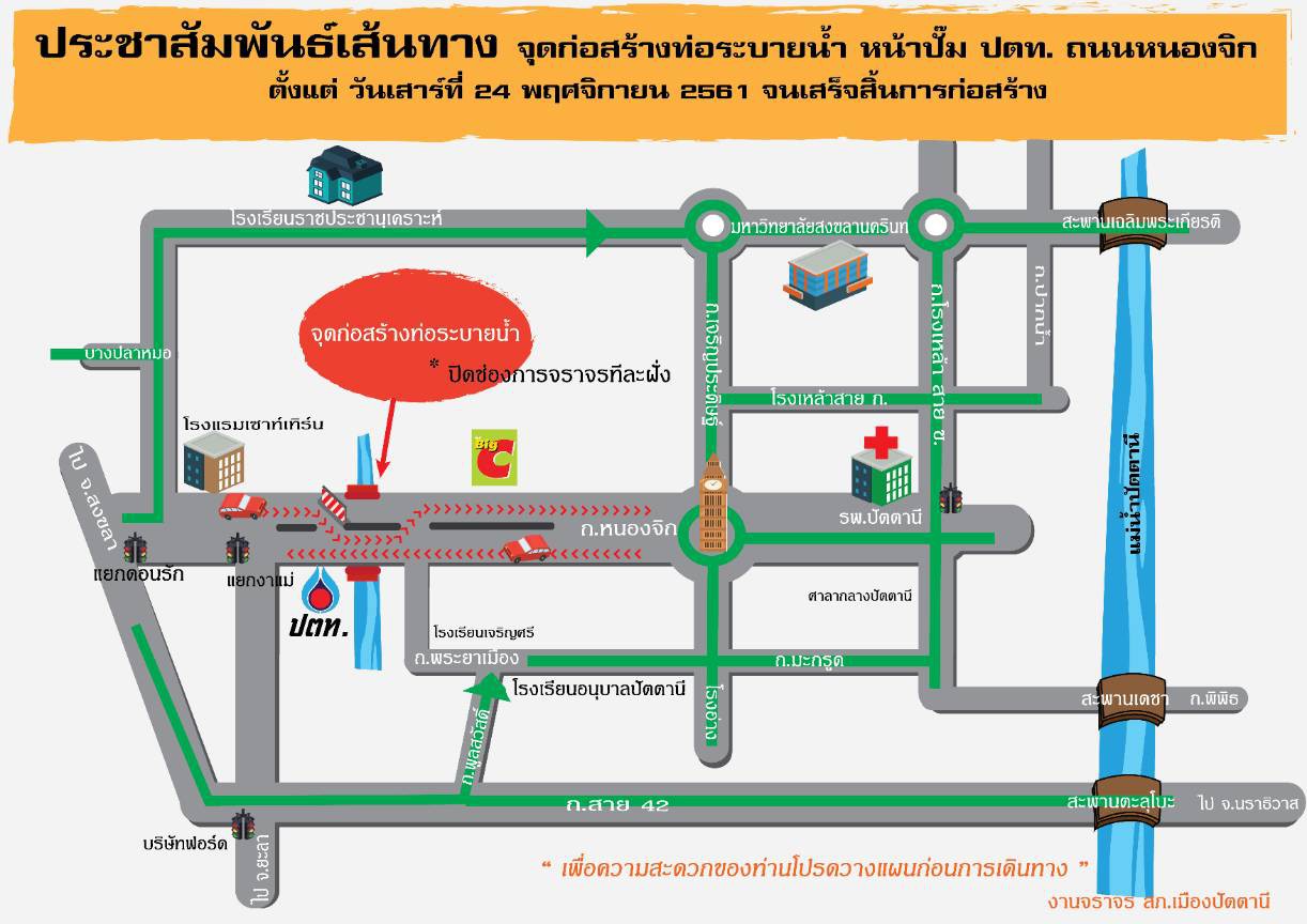 ก่อสร้างท่อลอดถนนหนองจิก บริเวณสถานีบริการน้ำมัน ปตท. เส้นทางเข้า-ออก ตัวเมืองปัตตานี
