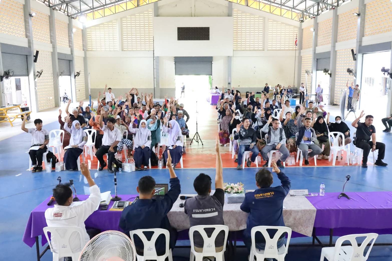 ?? นายสมัคร เลือดวงหัด ผู้อำนวยการแขวงทางหลวงปัตตานี, นายสุวิชัย นวลฉวี รองผู้อำนวยการฯ ฝ่ายปฏิบัติการ, นายประกาศ พุ่มสุวรรณ รองผู้อำนวยการฯ ฝ่ายวิศวกรรม, นางอุไรวรรณ มุสิแดง รองผู้อำนวยการฯ ฝ่ายบริหารงานทั่วไป พร้อมด้วย หัวหน้าหมวดทางหลวงหนองจิก, หัวหน้าหมวดทางหลวงสายบุรี, หัวหน้างานวางแผน, หัวหน้างานสารสนเทศ, ข้าราชการ และเจ้าหน้าที่ ร่วมดำเนินงานการมีส่วนร่วมของประชาชน ตามระเบียบสำนักนายกรัฐมนตรีว่าด้วยการรับฟังความคิดเห็นของประชาชน พ.ศ. 2548 โครงการก่อสร้างเพิ่มประสิทธิภาพทางหลวง ทางหลวงหมายเลข 42 ตอน บ้านดี - ปาลัส ระหว่าง กม.117+700 - กม.118+000