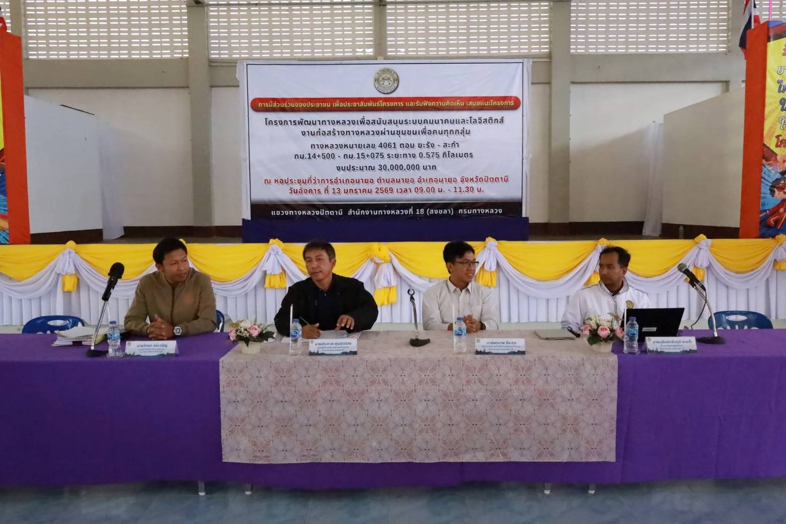 ?? ในการนี้ นายพรเทพ ธีระกุล ผู้อำนวยการส่วนสำรวจและออกแบบ สำนักงานทางหลวงที่ 18, นายประกาศ พุ่มสุวรรณ รองผู้อำนวยการฯ ฝ่ายวิศวกรรม, นายมูฮัมมัดอับดุฮ์ ลาเต๊ะ วิศวกรโยธาปฏิบัติการ, นายวิทยา หนิเจริญ นายช่างโยธาชำนาญงาน และนายพิเชษฐ ทองช่วย โครงการจัดกรรมสิทธิ์ที่ดิน ที่ 3 ร่วมเป็นวิทยากร บรรยายรูปแบบและรายละเอียดการก่อสร้างโครงการฯ, รับฟังความคิดเห็นและข้อเสนอแนะ และร่วมชี้แจงข้อซักถามด้วย โดยมี นายอนุชา สุวรรณโณ ปลัดอำเภอมายอ เป็นประธานในพิธีเปิด ณ หอประชุมที่ว่าการอำเภอมายอ ตำบลมายอ อำเภอมายอ จังหวัดปัตตานี