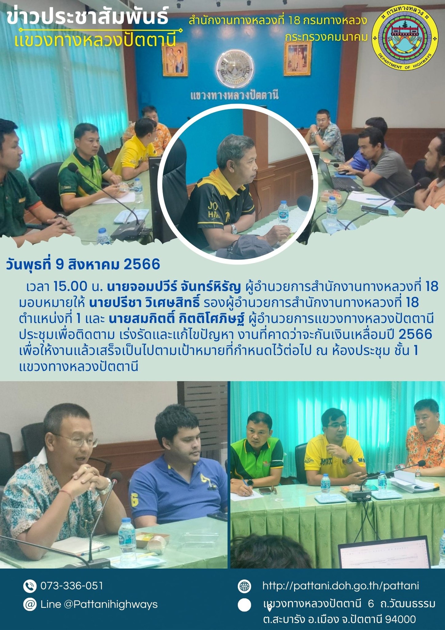 วันพุธ ที่ 9 สิงหาคม 2566 เวลา 15.00 น. นายจอมปวีร์ จันทร์หิรัญ ผู้อำนวยการสำนักงานทางหลวงที่ 18 มอบหมายให้ นายปรีชา วิเศษสิทธิ์ รองผู้อำนวยการสำนักงานทางหลวงที่ 18 ตำแหน่งที่ 1 และ นายสมกิตติ์ กิตติโศภิษฐ์ ผู้อำนวยการแขวงทางหลวงปัตตานี ประชุมเพื่อติดตาม เร่งรัดและแก้ไขปัญหา งานที่คาดว่าจะกันเงินเหลื่อมปี 2566 เพื่อให้งานแล้วเสร็จเป็นไปตามเป้าหมายที่กำหนดไว้ต่อไป ณ ห้องประชุม ชั้น 1 แขวงทางหลวงปัตตานี