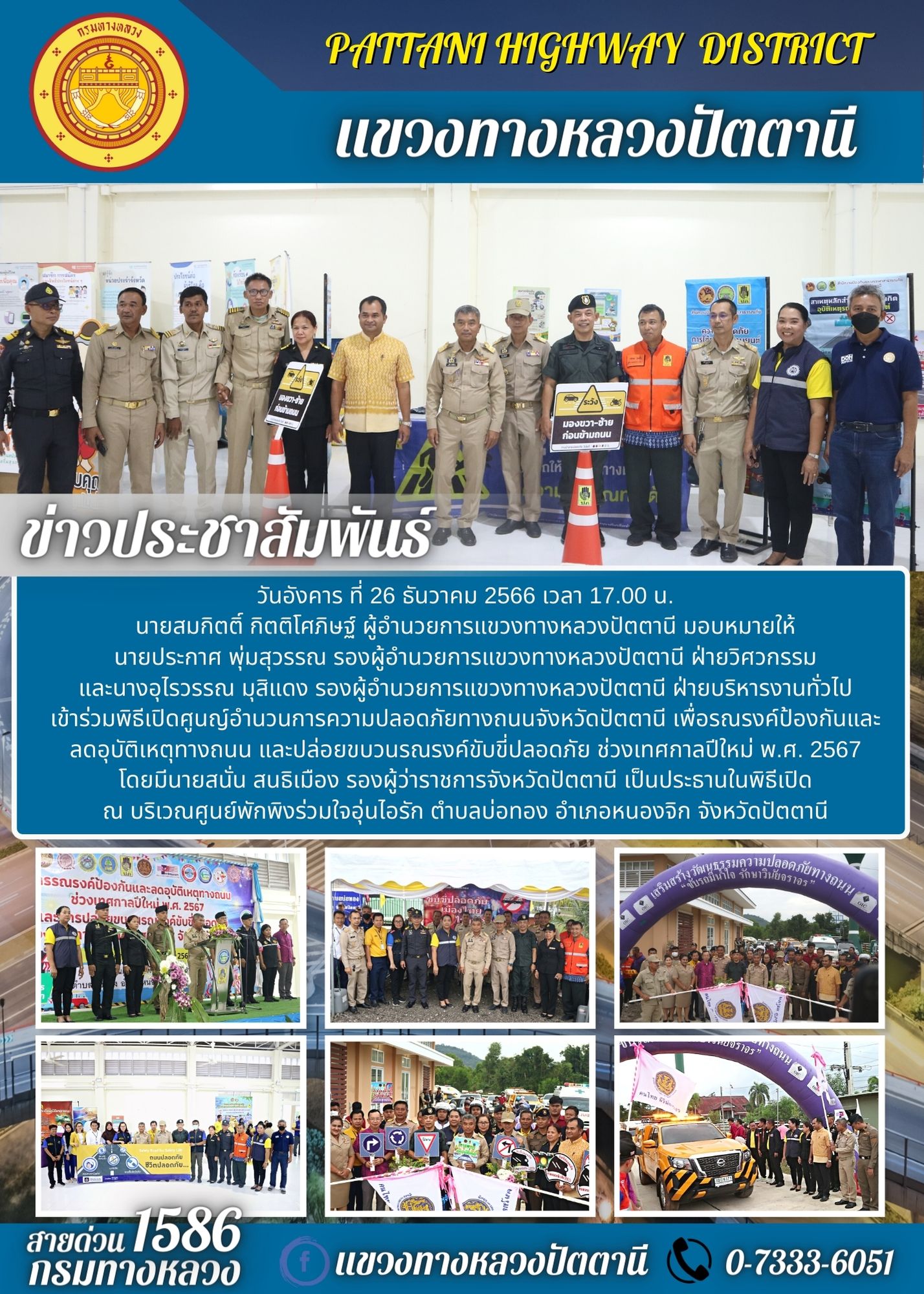 นายประกาศ พุ่มสุวรรณ รองผู้อำนวยการแขวงทางหลวงปัตตานี ฝ่ายวิศวกรรมและนางอุไรวรรณ มุสิแดง รองผู้อำนวยการแขวงทางหลวงปัตตานี ฝ่ายบริหารงานทั่วไป เข้าร่วมพิธีเปิดศูนญ์อำนวนการความปลอดภัยทางถนนจังหวัดปัตตานี เพื่อรณรงค์ป้องกันและลดอุบัติเหตุทางถนน และปล่อยขบวนรณรงค์ขับขี่ปลอดภัย ช่วงเทศกาลปีใหม่ พ.ศ. 2567 โดยมีนายสนั่น สนธิเมือง รองผู้ว่าราชการจังหวัดปัตตานี เป็นประธานในพิธีเปิดณ บริเวณศูนย์พักพิงร่วมใจอุ่นไอรัก ตำบลบ่อทอง อำเภอหนองจิก จังหวัดปัตตานี