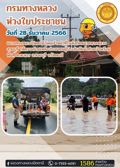 วันที่ 28 ธ.ค. 2566 แขวงทางหลวงปัตตานี โดยเจ้าหน้าที่ในสังกัดหมวดทางหลวงสายบุรี ให้ความช่วยเหลือประชาชนผู้ประสบภัยน้ำท่วมบ้านเรือน พื้นที่ ต.ละหาร อ.สายบุรี จ.ปัตตานี