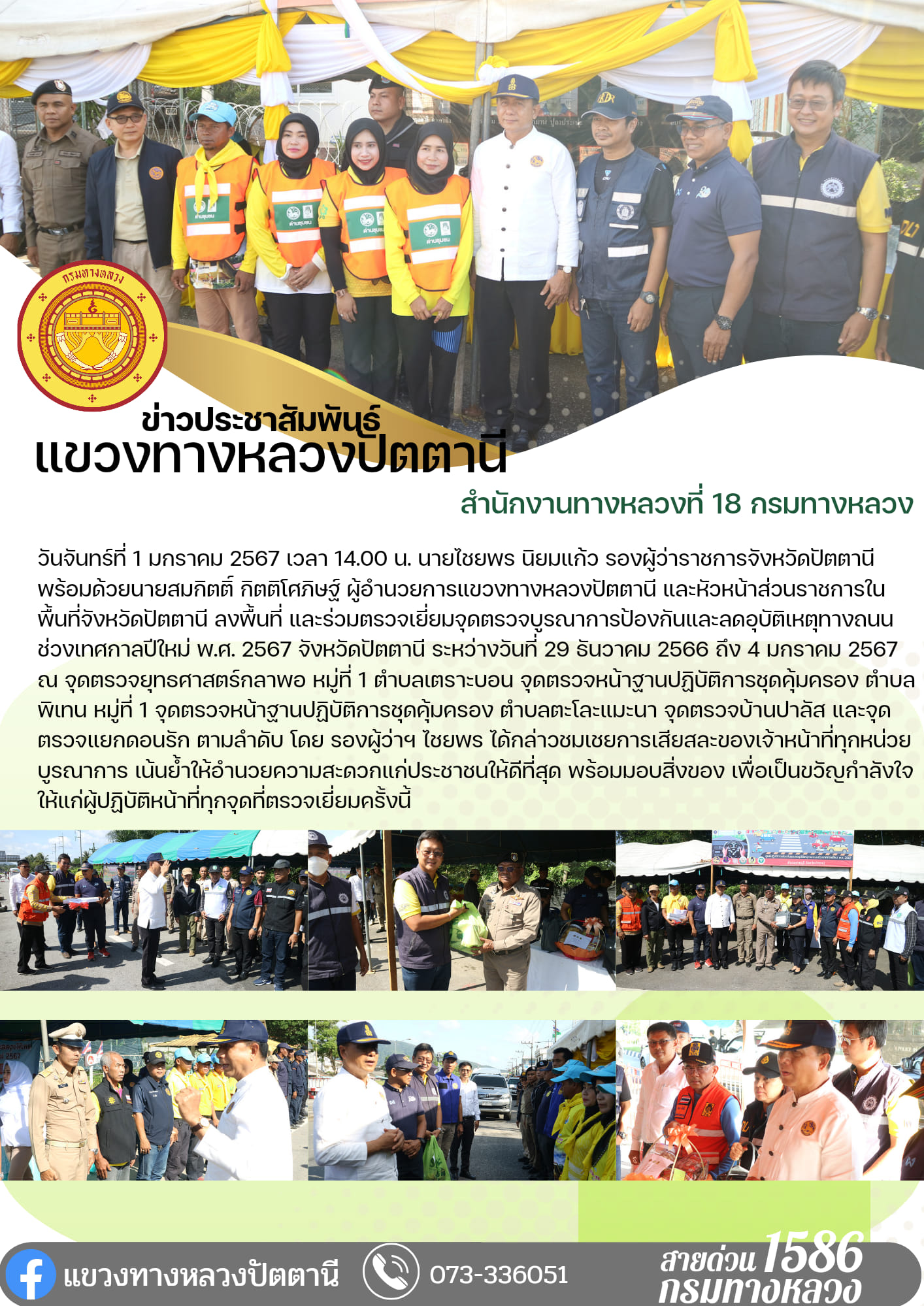วันจันทร์ที่ 1 มกราคม 2567 เวลา 14.00 น. นายไชยพร นิยมแก้ว รองผู้ว่าราชการจังหวัดปัตตานี พร้อมด้วยนายสมกิตติ์ กิตติโศภิษฐ์ ผู้อำนวยการแขวงทางหลวงปัตตานี และหัวหน้าส่วนราชการในพื้นที่จังหวัดปัตตานี ลงพื้นที่ และร่วมตรวจเยี่ยมจุดตรวจบูรณาการป้องกันและลดอุบัติเหตุทางถนน ช่วงเทศกาลปีใหม่ พ.ศ. 2567 จังหวัดปัตตานี ระหว่างวันที่ 29 ธันวาคม 2566 ถึง 4 มกราคม 2567 ณ จุดตรวจยุทธศาสตร์กลาพอ หมู่ที่ 1 ตำบลเตราะบอน จุดตรวจหน้าฐานปฏิบัติการชุดคุ้มครอง ตำบลพิเทน หมู่ที่ 1 จุดตรวจหน้าฐานปฏิบัติการชุดคุ้มครอง ตำบลตะโละแมะนา จุดตรวจบ้านปาลัส และจุดตรวจแยกดอนรัก ตามลำดับ โดย รองผู้ว่าฯ ไชยพร ได้กล่าวชมเชยการเสียสละของเจ้าหน้าที่ทุกหน่วยบูรณาการ เน้นย้ำให้อำนวยความสะดวกแก่ประชาชนให้ดีที่สุด พร้อมมอบสิ่งของ เพื่อเป็นขวัญกำลังใจ ให้แก่ผู้ปฏิบัติหน้าที่ทุกจุดที่ตรวจเยี่ยมครั้งนี้