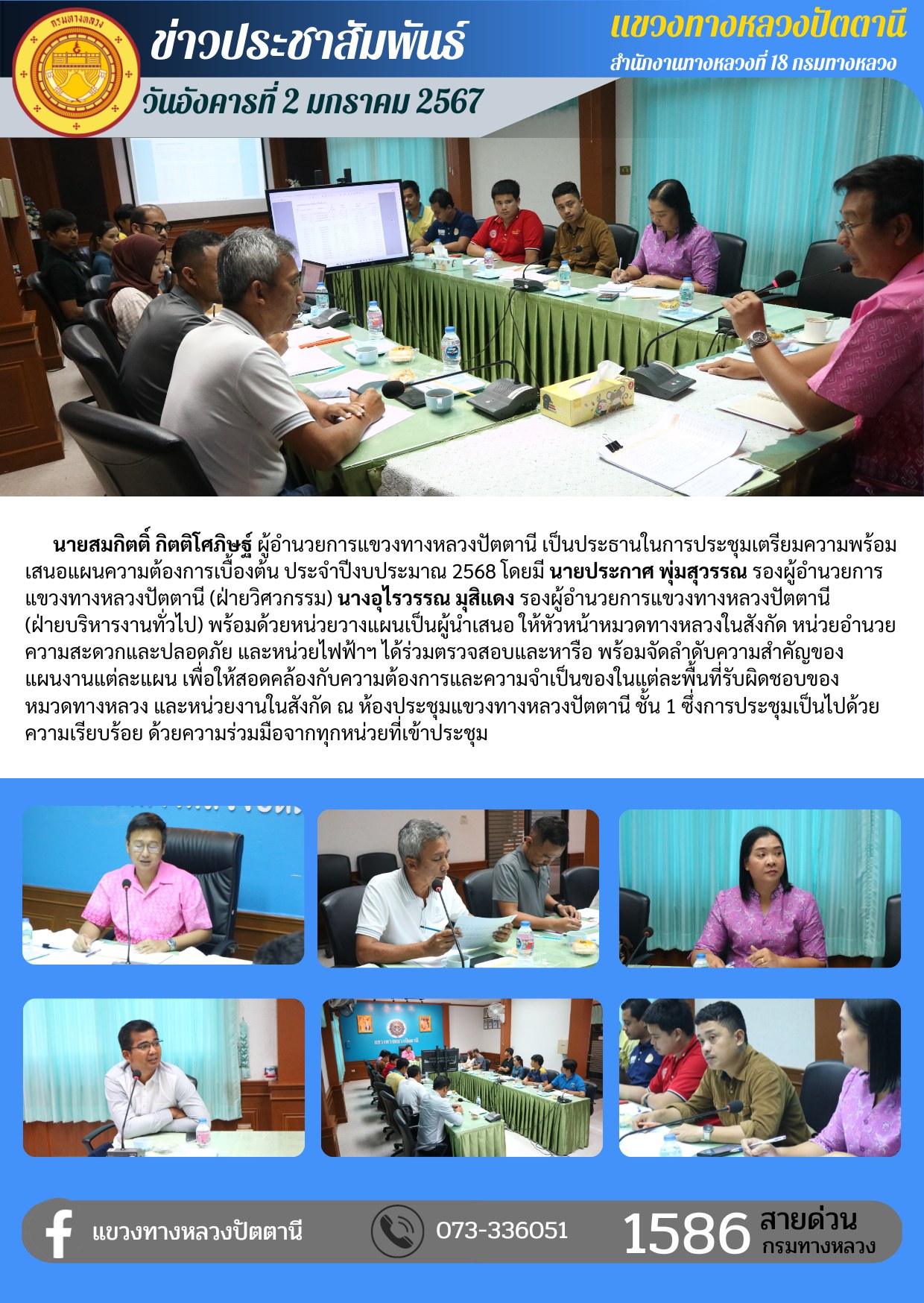 วันอังคารที่ 2 มกราคม 2567 เวลา 10.00 น. นายสมกิตติ์ กิตติโศภิษฐ์ ผู้อำนวยการแขวงทางหลวงปัตตานี เป็นประธานในการประชุมเตรียมความพร้อมเสนอแผนความต้องการเบื้องต้น ประจำปีงบประมาณ 2568 โดยมี นายประกาศ พุ่มสุวรรณ รองผู้อำนวยการแขวงทางหลวงปัตตานี (ฝ่ายวิศวกรรม) นางอุไรวรรณ มุสิแดง รองผู้อำนวยการแขวงทางหลวงปัตตานี (ฝ่ายบริหารงานทั่วไป) พร้อมด้วยหน่วยวางแผนเป็นผู้นำเสนอ ให้หัวหน้าหมวดทางหลวงในสังกัด หน่วยอำนวยความสะดวกและปลอดภัย และหน่วยไฟฟ้าฯ ได้ร่วมตรวจสอบและหารือ พร้อมจัดลำดับความสำคัญของแผนงานแต่ละแผน เพื่อให้สอดคล้องกับความต้องการและความจำเป็นของในแต่ละพื้นที่รับผิดชอบของหมวดทางหลวง และหน่วยงานในสังกัด ณ ห้องประชุมแขวงทางหลวงปัตตานี ชั้น 1 ซึ่งการประชุมเป็นไปด้วยความเรียบร้อย ด้วยความร่วมมือจากทุกหน่วยที่เข้าประชุม