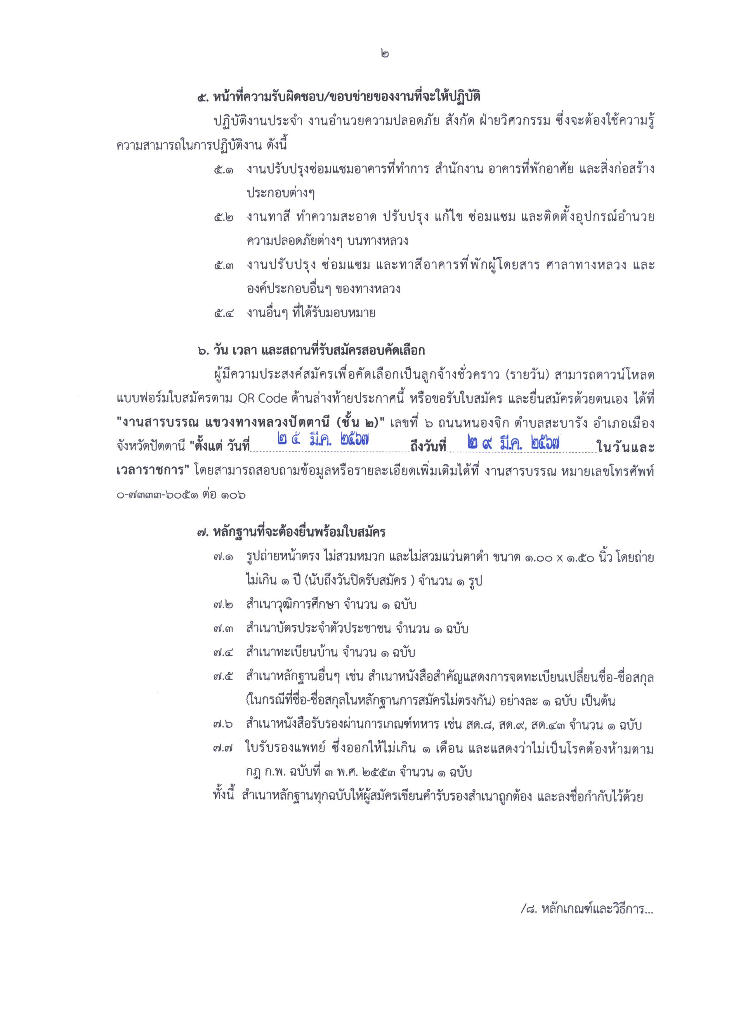 แขวงทางหลวงปัตตานี เปิดรับสมัครบุคคล ตำแหน่งคนงาน ลูกจ้างชั่วคราว (รายวัน) ปฏิบัติงานประจำ งานอำนวยความปลอดภัย จำนวน 4 อัตรา