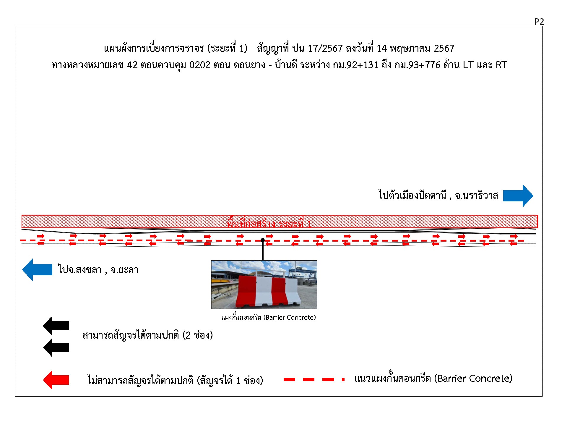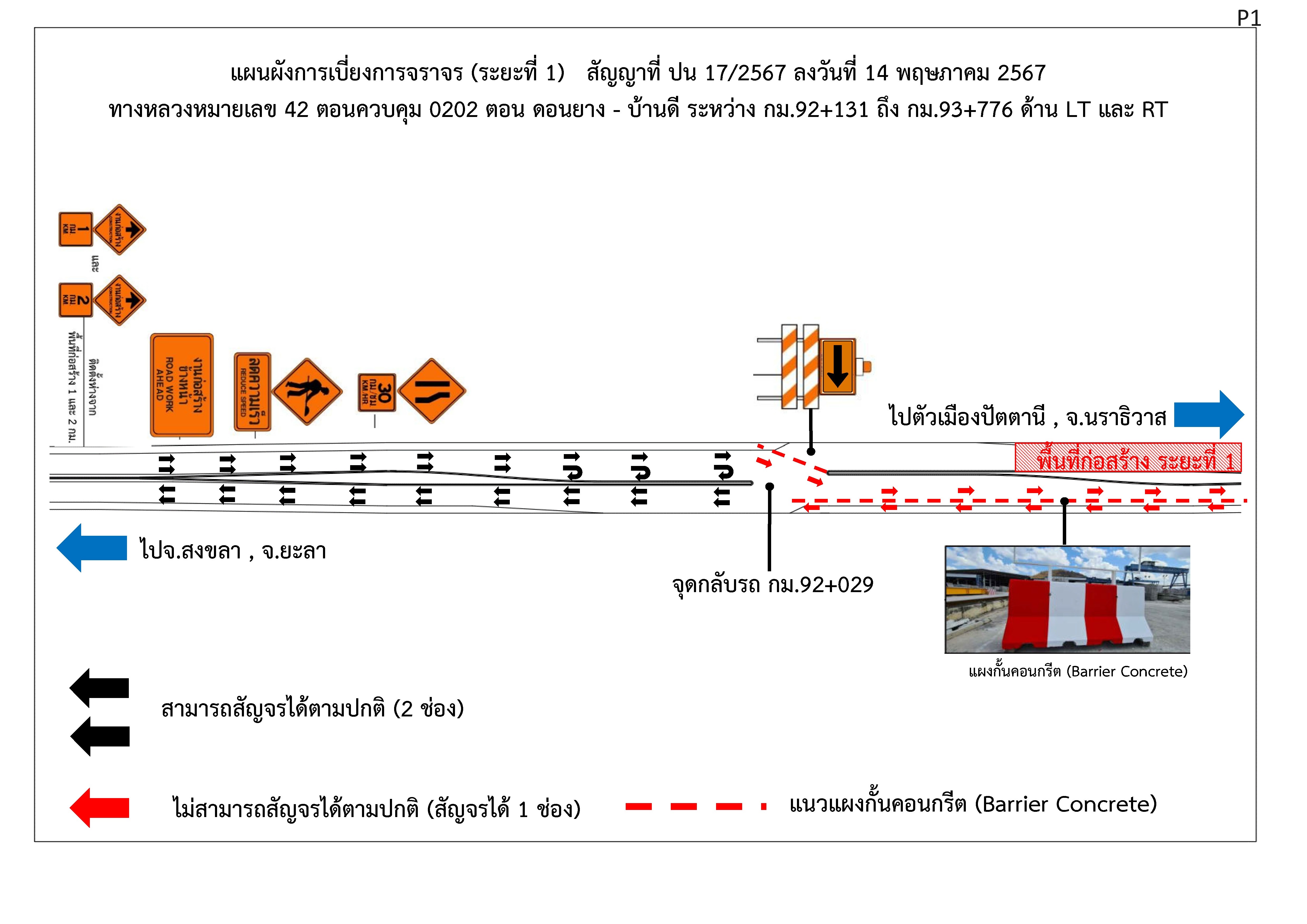 2. สำหรับผู้ที่เดินทางมาจากตัวเมืองปัตตานี และ จ.นราธิวาส บนทางหลวงหมายเลข 42 ฝั่งขาไป จ.สงขลา และ จ.ยะลา โปรดระมัดระวัง เนื่องจากมีการเบี่ยงการจราจร ที่บริเวณจุดกลับรถ กม.93+025 จาก 2 ช่องจราจรเหลือเพียง 1 ช่องจราจร ให้รถวิ่งสวนทาง เป็นระยะทาง 996 ม. โดยมีการติดตั้งอุปกรณ์แบ่งช่องจราจรไว้ตลอดแนว จนถึงที่บริเวณจุดกลับรถ กม.92+029 ก็สามารถวิ่งได้ปกติ 2 ช่องจราจร