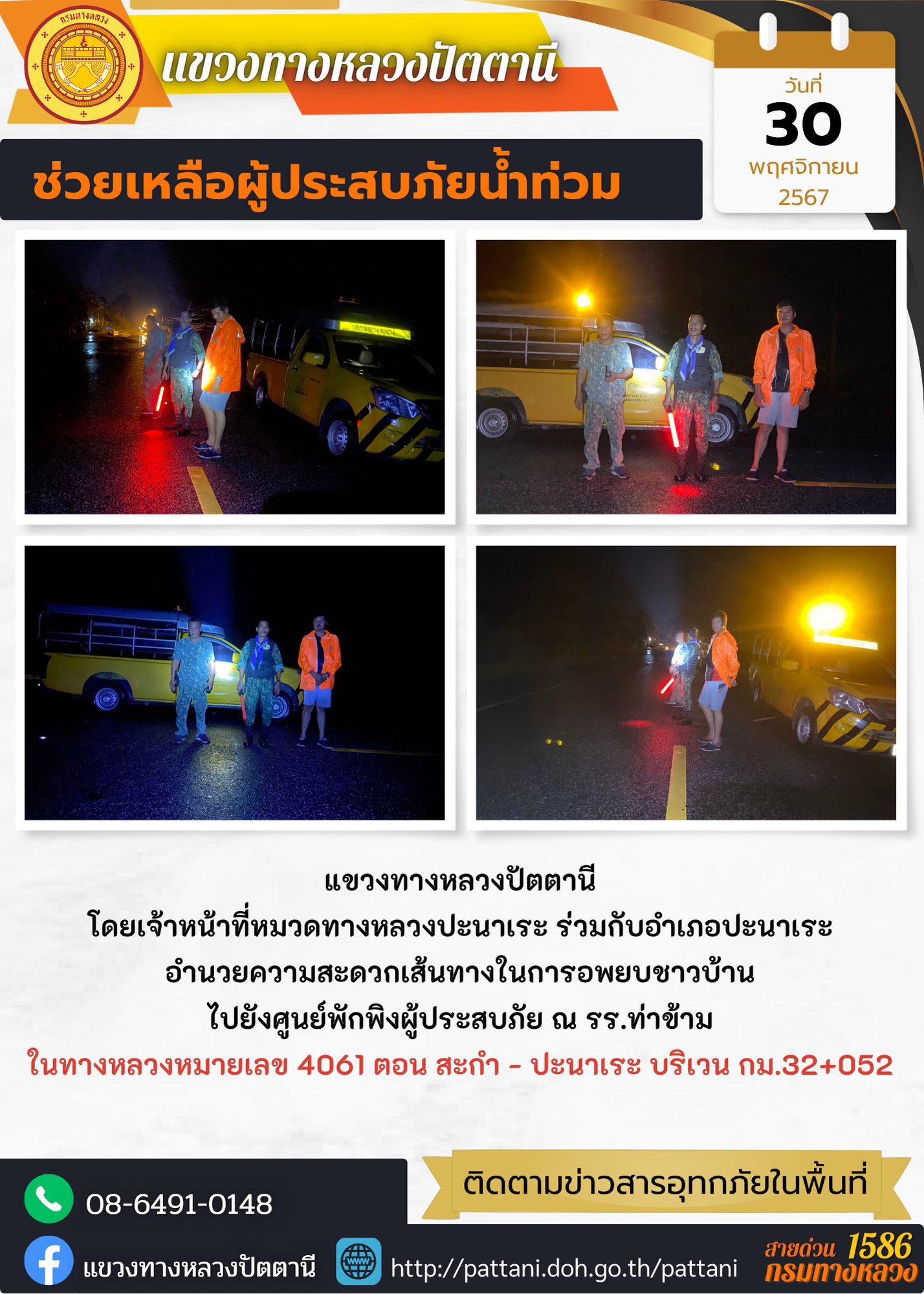 แขวงทางหลวงปัตตานี โดยเจ้าหน้าที่หมวดทางหลวงปะนาเระร่วมกับอำเภอปะนาเระอำนวยความสะดวกเส้นทางในการอพยบชาวบ้านไปยังศูนย์พักพิงผู้ประสบภัย ณ รร.ท่าข้าม ในทางหลวงหมายเลข 4061 ตอน สะกำ - ปะนาเระ บริเวน กม.32+052