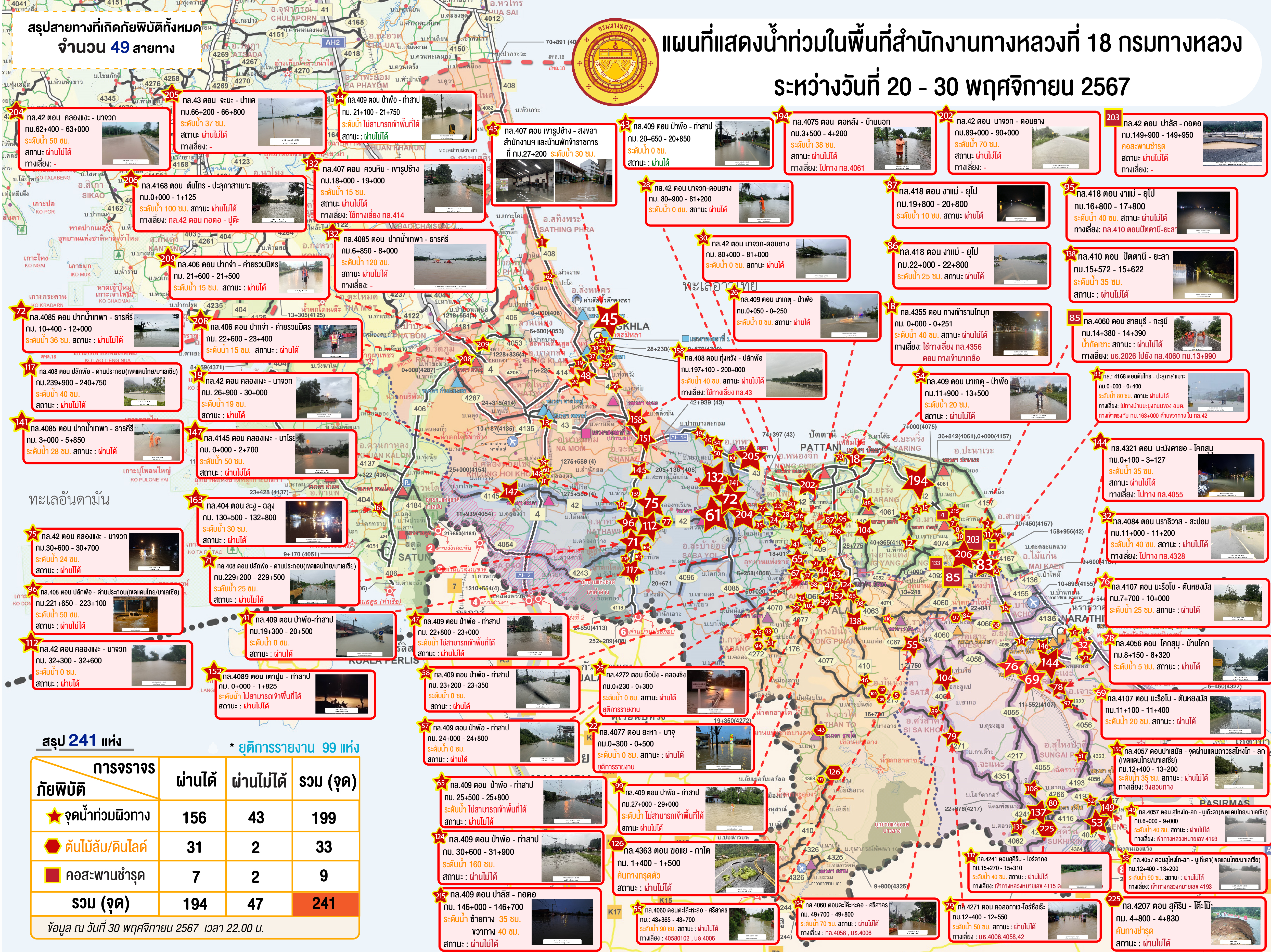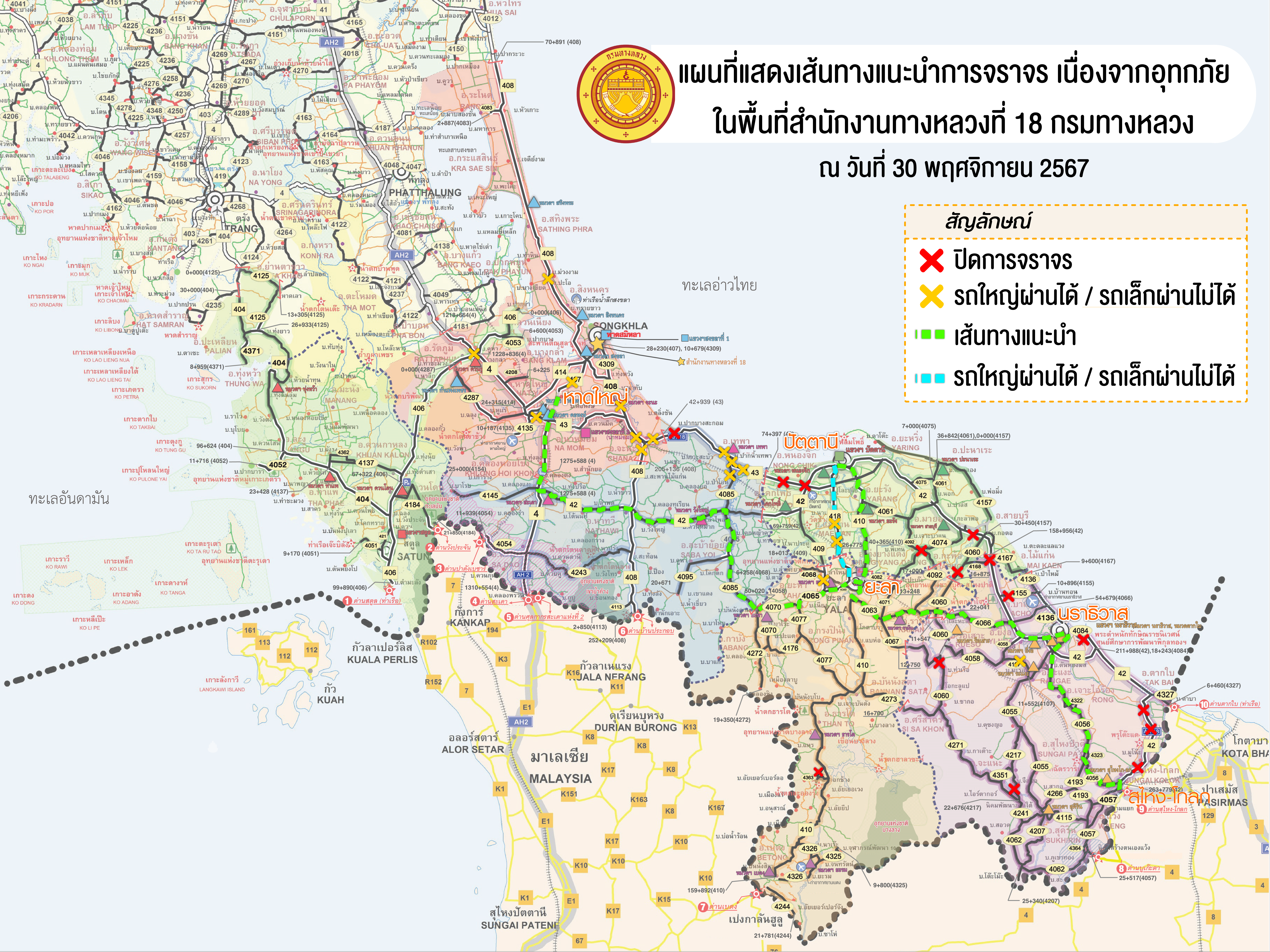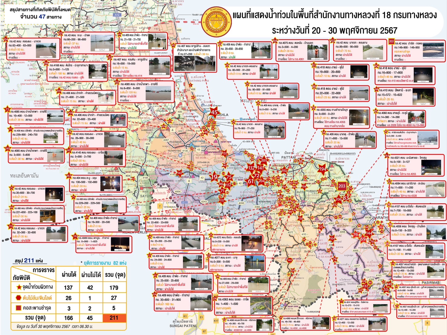 แขวงทางหลวงนราธิวาส ขอรายงานสถานการณ์อุทกภัยในพื้นที่จังหวัดนราธิวาส วันเวลาที่ update วันที่ 30 พ.ย. 67 เวลา 16.00 น.