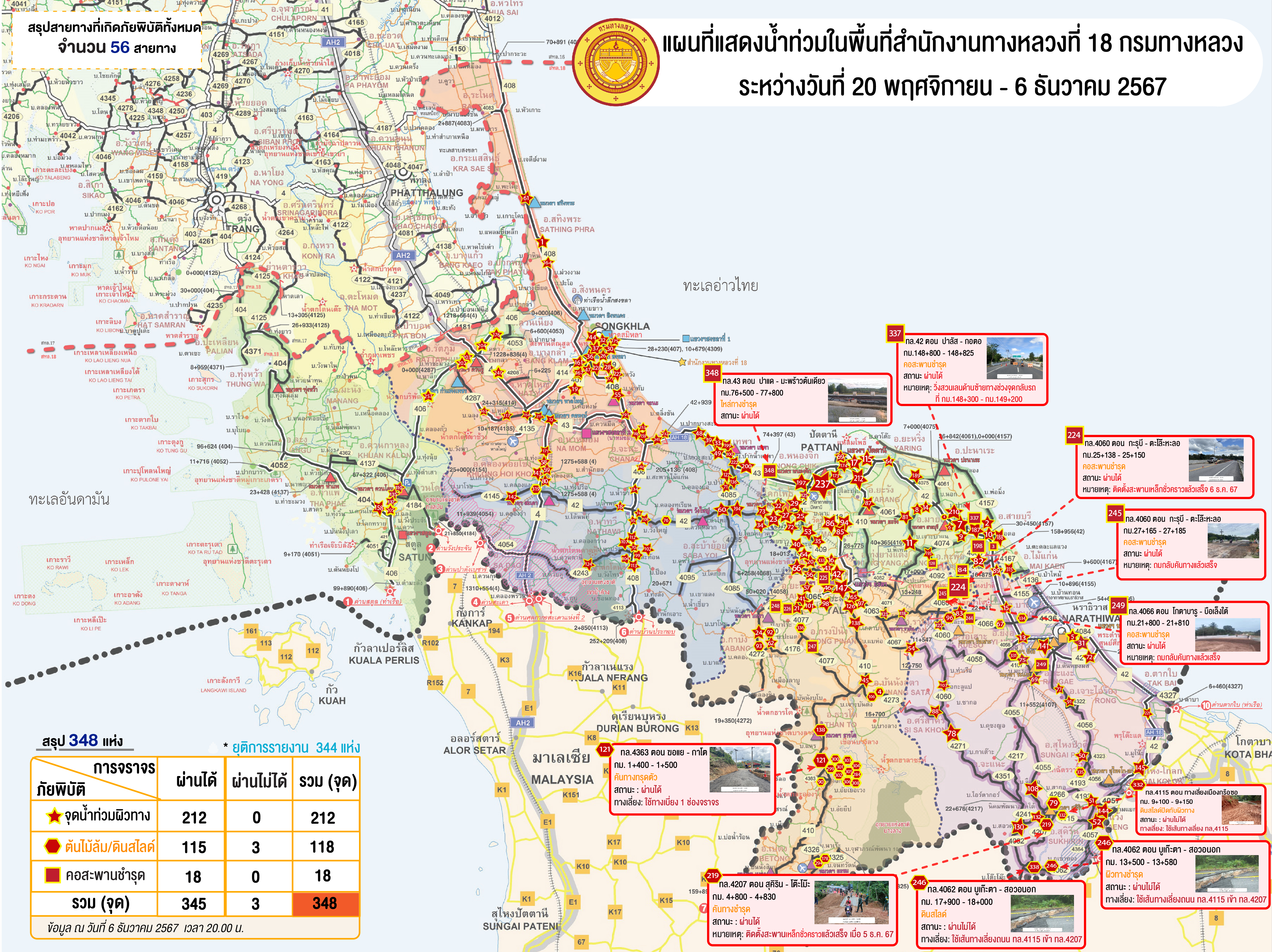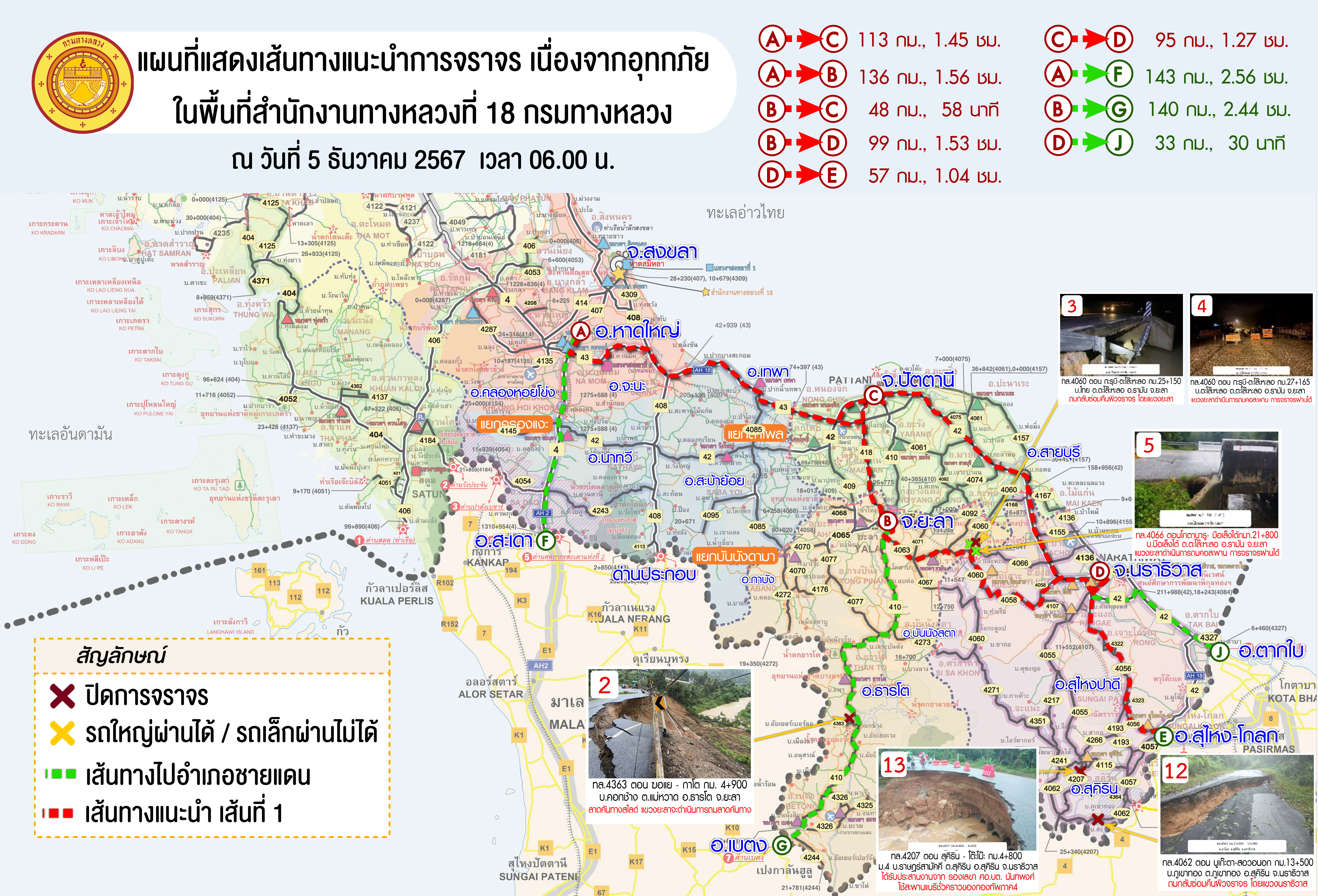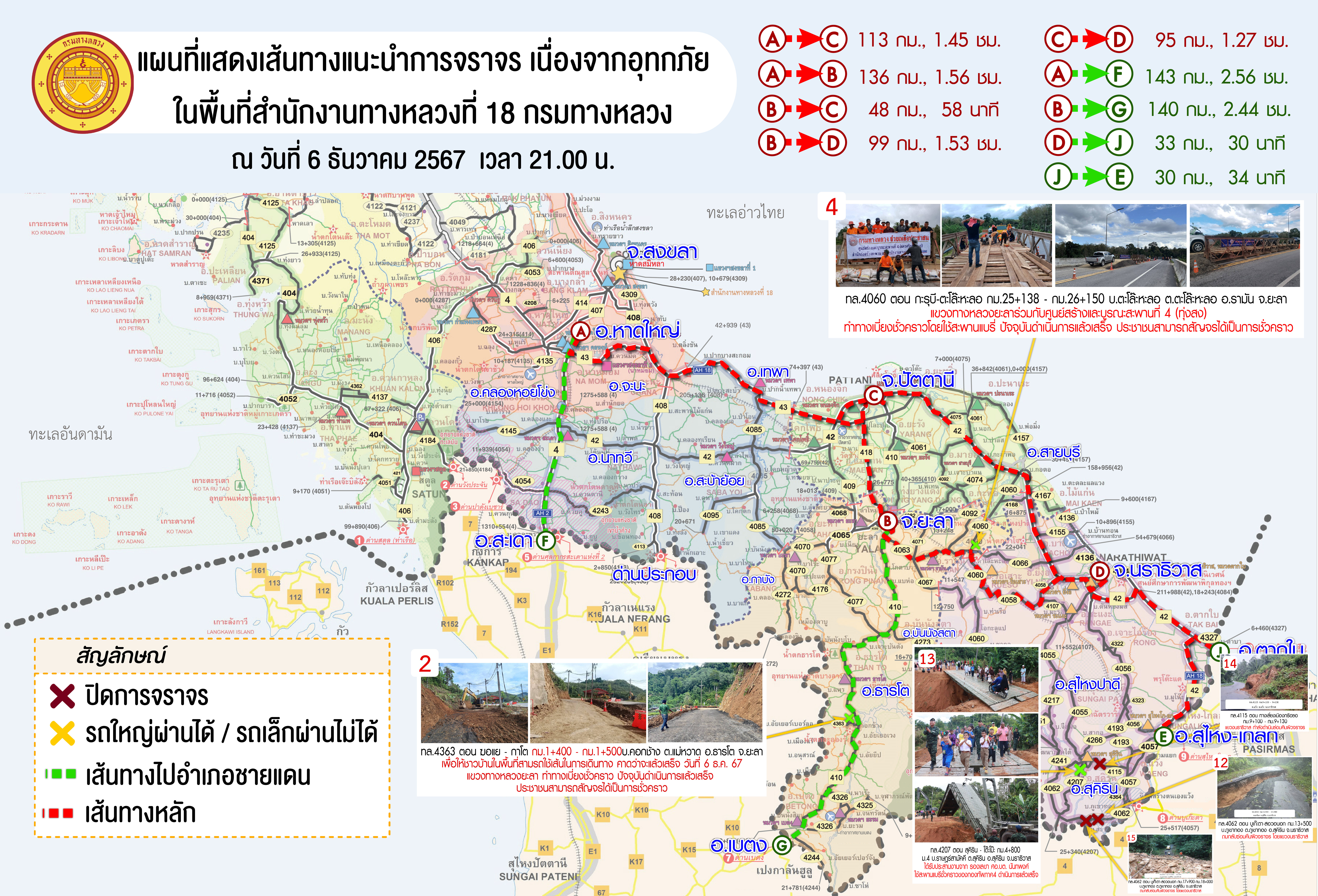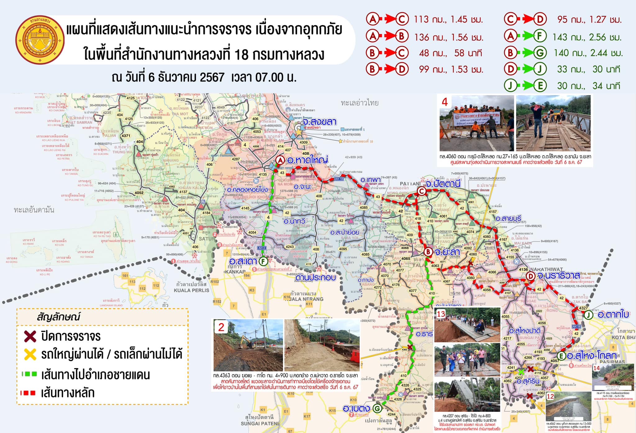 แผนที่แสดงเส้นทางแนะนำการจราจร เนื่องจากอุทกภัยในพื้นที่สำนักงานทางหลวงที่ 18 ข้อมูล ณ วันที่ 6 ธันวาคม 2567 เวลา 07.00 น.