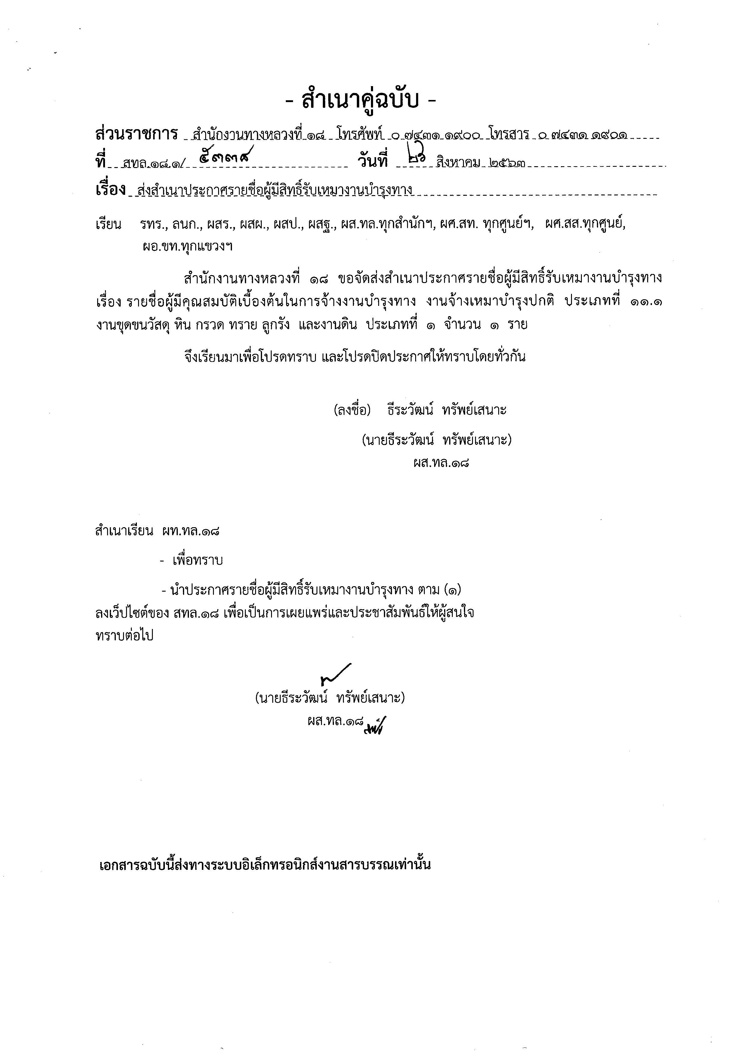 ประกาศรายชื่อผู้มีสิทธิ์รับเหมางานบำรุงทาง ประเภทที่ 11.1 งานขุดขนวัสดุ หิน กรวด ทราย ลูกรัง และงานดิน ประเภทที่ 1