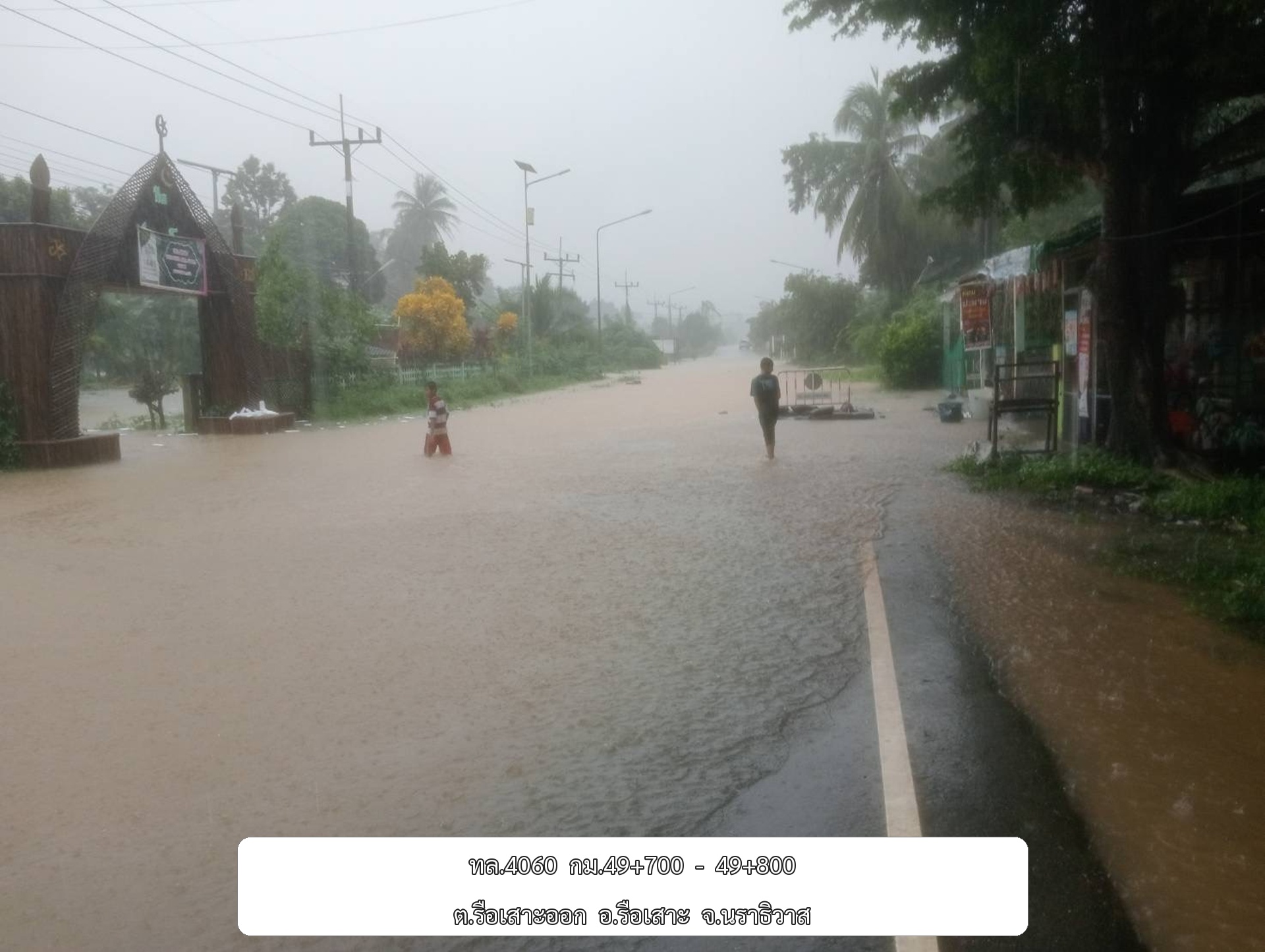 วันที่ 27 พฤศจิกายน 2567 เวลา 11.05 น. รายงานสถานการณ์น้ำท่วม หมายเลขทางหลวง 4060 ตอน ตะโล๊ะหะลอ - ศรีสาคร ช่วง กม. 49+700 ถึง 49+800 เนื่องจากฝนตกหนักน้ำไหลผ่านอย่างรวดเร็วทำให้เกิดน้ำท่วมถนน ปริมาณระดับน้ำ 60 เซ็นติเมตร การจราจรไม่สามารถผ่านได้ ทั้งนี้ แขวงทางหลวงนราธิวาส ได้ดำเนินการติดตั้งป้ายเตือนจราจรผู้ใช้เส้นทาง เพื่ออำนวยความสะดวก