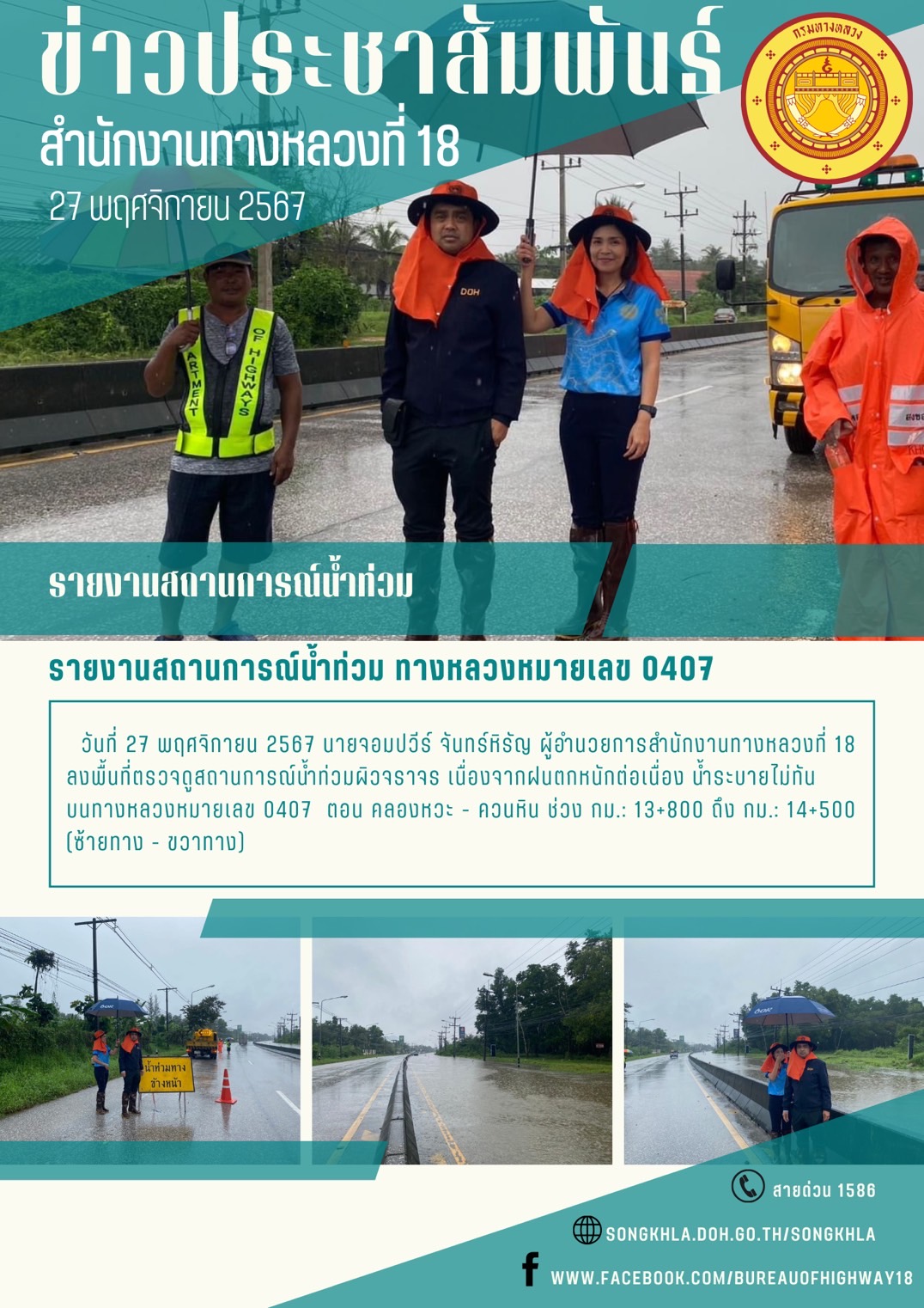 วันที่ 27 พฤศจิกายน 2567 นายจอมปวีร์ จันทร์หิรัญ ผู้อำนวยการสำนักงานทางหลวงที่ 18 ลงพื้นที่ตรวจดูสถานการณ์น้ำท่วมผิวจราจร เนื่องจากฝนตกหนักต่อเนื่อง น้ำระบายไม่ทัน บนทางหลวงหมายเลข 0407 ตอน คลองหวะ - ควนหิน ช่วง กม.: 13+800 ถึง กม.: 14+500 (ซ้ายทาง - ขวาทาง)