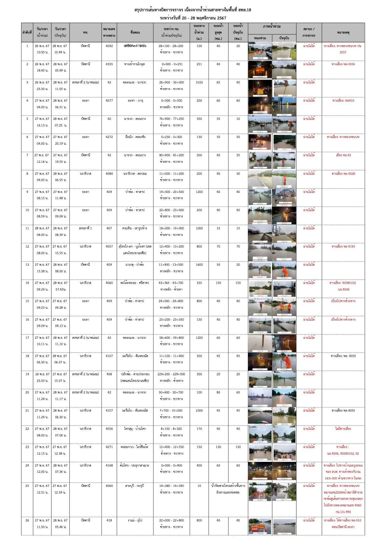 แผนที่แสดงเส้นทางปิดการจราจร เนื่องจากน้ำท่วม ในพื้นที่สำนักงานทางหลวงที่ 18 ระหว่างวันที่ 20-28 พฤศจิกายน 2567