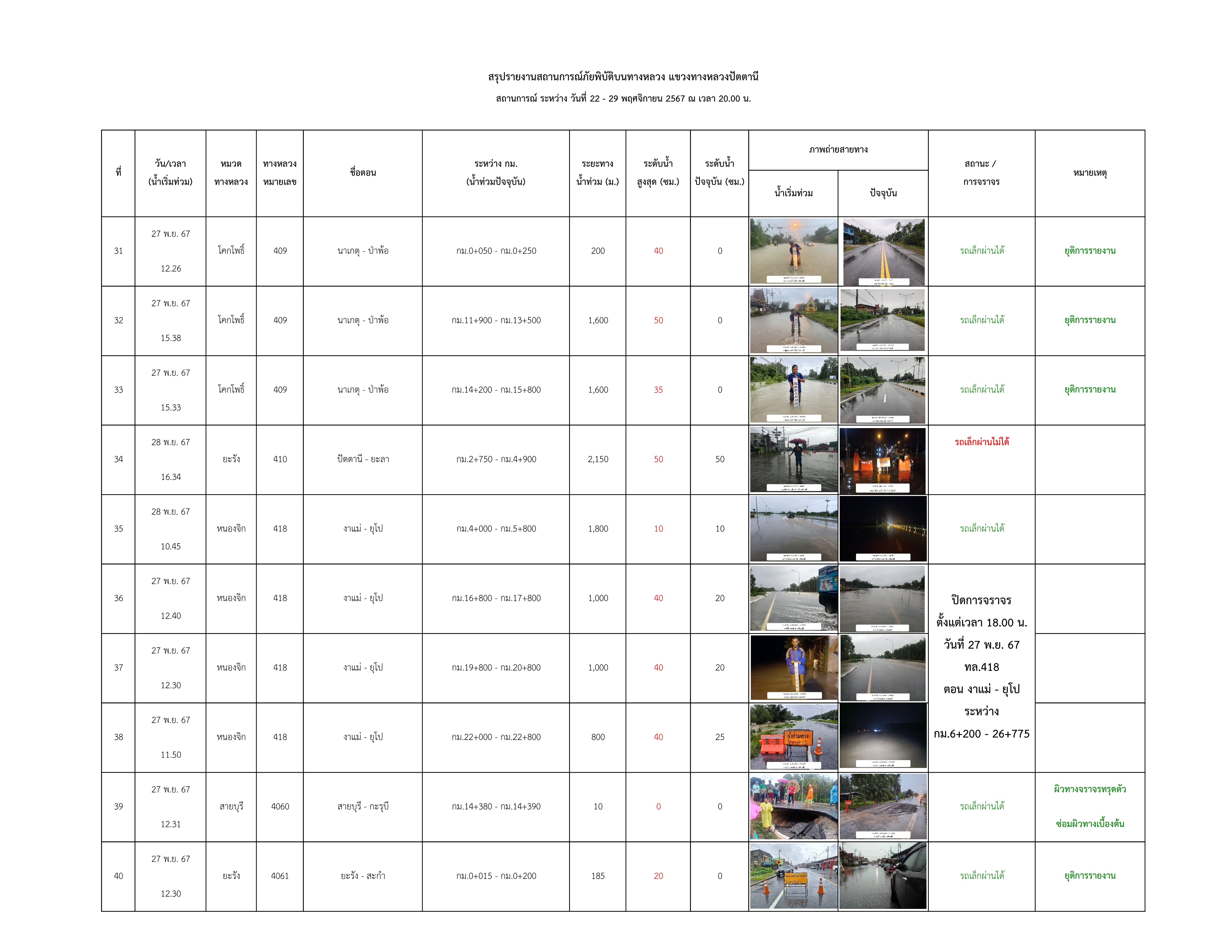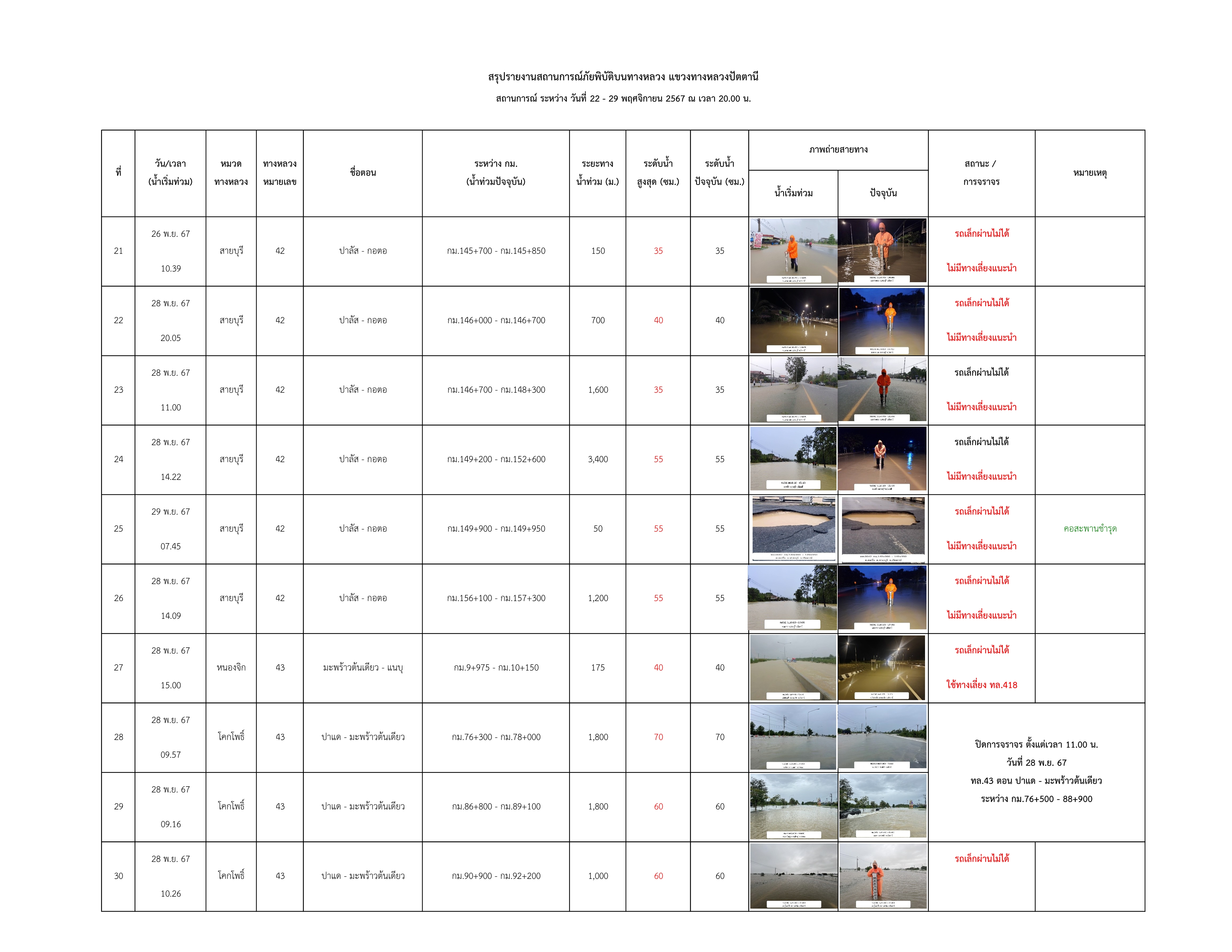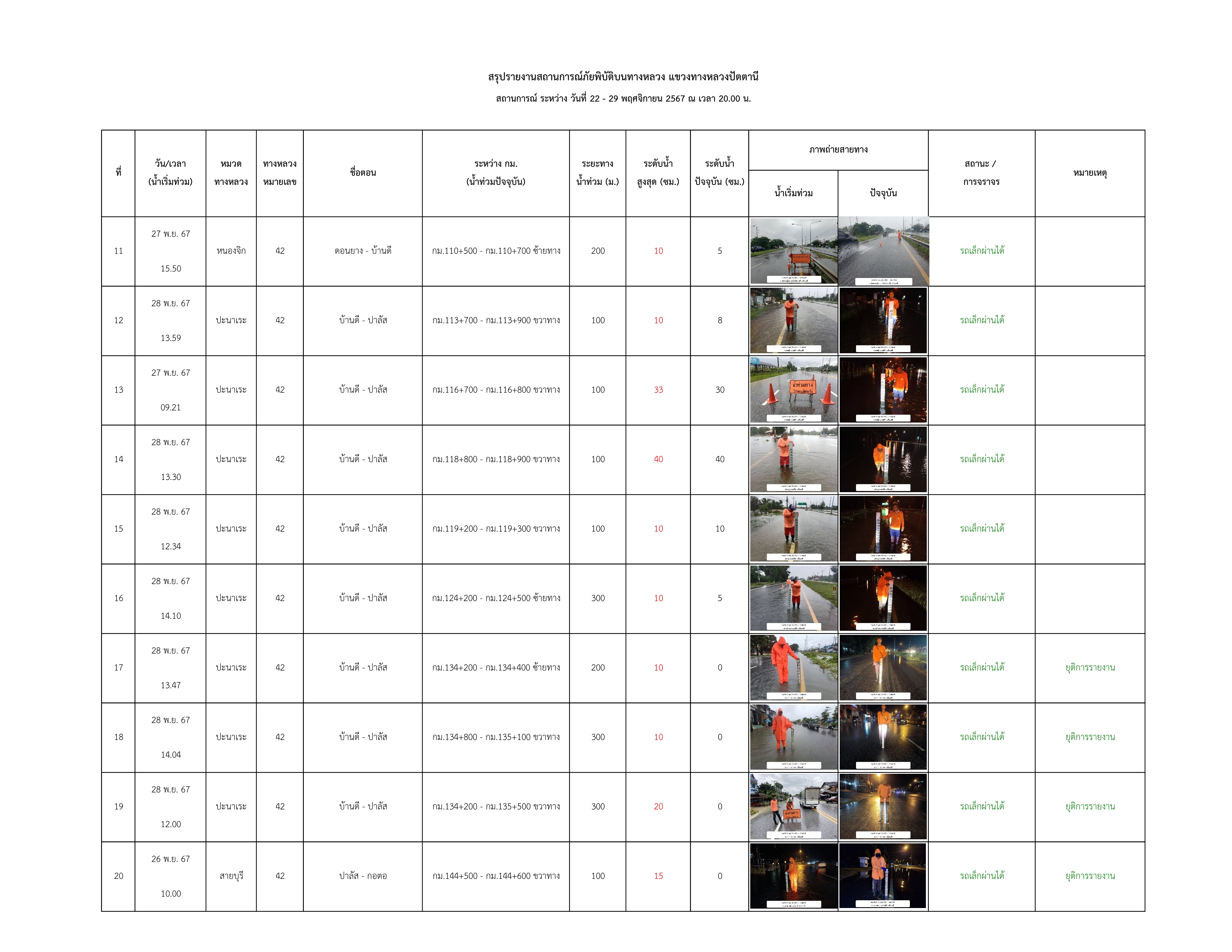 รายงานสถานการณ์น้ำท่วมในพื้นที่แขวงทางหลวงปัตตานี ข้อมูล ณ วันที่ 29 พฤศจิกายน 2567 เวลา 20.00 น.
