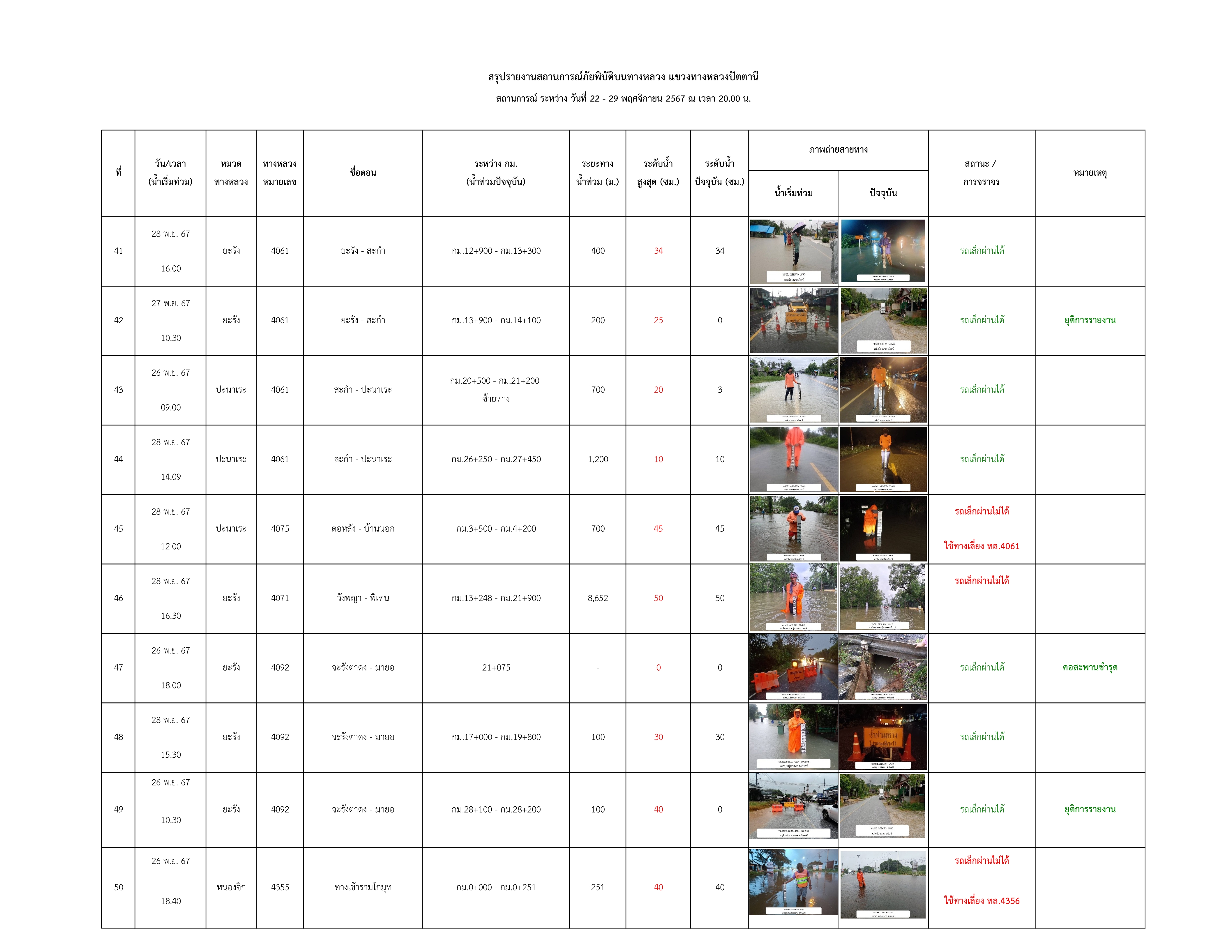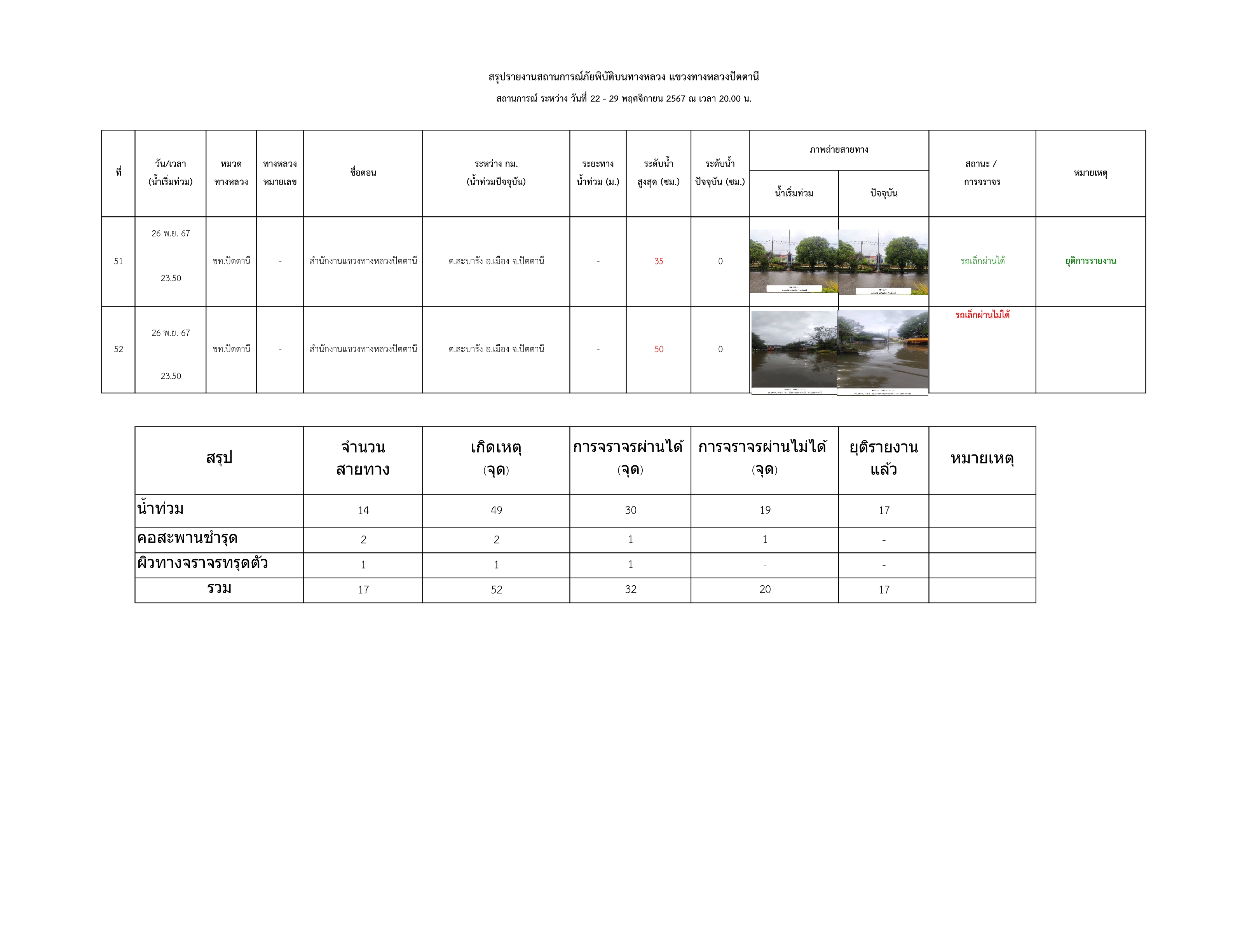 รายงานสถานการณ์น้ำท่วมในพื้นที่แขวงทางหลวงปัตตานี