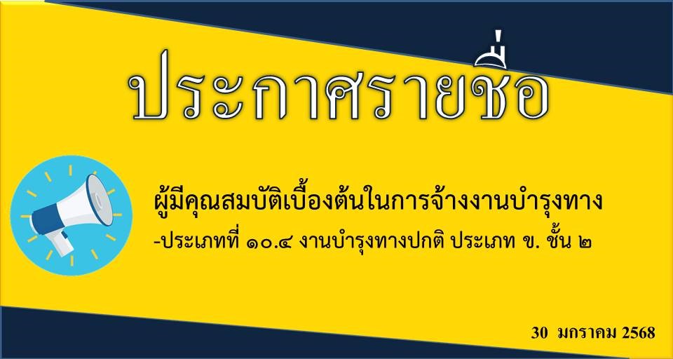 ข้อมูลข่าว : ประกาศรายชื่อ ผู้มีคุณสมบัติเบื้องต้นในการจ้างงานบำรุงทาง -ประเภทที่ 10.4 งานบำรุงทางปกติ ประเภท ข. ชั้น 2